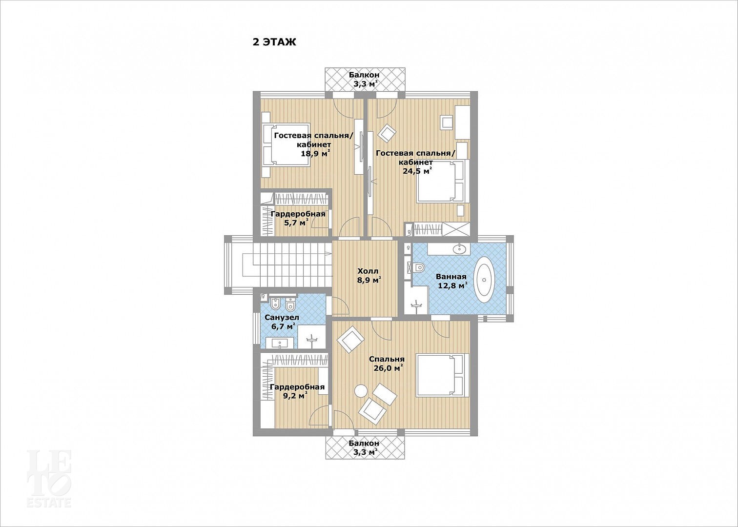 Второй этаж: мастер-спальня с гардеробной, ванной комнатой и балконом, спальня с гардеробной и выходом на балкон, спальня с выходом на балкон, санузел.
