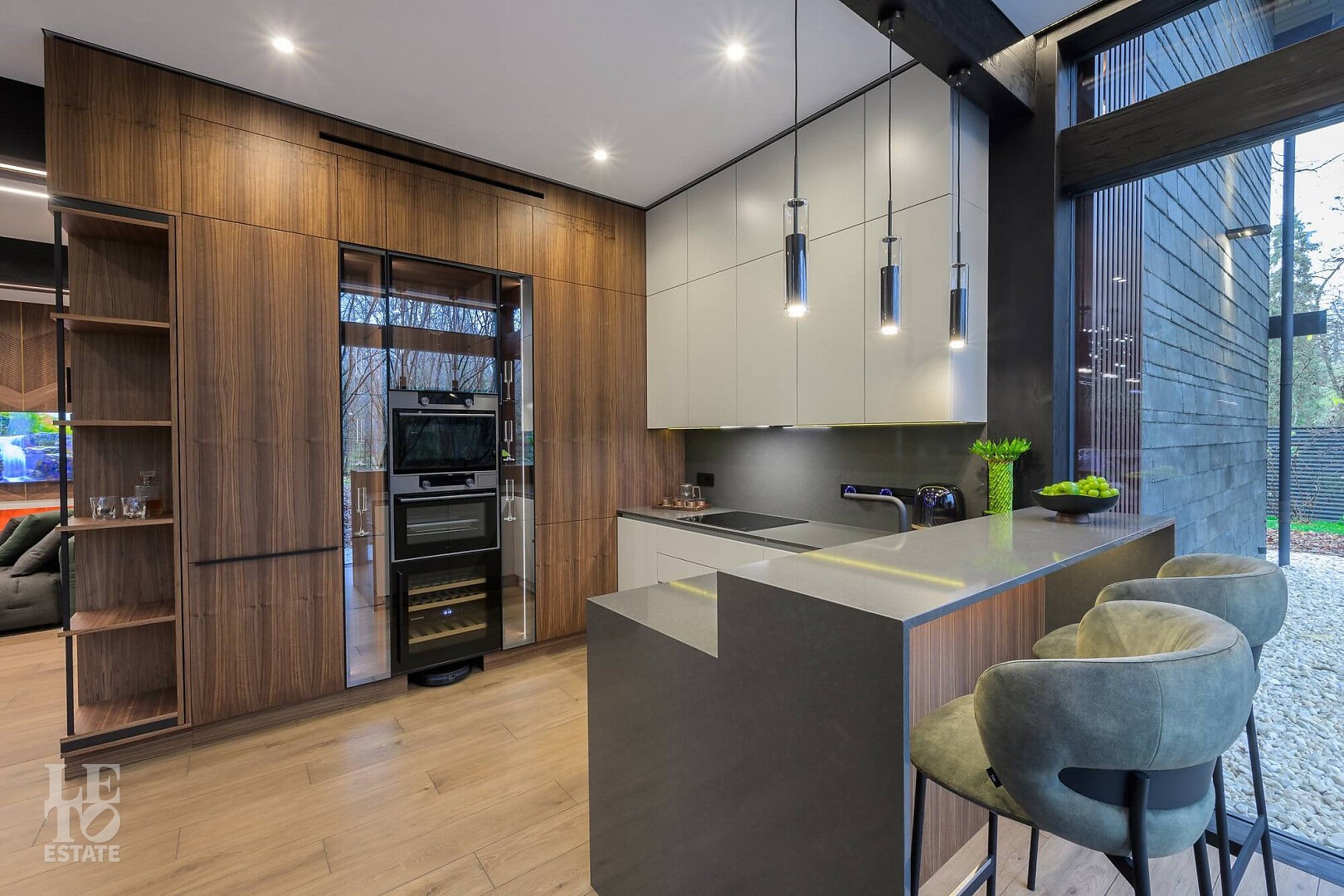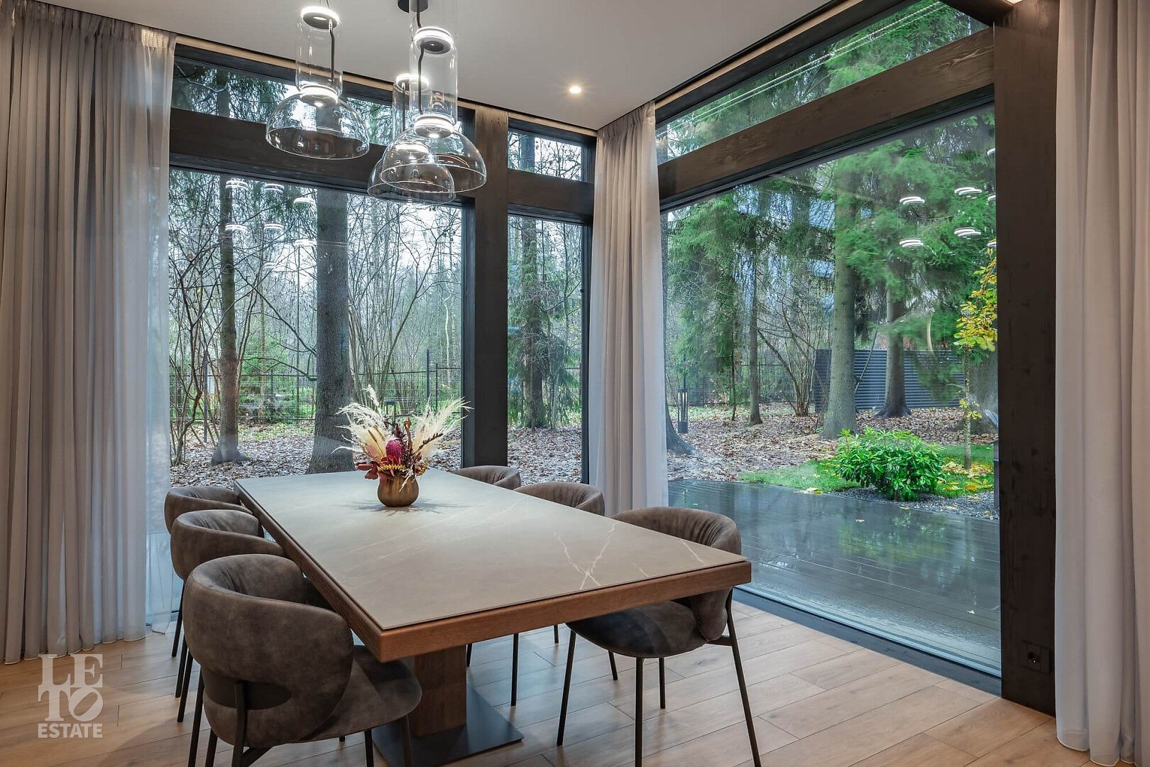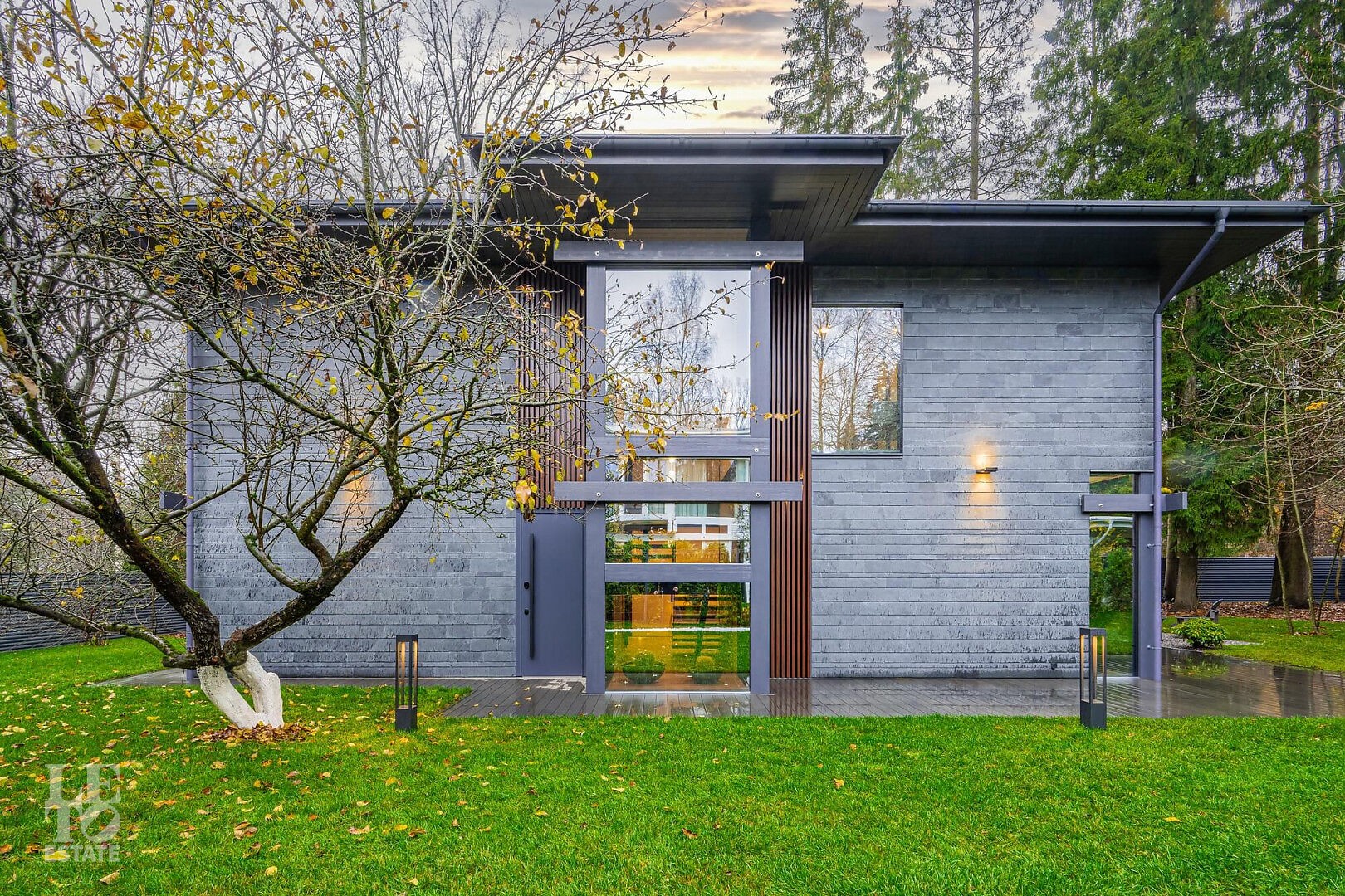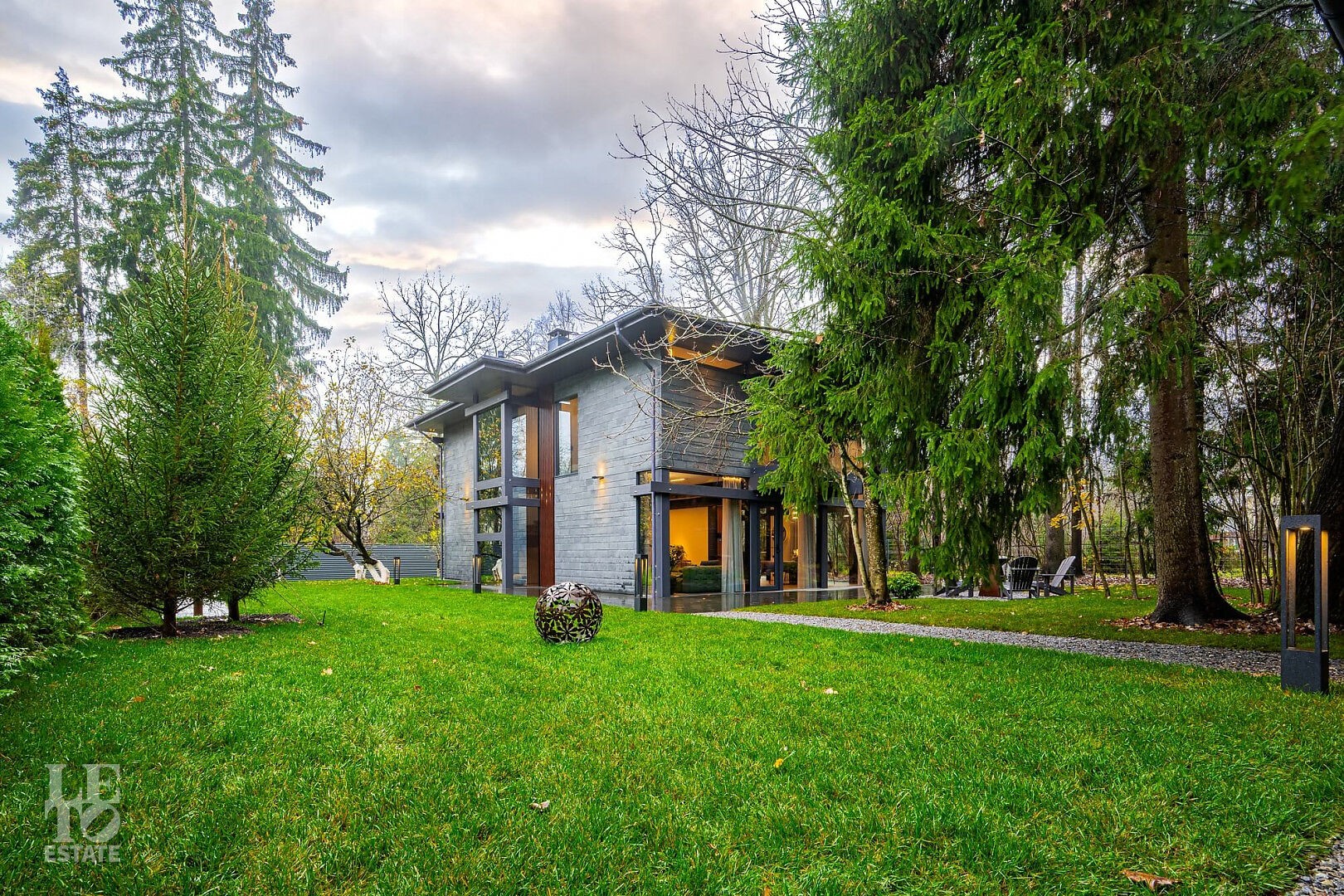 Дом в стиле “изысканный минимализм” оформлен в приглушенных серых оттенках, неяркая глубокая изумрудная зелень в игре света хрустальных аксессуаров, в бархате обивки дивана, благородной росписи стен поддерживается богатым природным ландшафтом за панорамными окнами. Каждая деталь интерьера ощущается качественной и продуманной. Благородные деревянные панели, мягкий текстиль, натуральный камень — все это располагает к