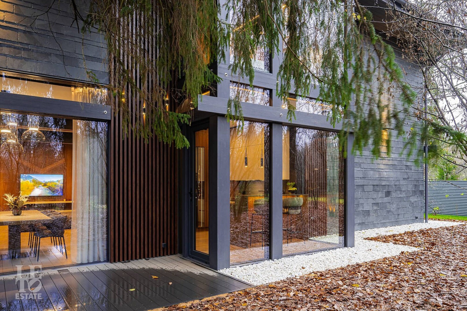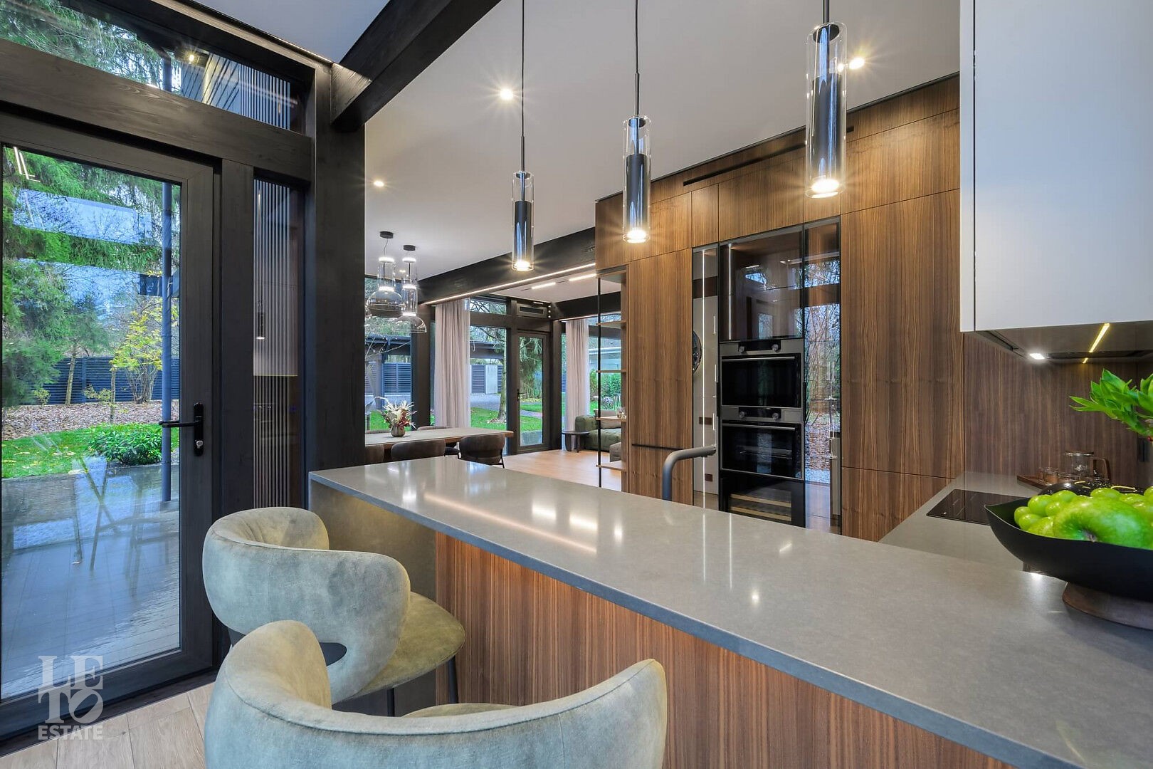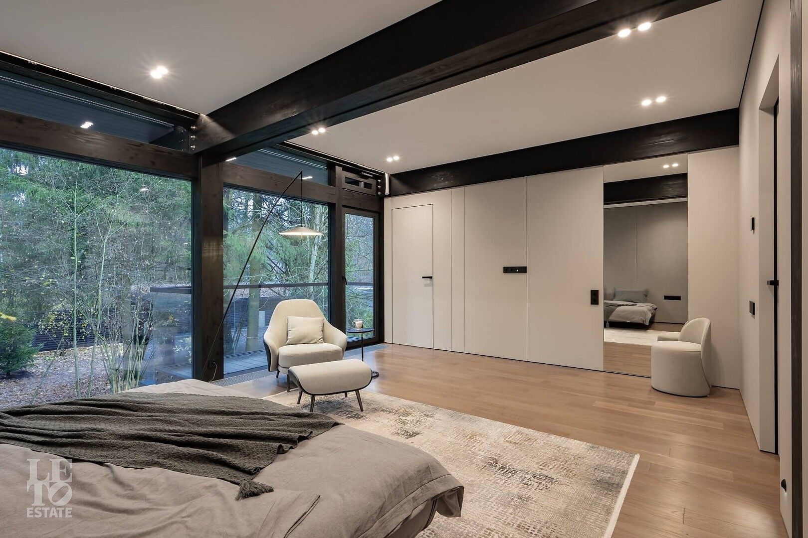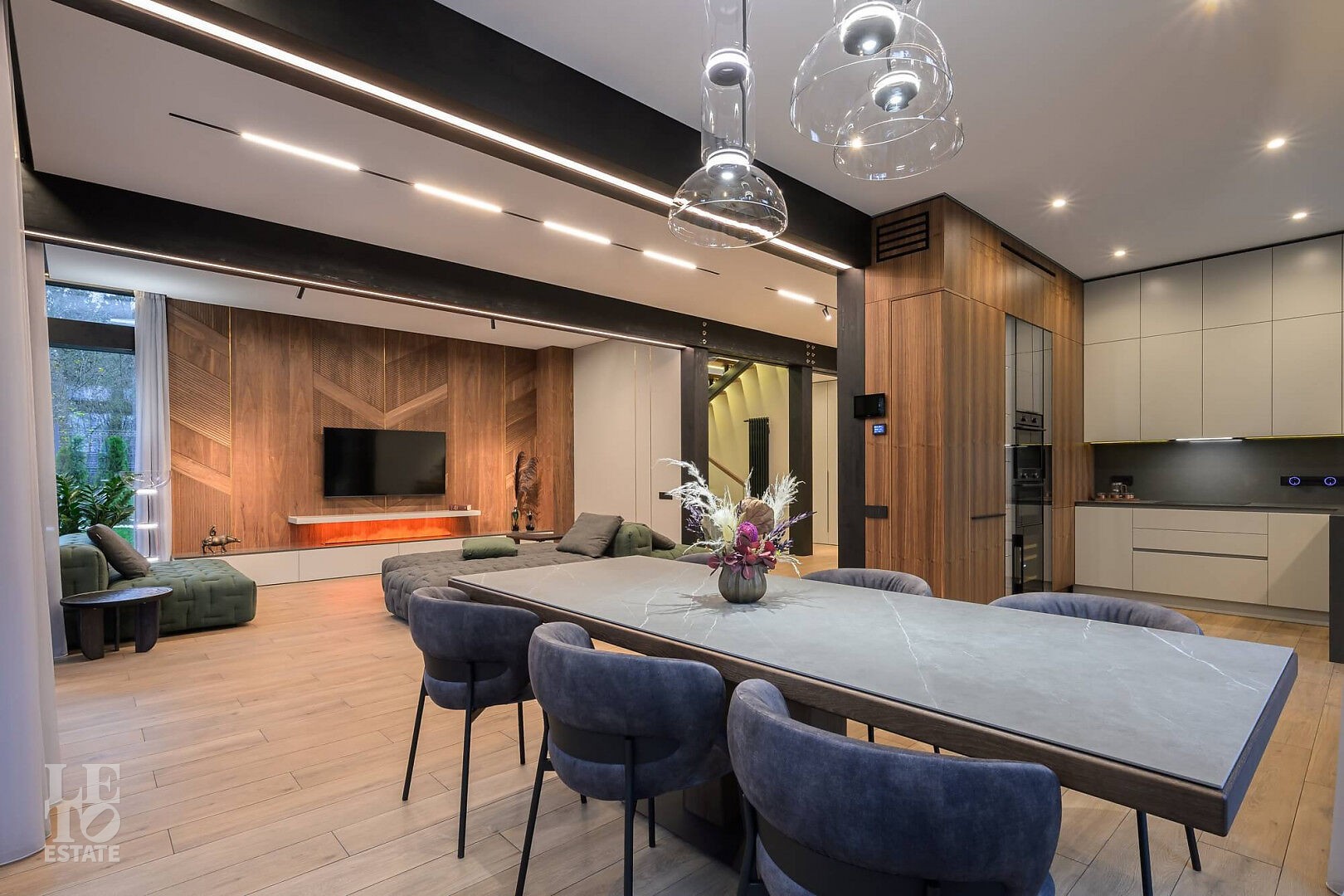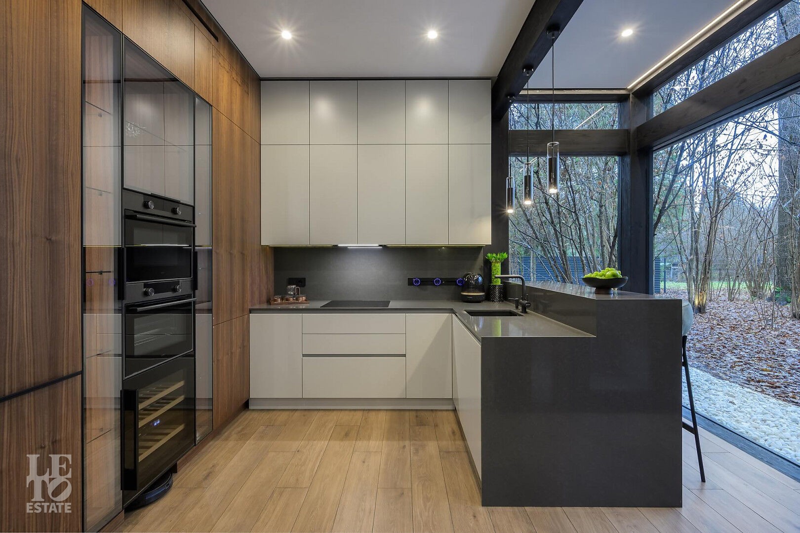 Дом в стиле “изысканный минимализм” оформлен в приглушенных серых оттенках, неяркая глубокая изумрудная зелень в игре света хрустальных аксессуаров, в бархате обивки дивана, благородной росписи стен поддерживается богатым природным ландшафтом за панорамными окнами. Каждая деталь интерьера ощущается качественной и продуманной. Благородные деревянные панели, мягкий текстиль, натуральный камень — все это располагает к