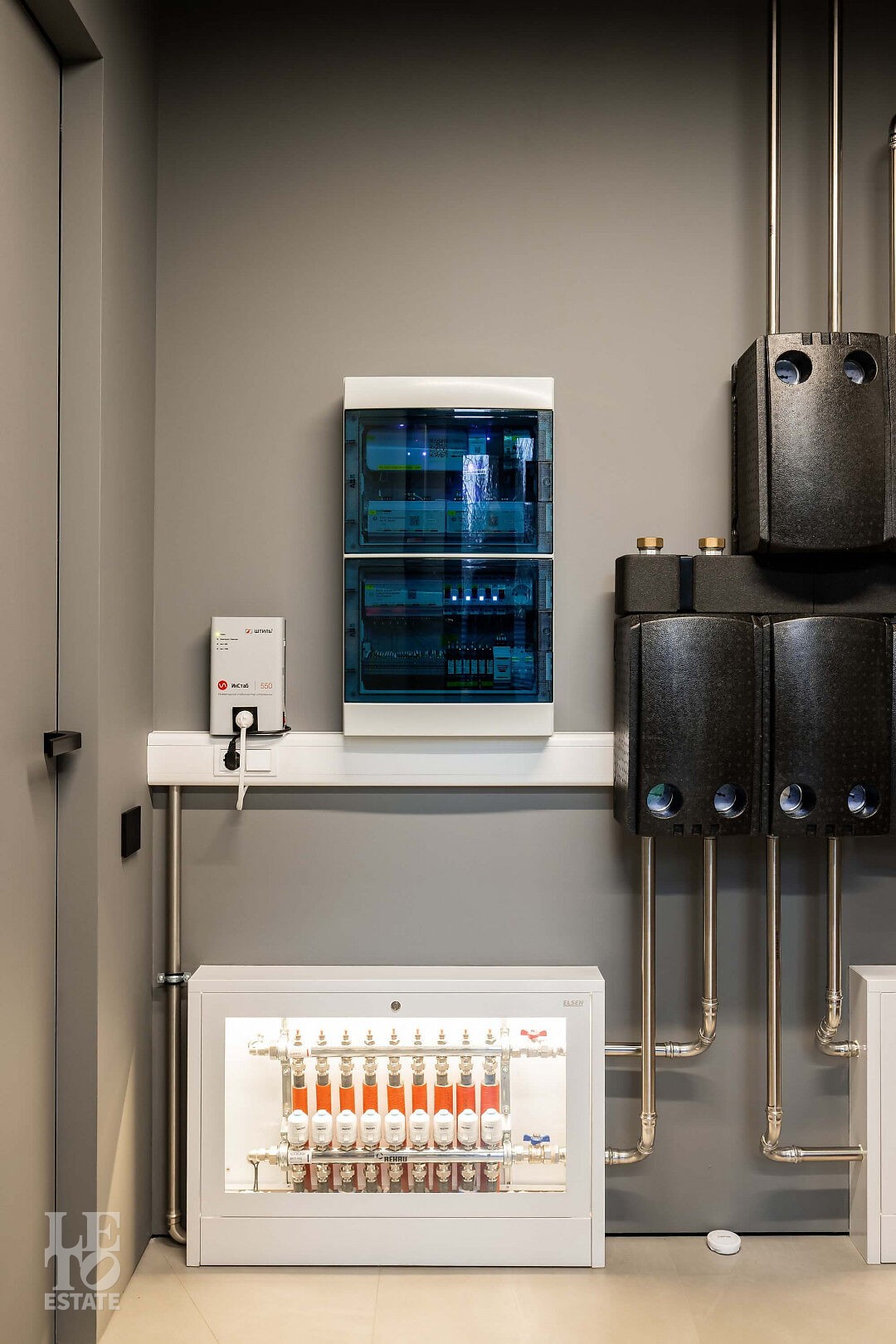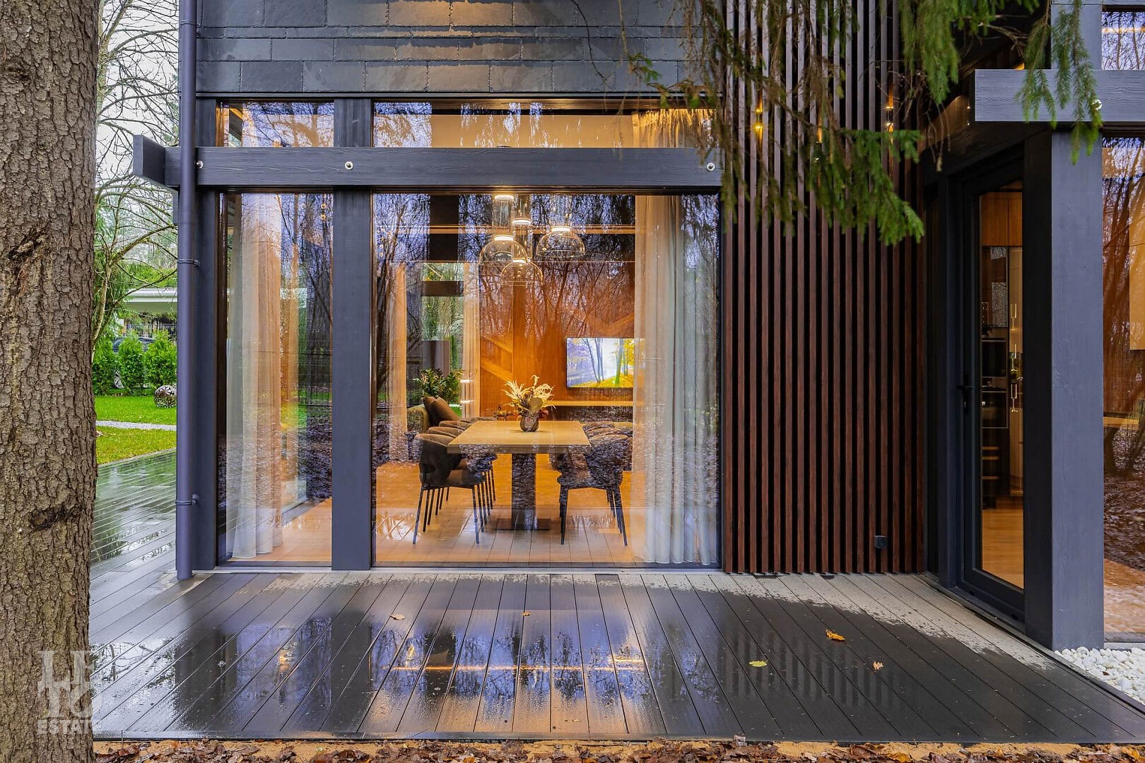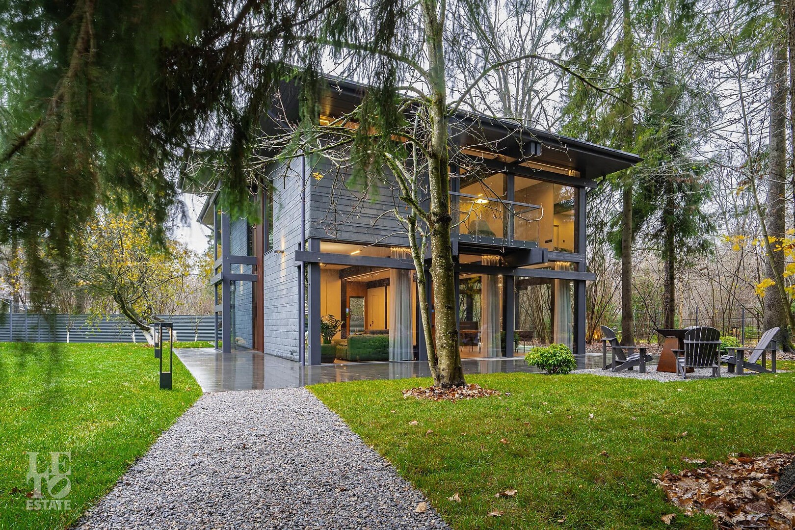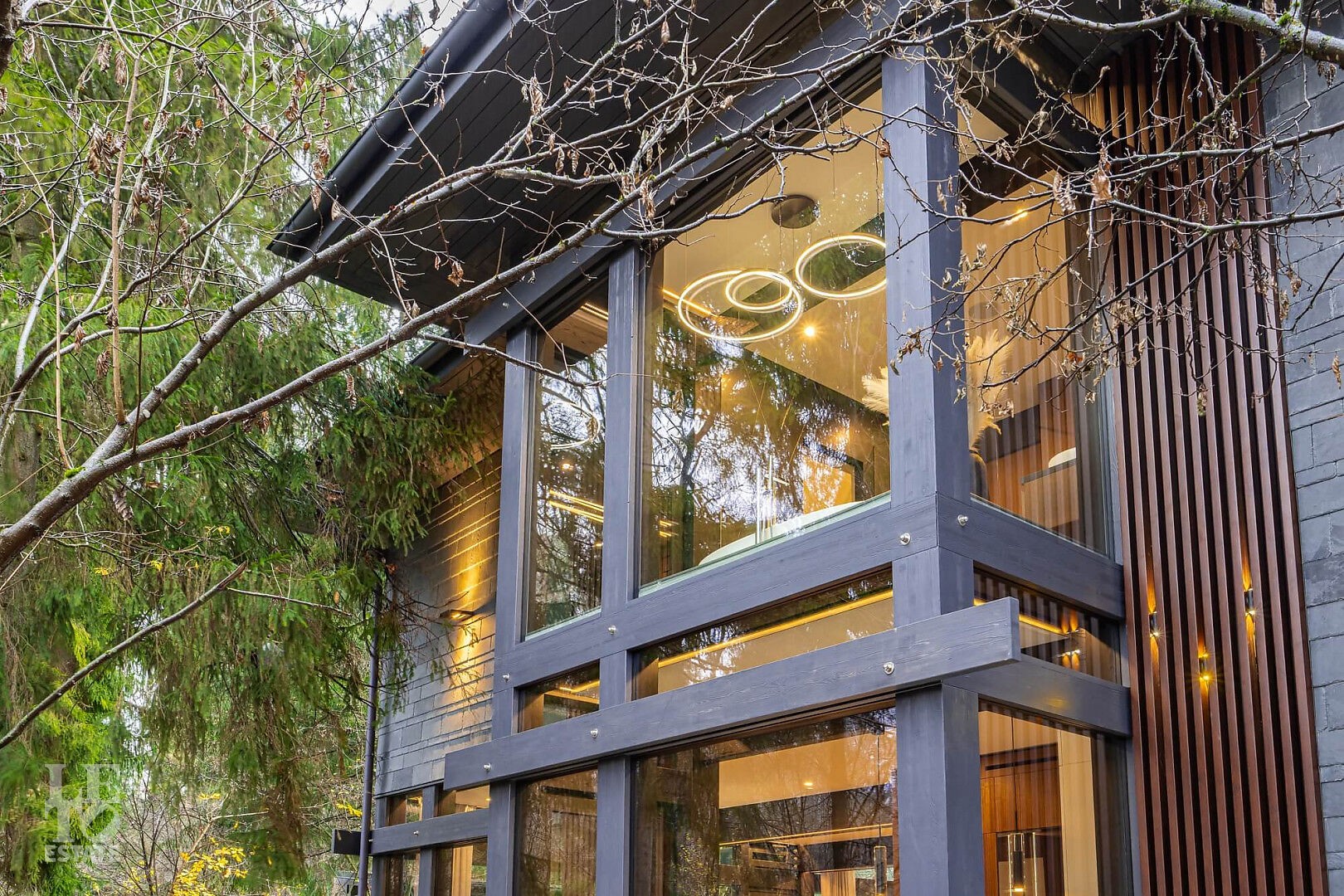 Дом в стиле “изысканный минимализм” оформлен в приглушенных серых оттенках, неяркая глубокая изумрудная зелень в игре света хрустальных аксессуаров, в бархате обивки дивана, благородной росписи стен поддерживается богатым природным ландшафтом за панорамными окнами. Каждая деталь интерьера ощущается качественной и продуманной. Благородные деревянные панели, мягкий текстиль, натуральный камень — все это располагает к
