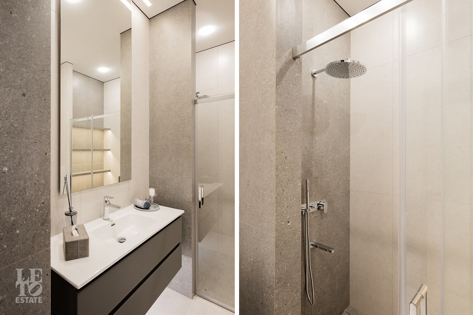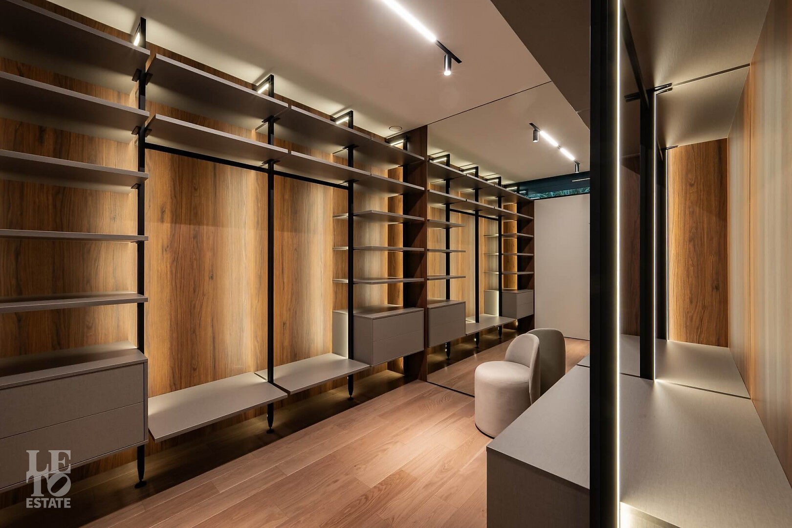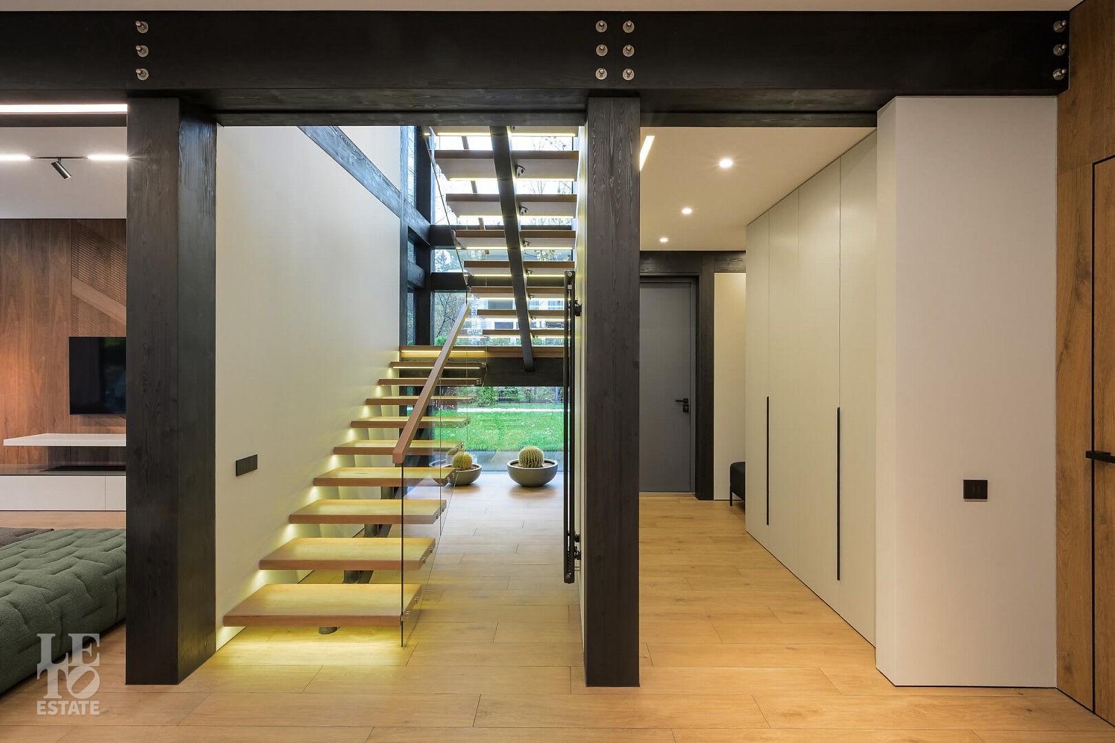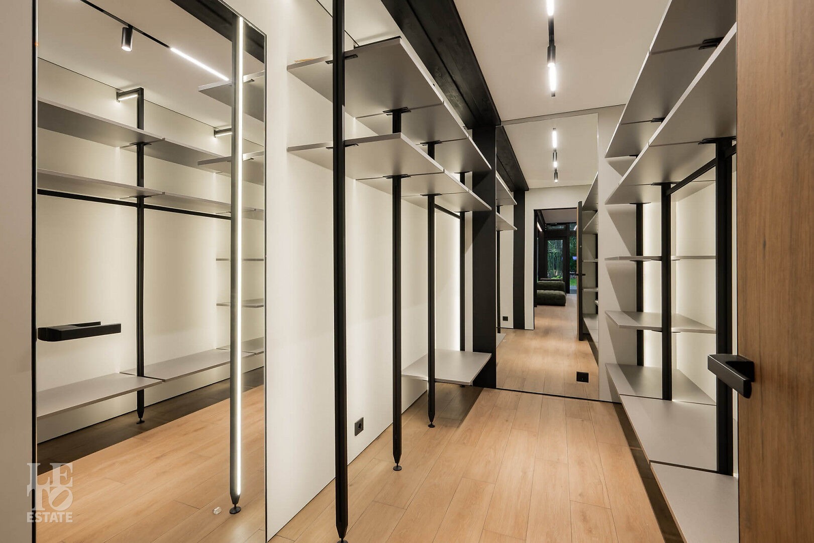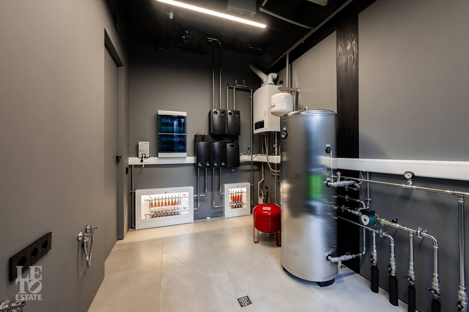 Дом в стиле “изысканный минимализм” оформлен в приглушенных серых оттенках, неяркая глубокая изумрудная зелень в игре света хрустальных аксессуаров, в бархате обивки дивана, благородной росписи стен поддерживается богатым природным ландшафтом за панорамными окнами. Каждая деталь интерьера ощущается качественной и продуманной. Благородные деревянные панели, мягкий текстиль, натуральный камень — все это располагает к