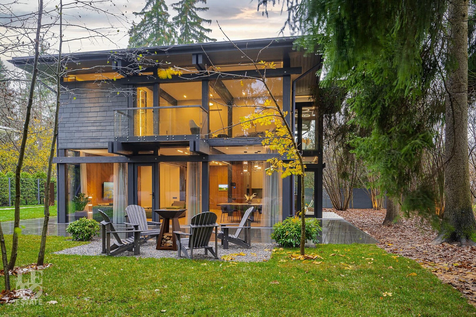 Волшебный дом с прозрачными стенами на лесном участке.