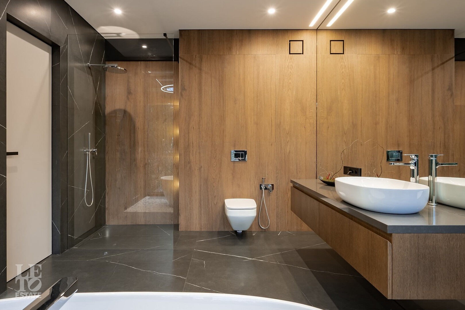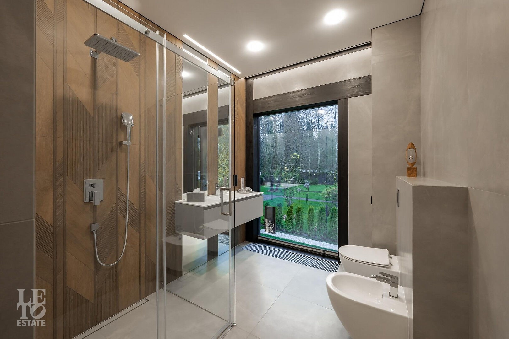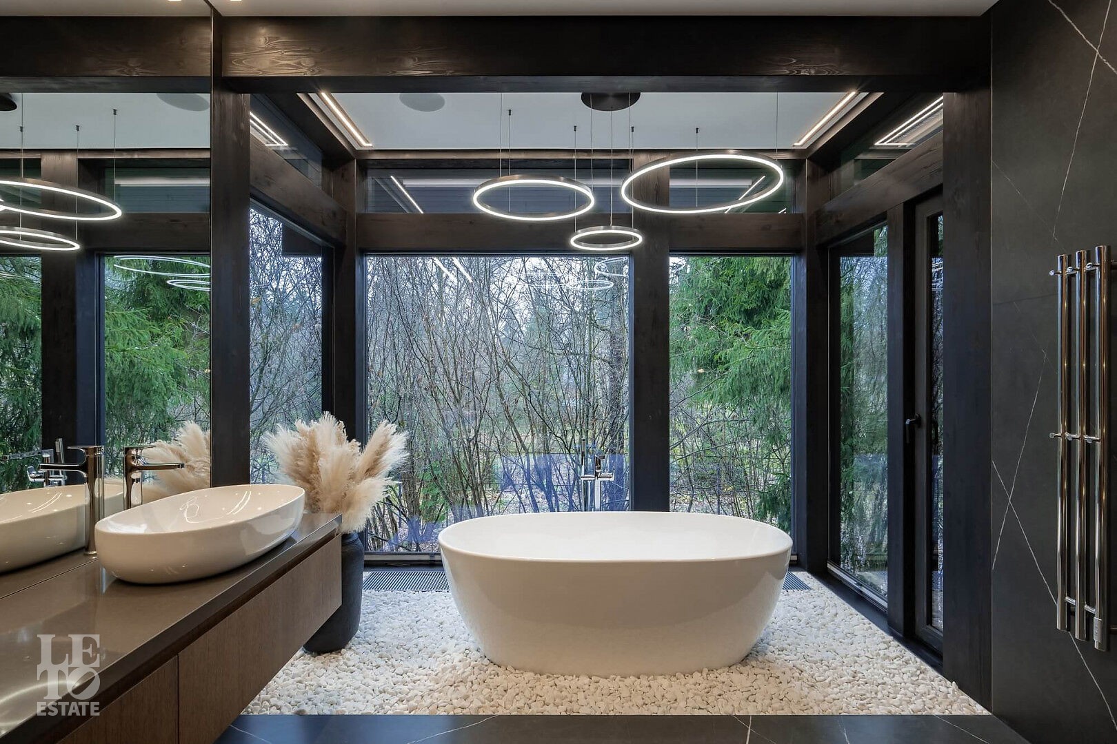 Тактичная подсветка растений и деревьев по периметру участка вечером раздвигает границы и дополняет уют. В мастер ванной встроенная музыкальная система и отдельно стоящая на дренируемой мраморной гальке ванна оставляют незабываемые впечатления от водных процедур.