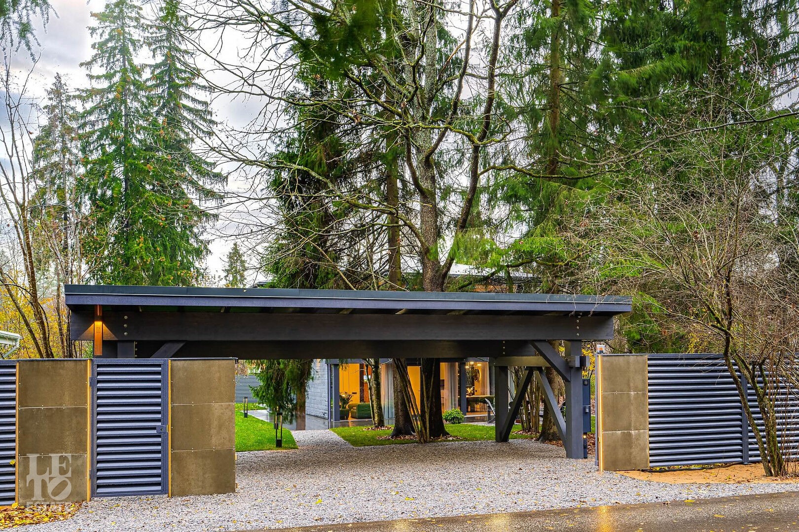 Крытая парковка на 3 машиноместа и дистанционно управляемые ворота.