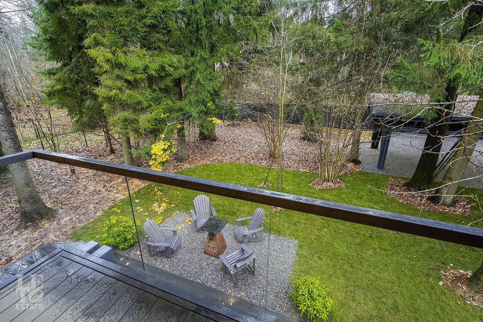 На участке 15,4 сотки стоят вековые ели и дубы, фантастический каштан, огромные орешники и пятидесятилетние плодоносящие яблони с партерным газоном. Сделан дренаж, дорожки и ландшафтный свет.
