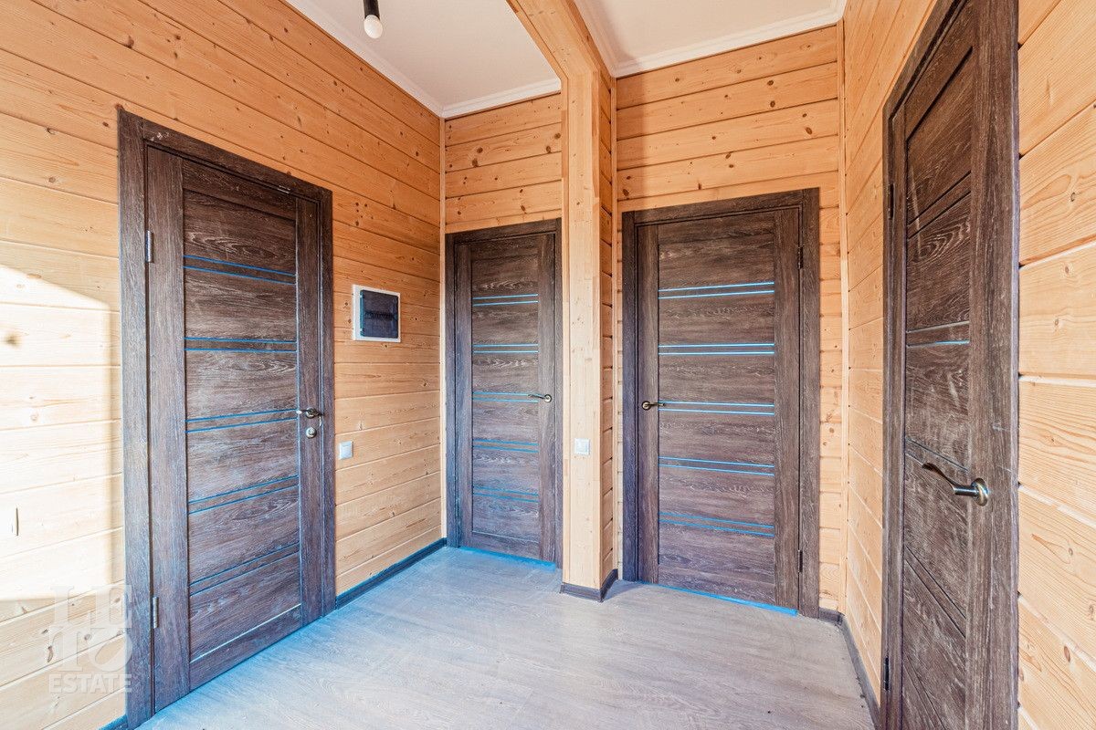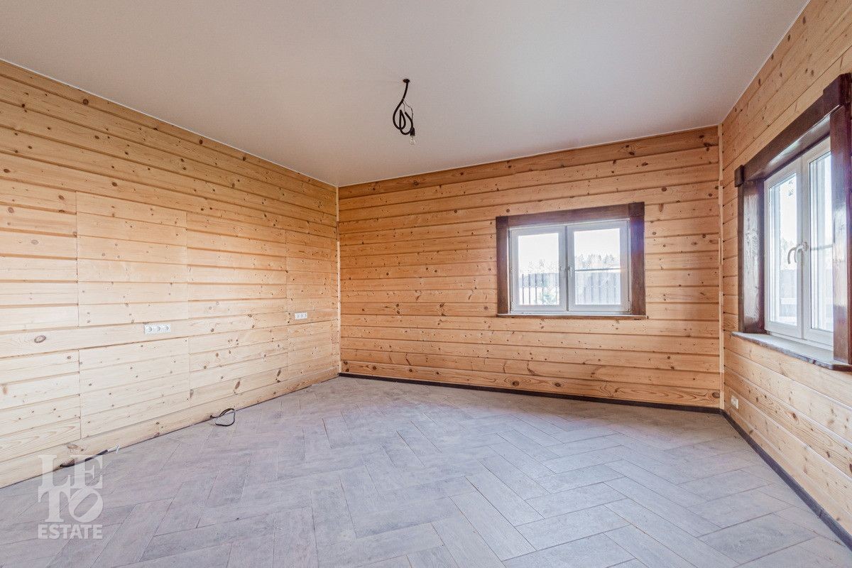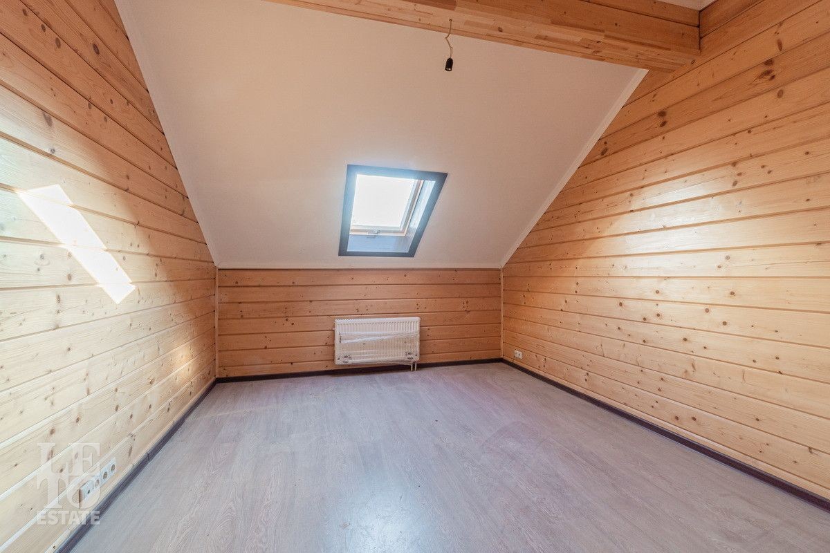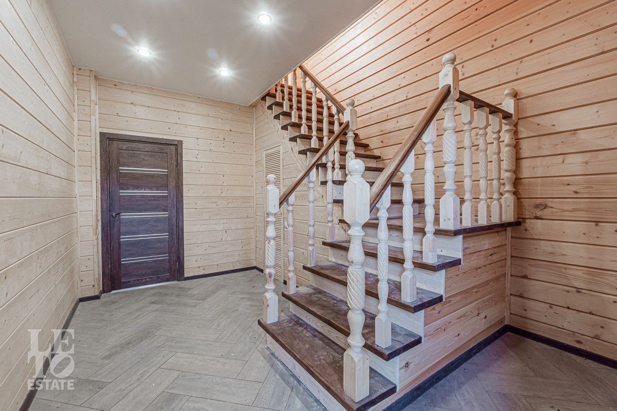 Внутренняя отделка соответствует общей стилистике дома. Стены в комнатах отделаны декоративным брусом, два санузла полностью в плитке. Пол первого этажа полностью отделан плиткой, оснащен функцией обогрева. В комнатах второго этажа на полу уложен ламинат.