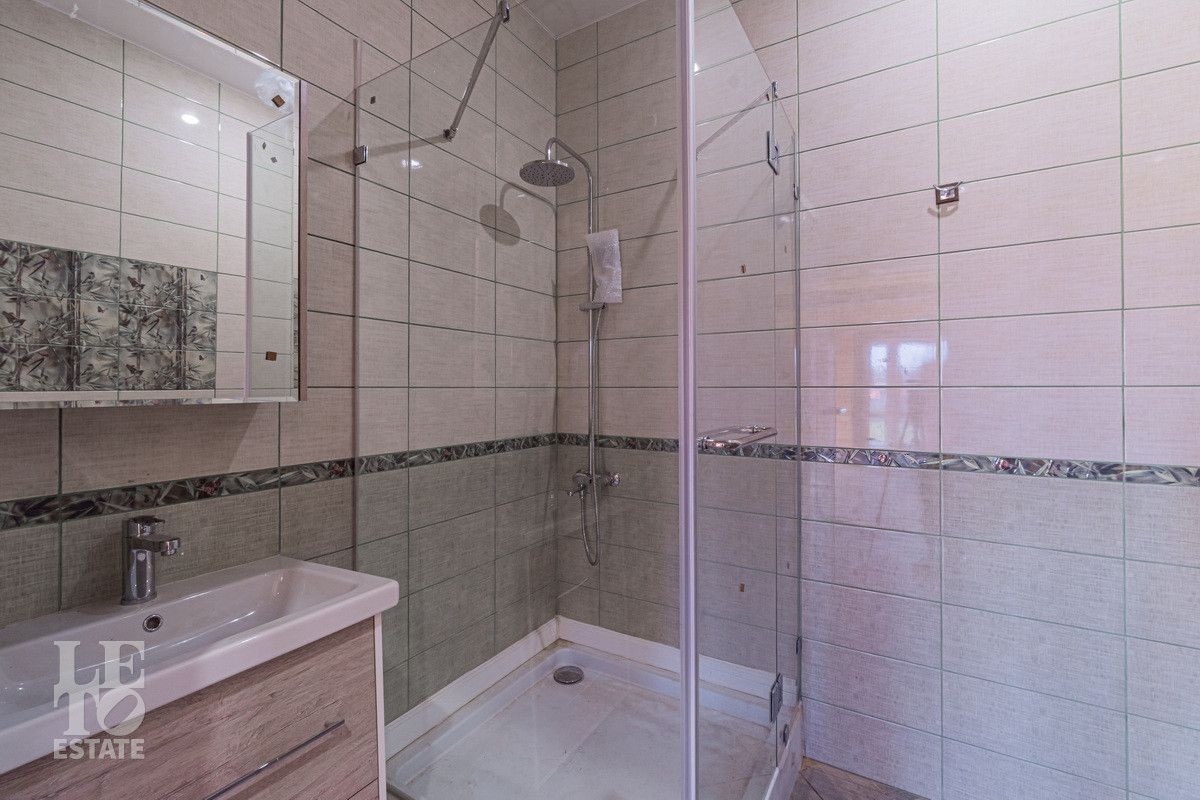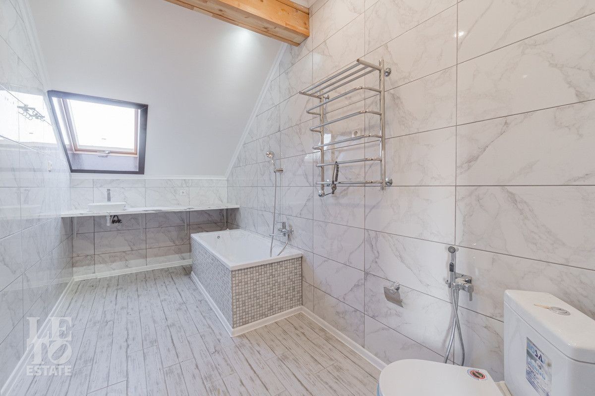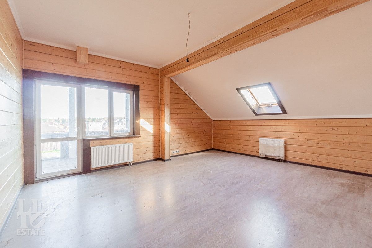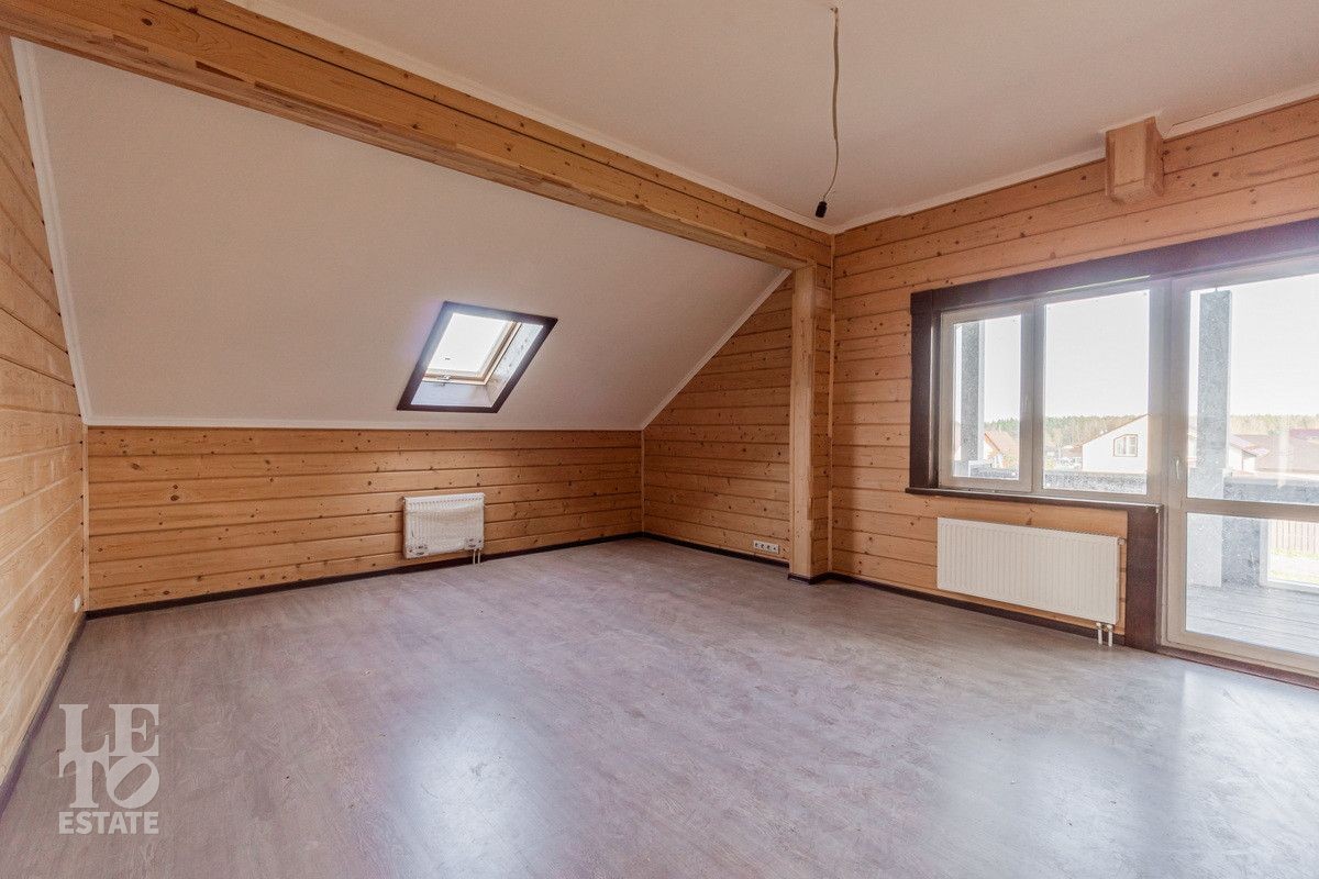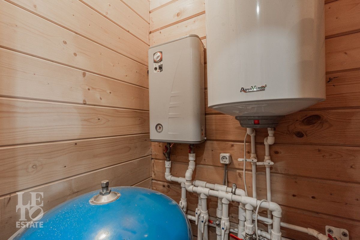 Внутренняя отделка соответствует общей стилистике дома. Стены в комнатах отделаны декоративным брусом, два санузла полностью в плитке. Пол первого этажа полностью отделан плиткой, оснащен функцией обогрева. В комнатах второго этажа на полу уложен ламинат.