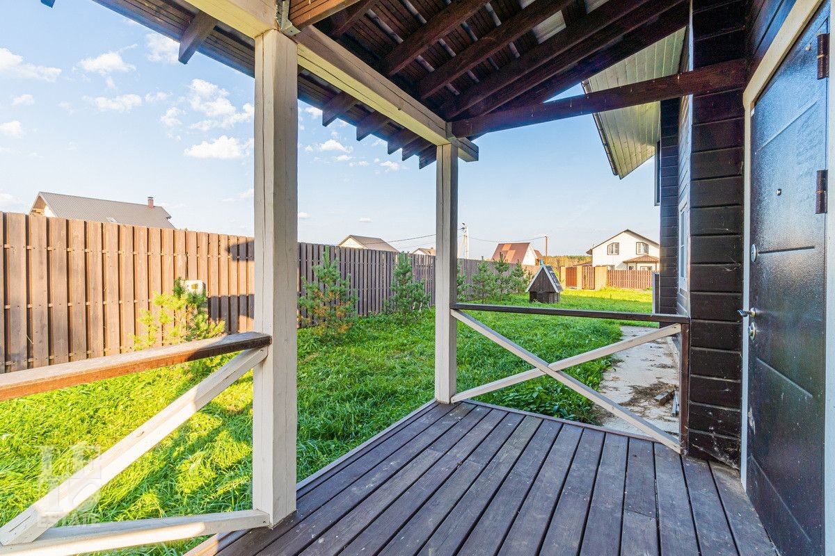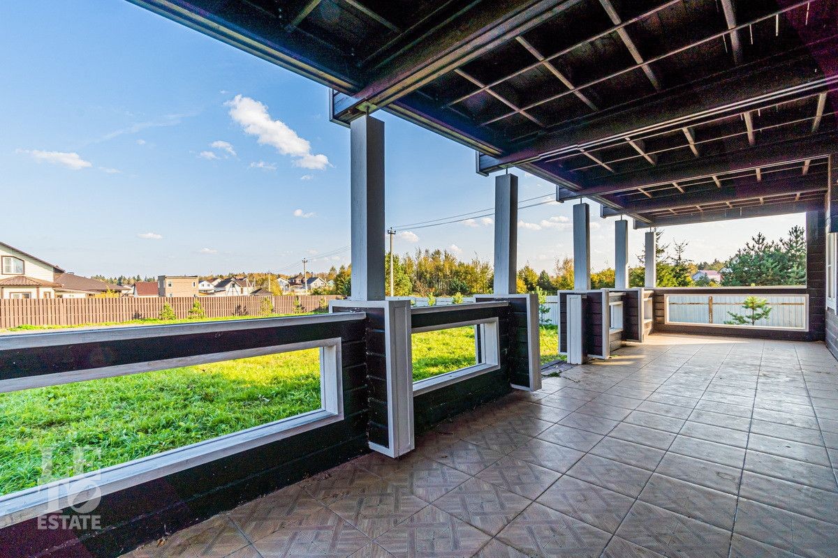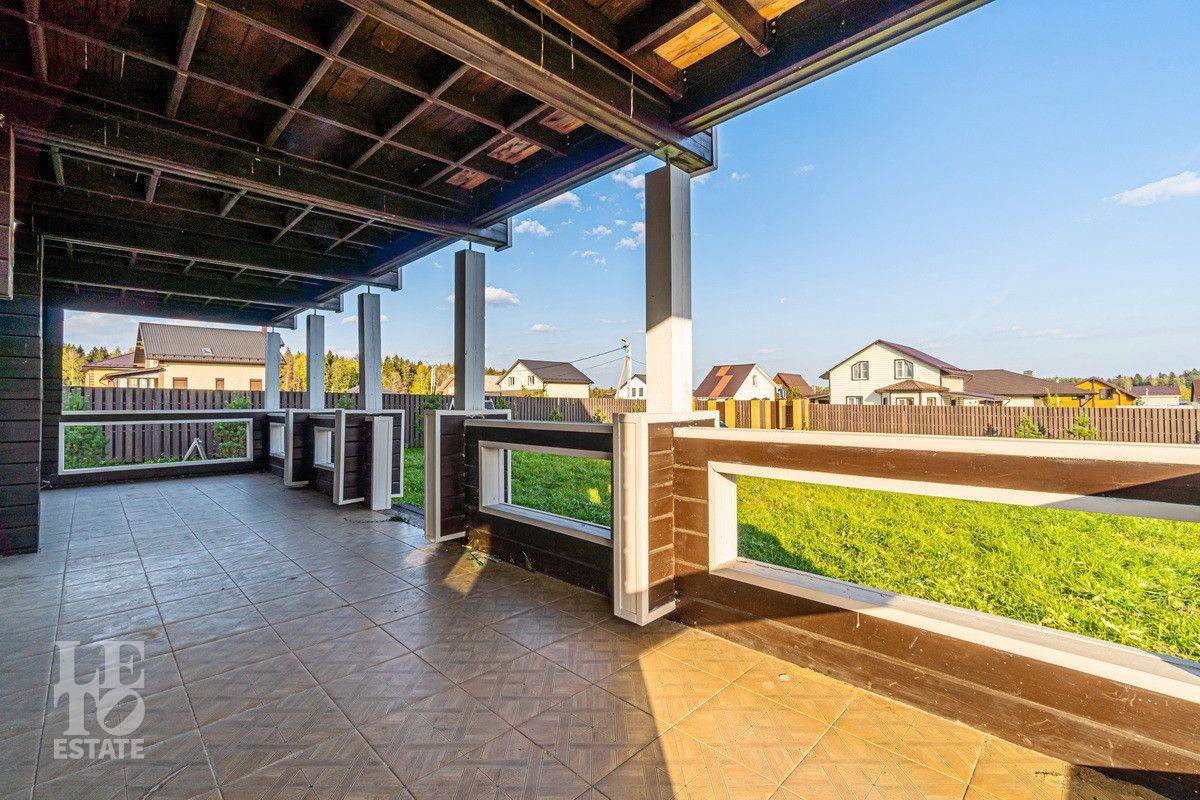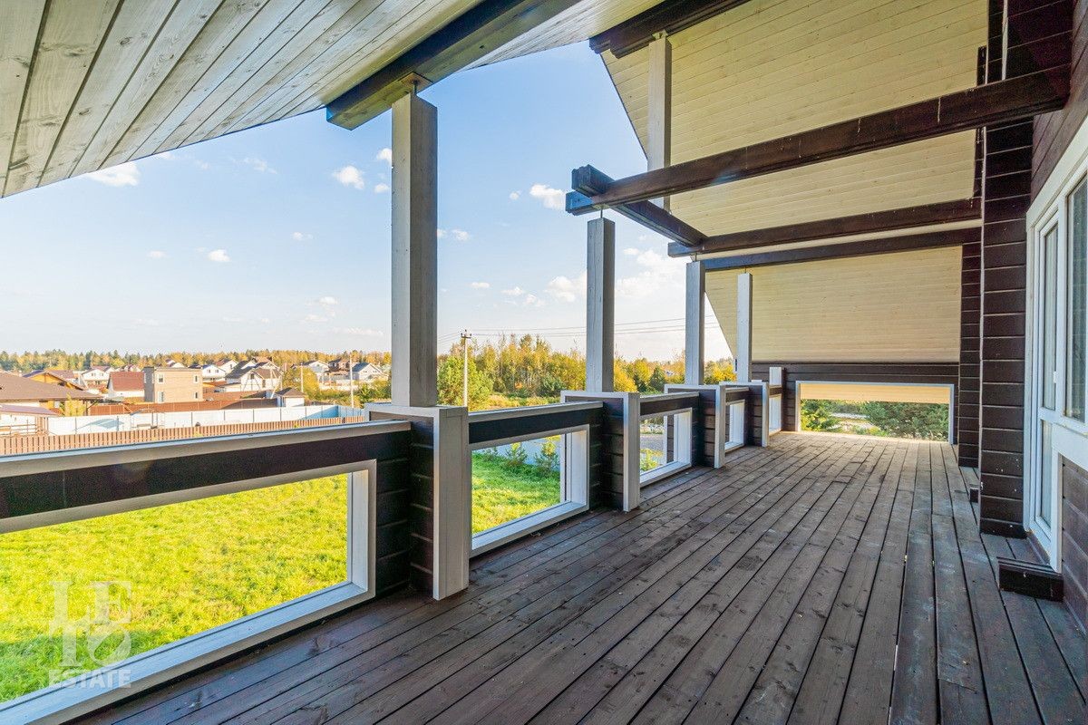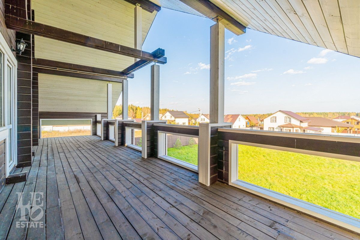 Дом построен в 2015 году из клееного бруса в стиле Шале. Фундамент - монолитная плита. Особенностью данного строения является наличие двух больших открытых пространств (на первом и втором этажах), что позволяет организовать комфортные места отдыха на свежем воздухе.