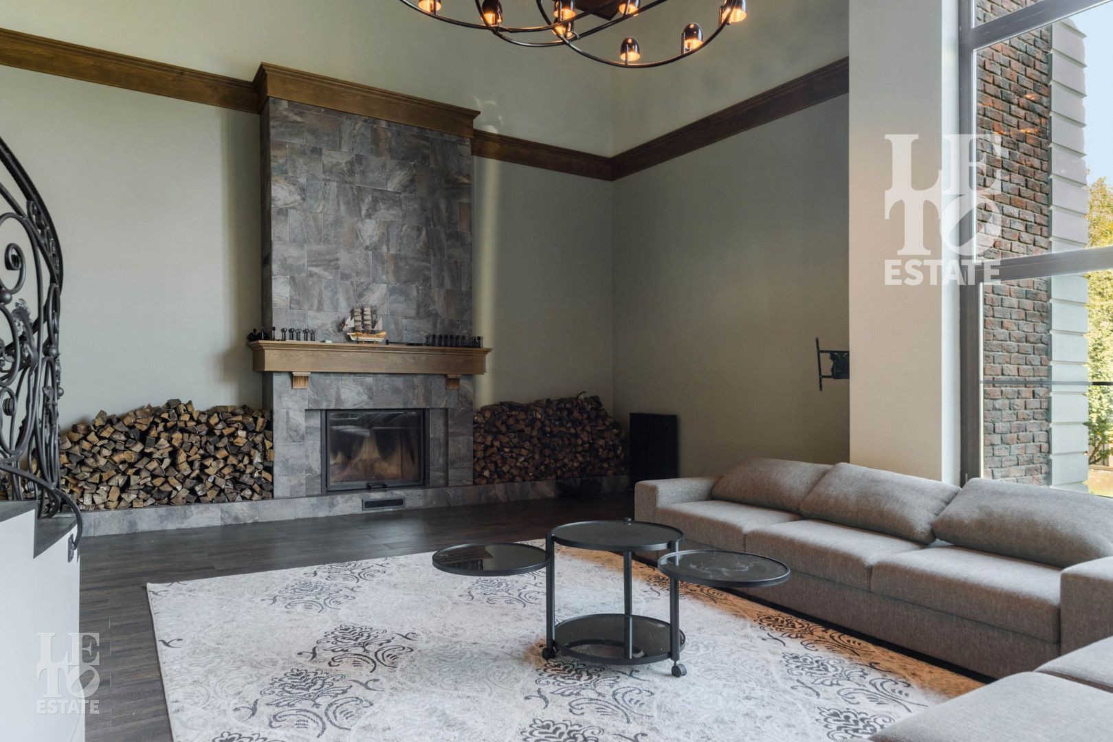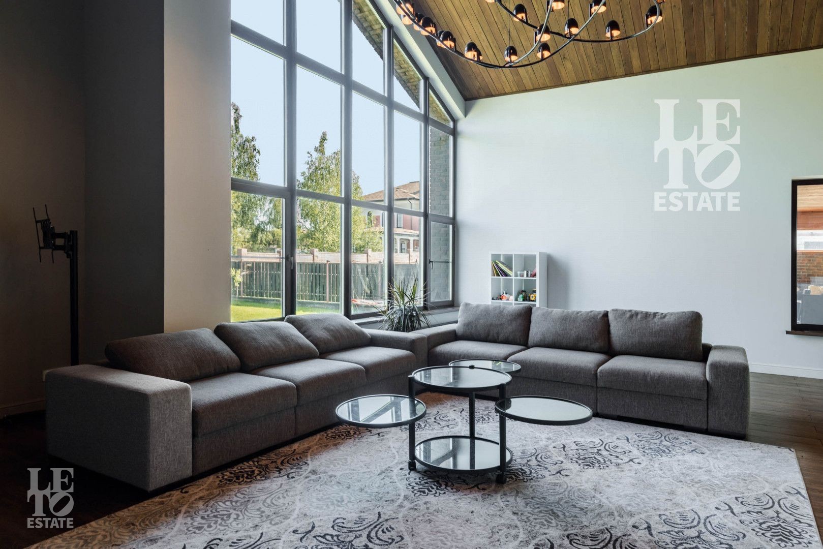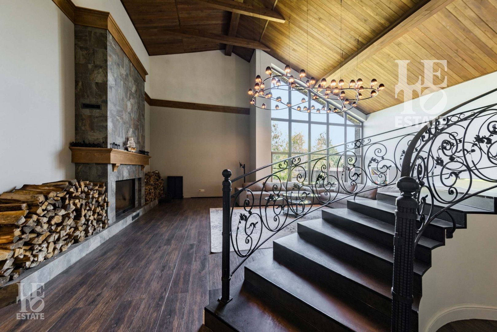 Гостиная представляет собой дизайнерский объект со вторым светом, камином, панорамным окном и очень высоким потолком, сочетающейся с открытыми потолочными балками. Потолок и балки обшиты планкеном из лиственницы.