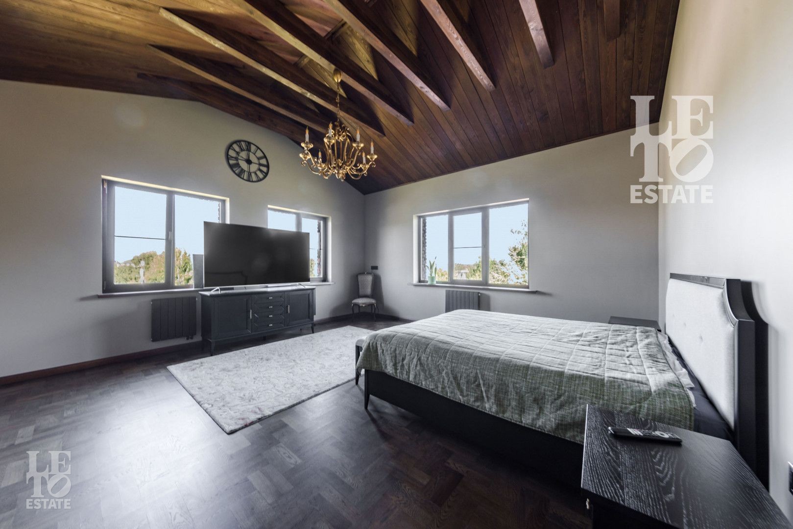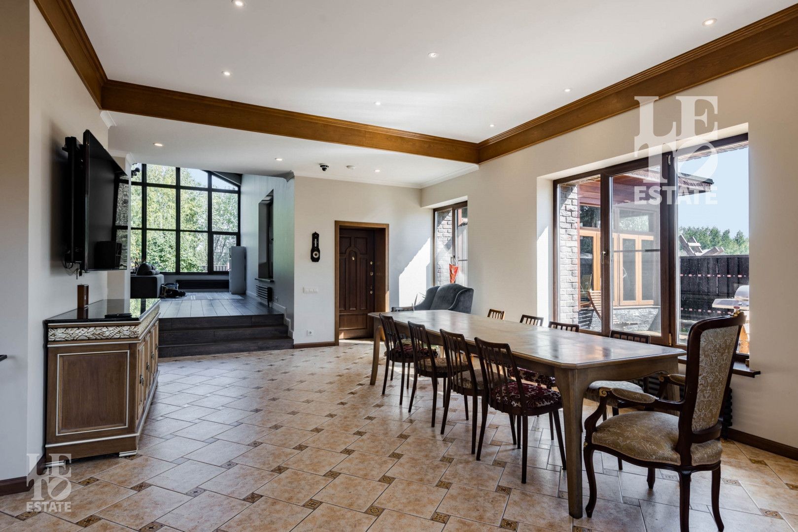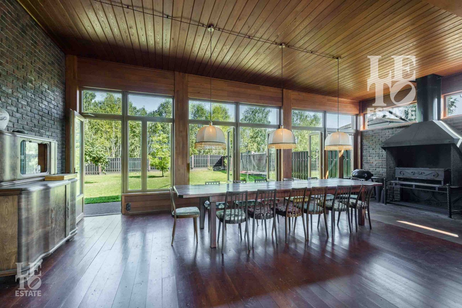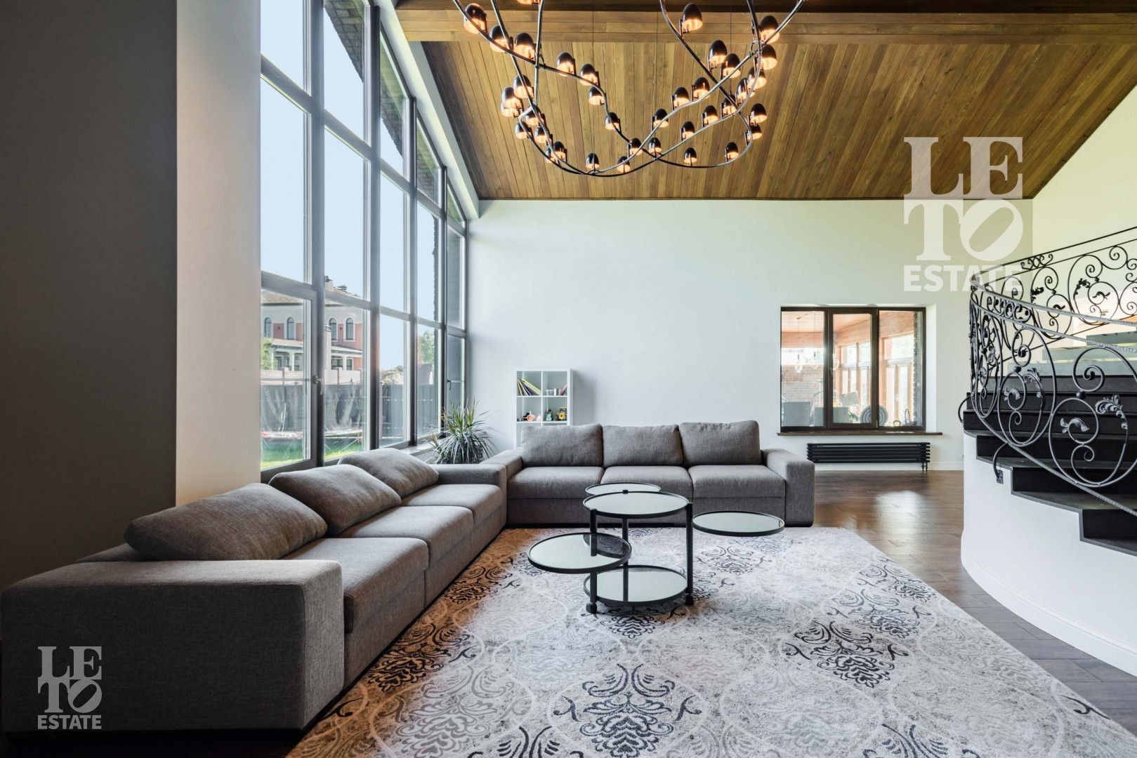 Гостиная представляет собой дизайнерский объект со вторым светом, камином, панорамным окном и очень высоким потолком, сочетающейся с открытыми потолочными балками. Потолок и балки обшиты планкеном из лиственницы.