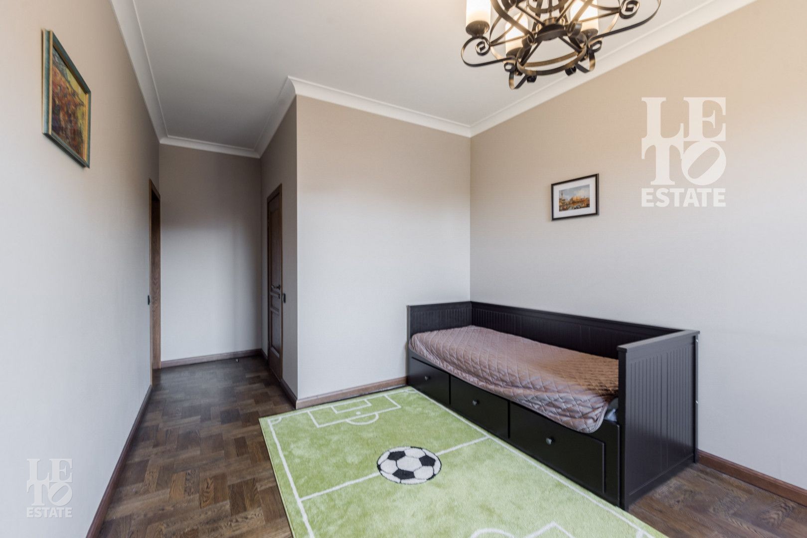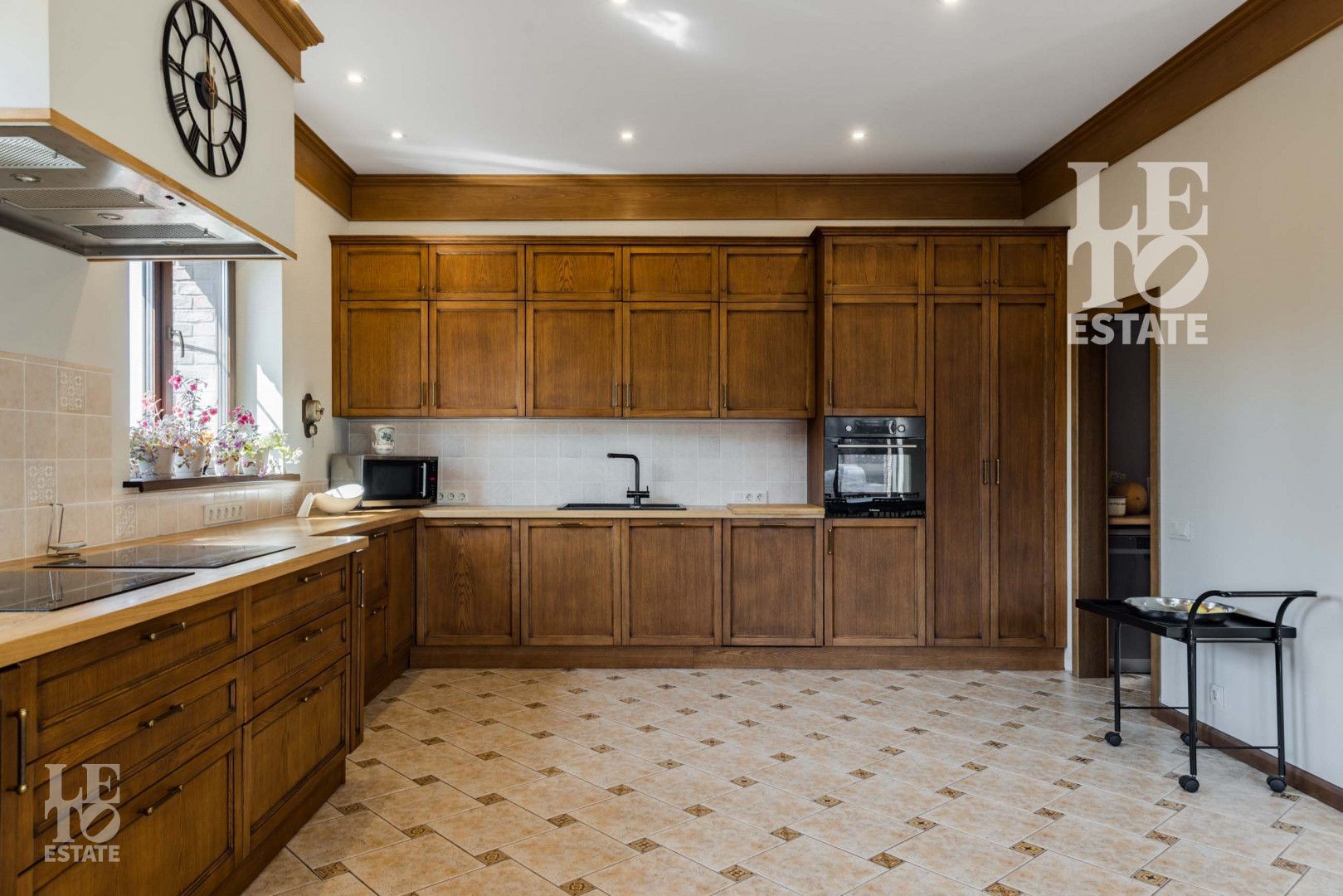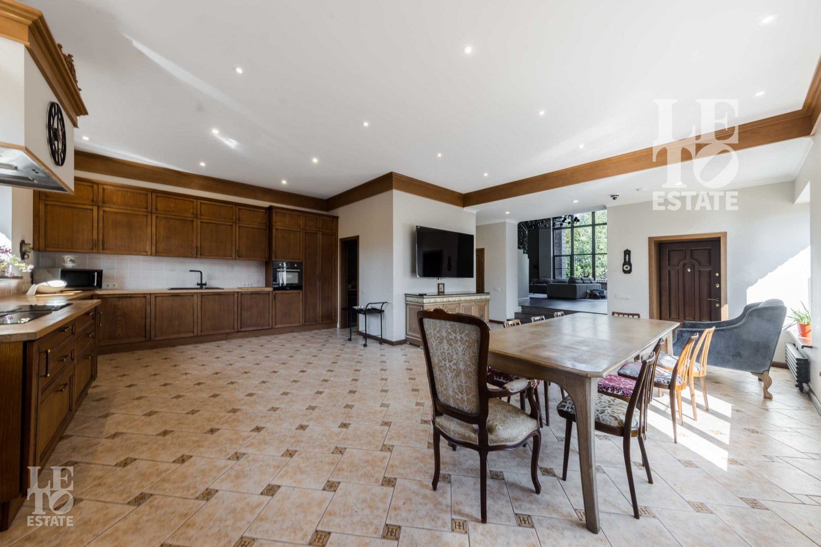 Гостиная граничит с не менее просторной кухней – столовой, оборудованной необходимой техникой. К кухне примыкает постирочная.