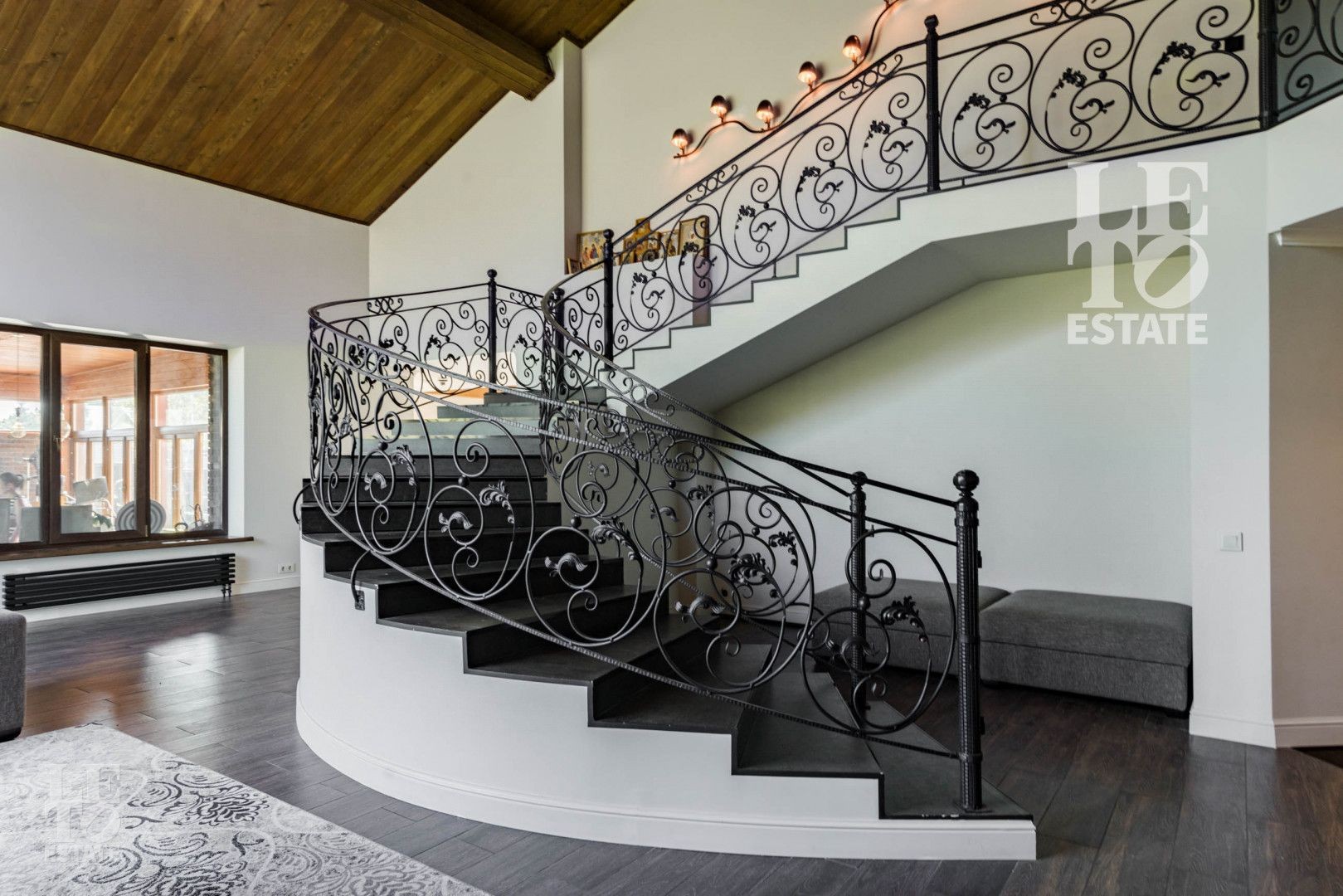 Несомненным украшением гостиной являются авторские люстра и лестничное бра, а также изогнутая, двух маршевая широкая лестница с кованными перилами, ведущая в холл второго этажа.