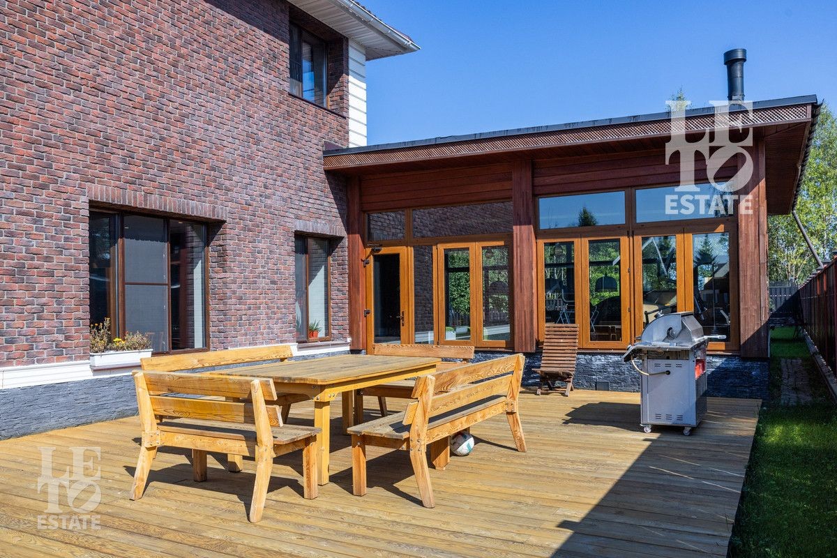 В свою очередь, из веранды есть два выхода - один на открытую зону барбекю с деревянным настилом из лиственничной террасной доски и газовым грилем из нержавейки, второй – на участок.