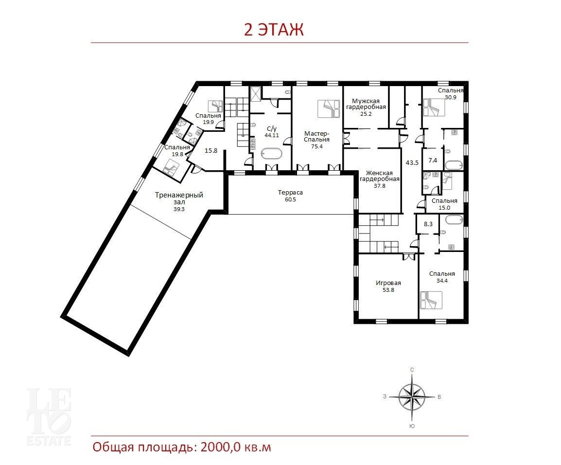 Второй этаж: игровая, 6 мастер-спален, тренажерный зал, терраса.