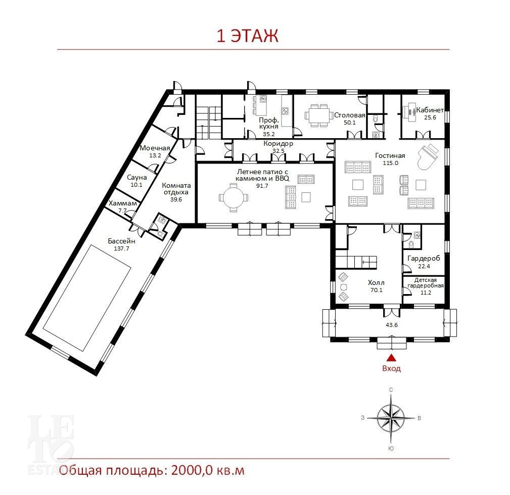 Первый этаж: 2 гардеробных, 3 санузла, гостинная, кабинет, столовая, кухня, СПА зона ( бассейн, хамам, сауна), комната отдыха, летняя веранда.
