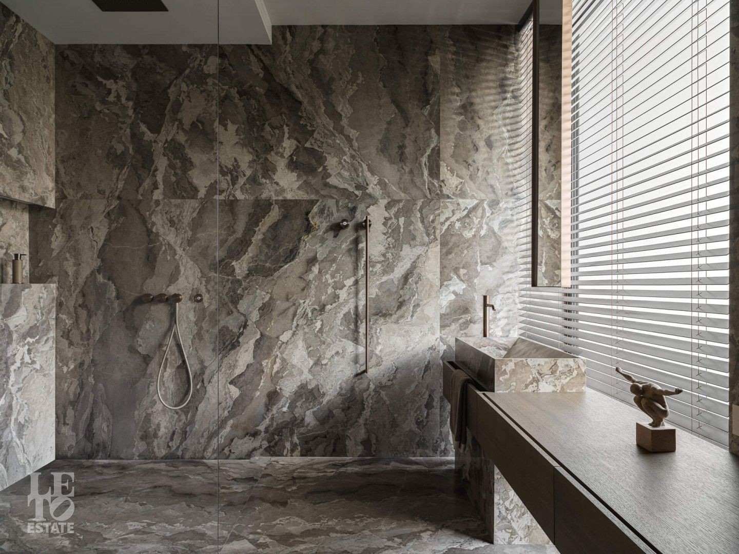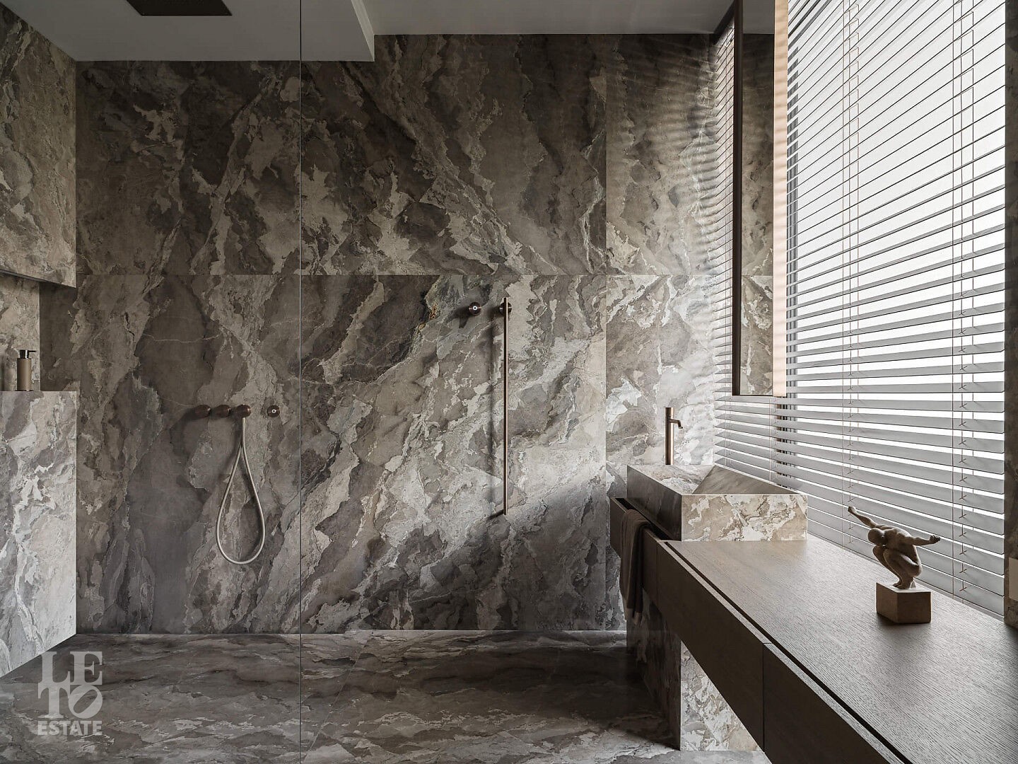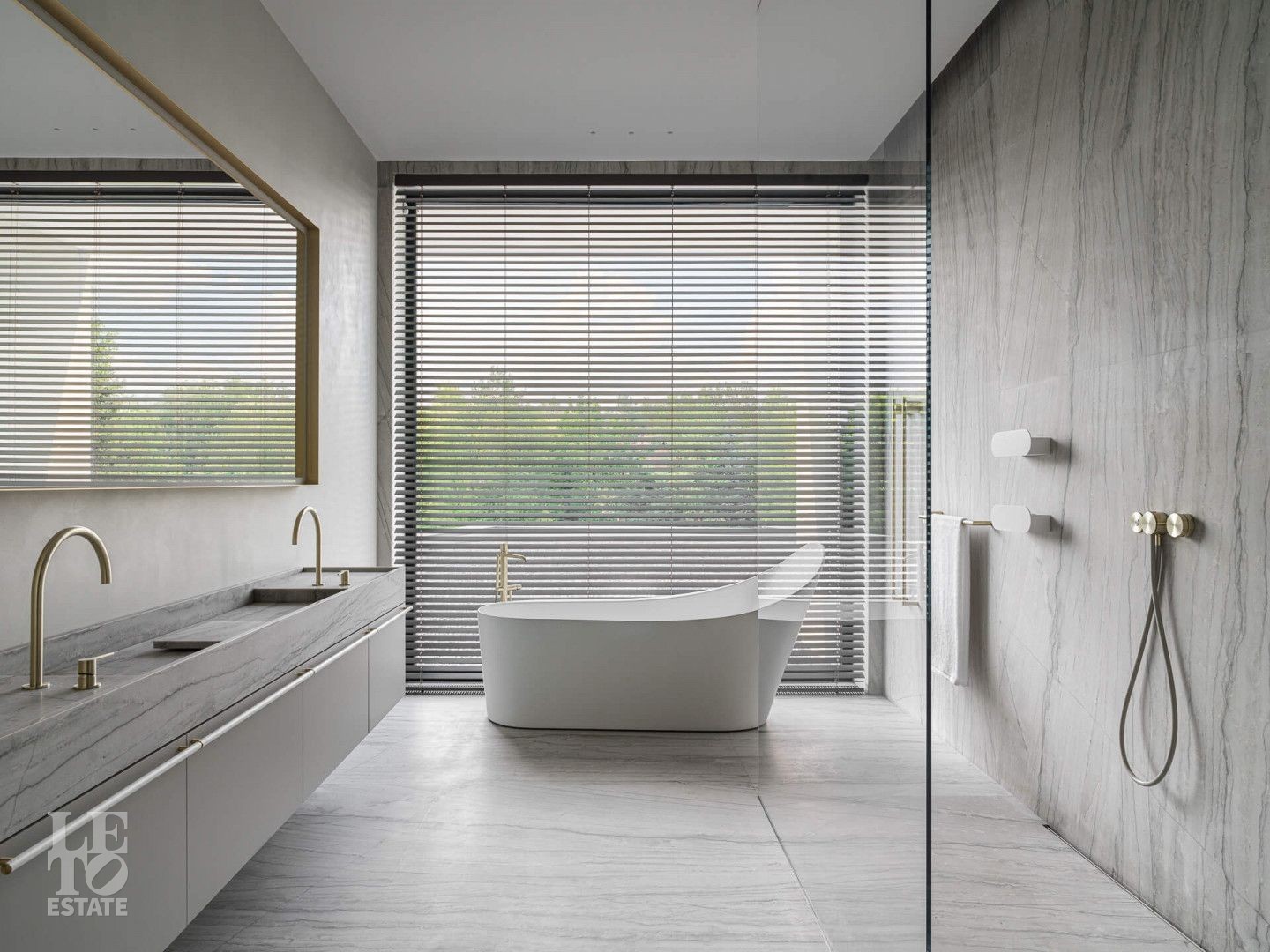В отделке используются только премиальные материалы: мрамор (отделка камина, раковина в гостевом с/у, хаммам, прихожая, мужская мастер-ванная), кварцит (женская мастер-ванная, остров на кухне), инженерная доска из дуба (на полу), тик (потолок бассейна), кедр и абаш (сауна).