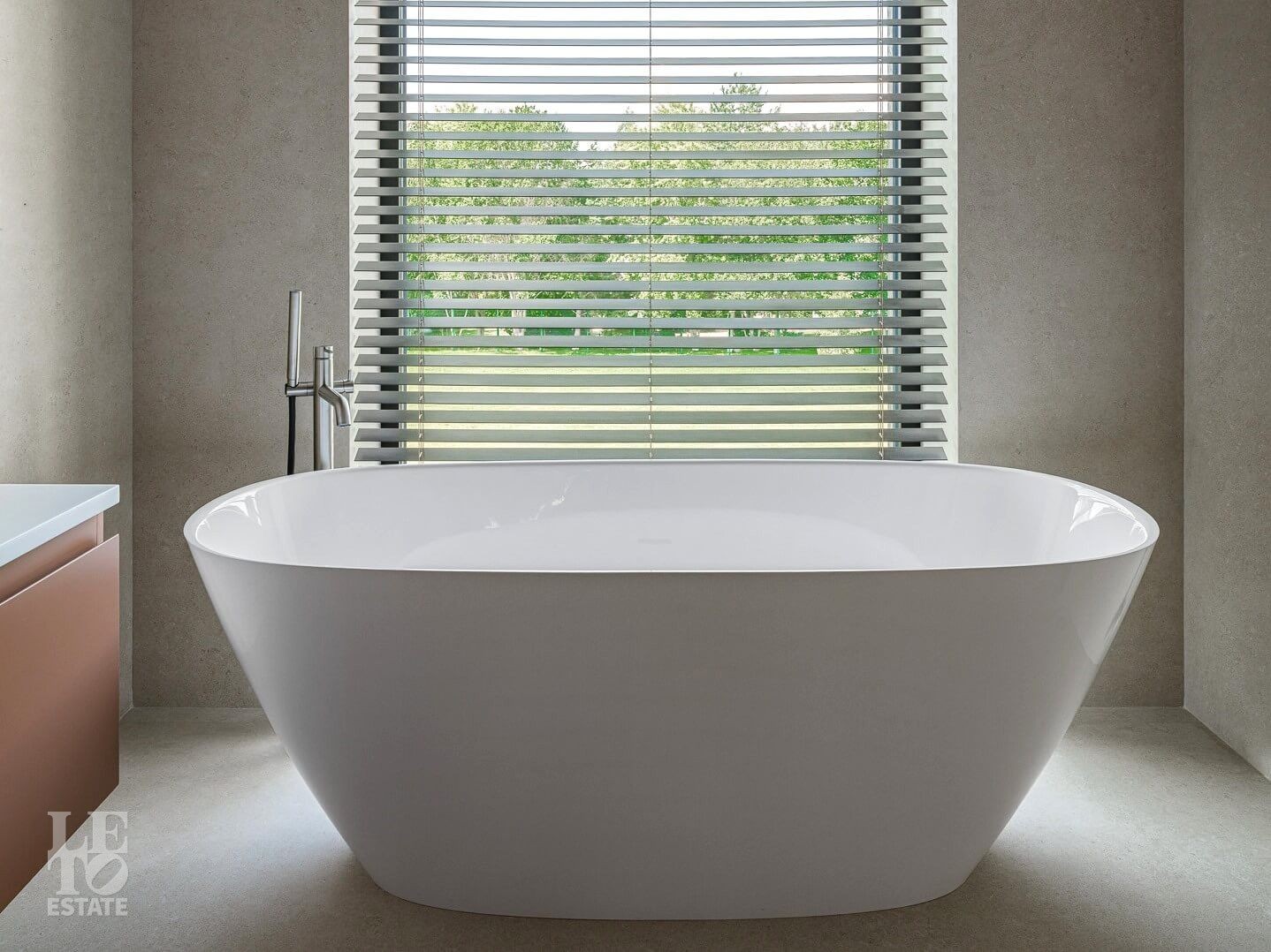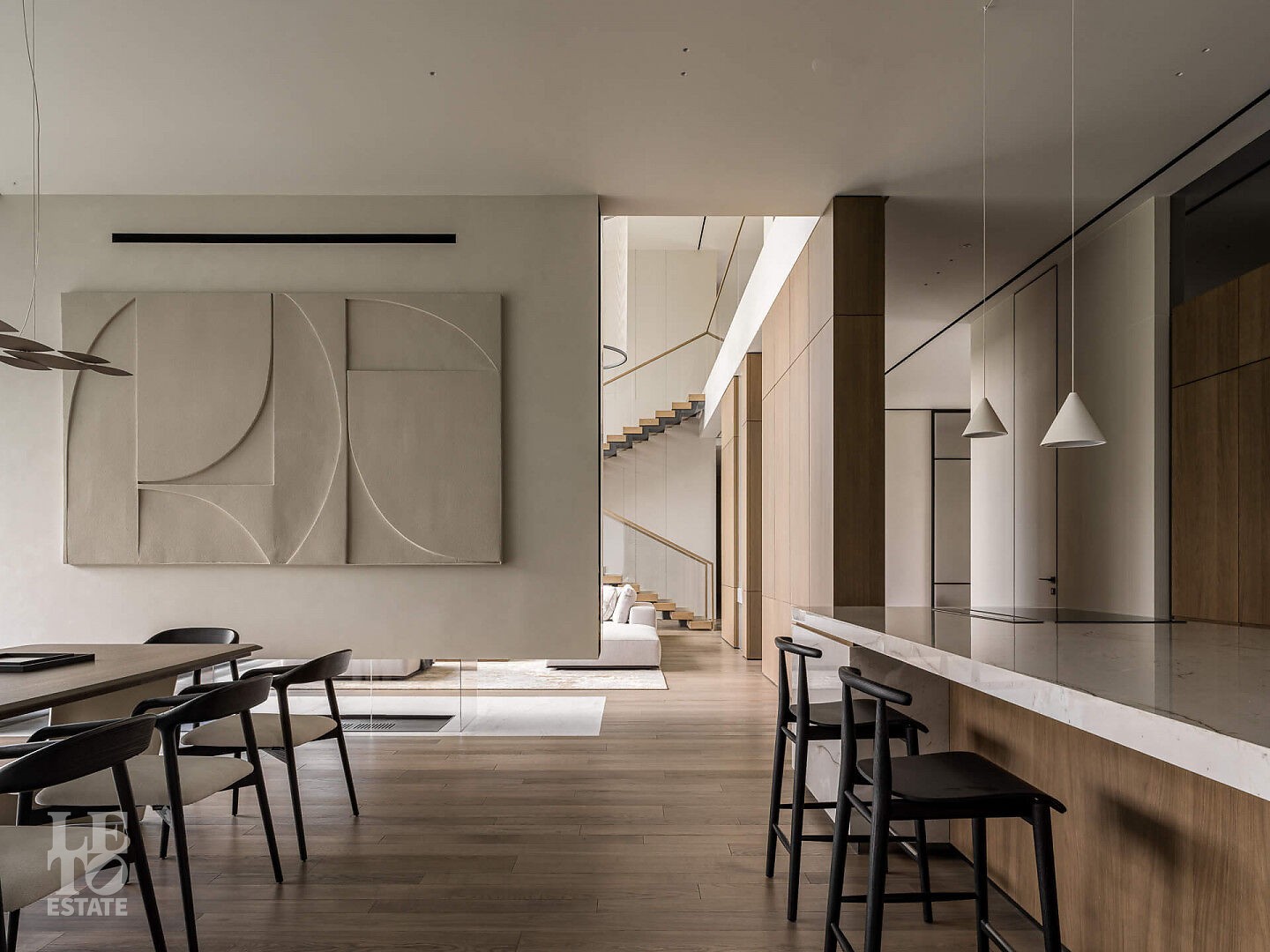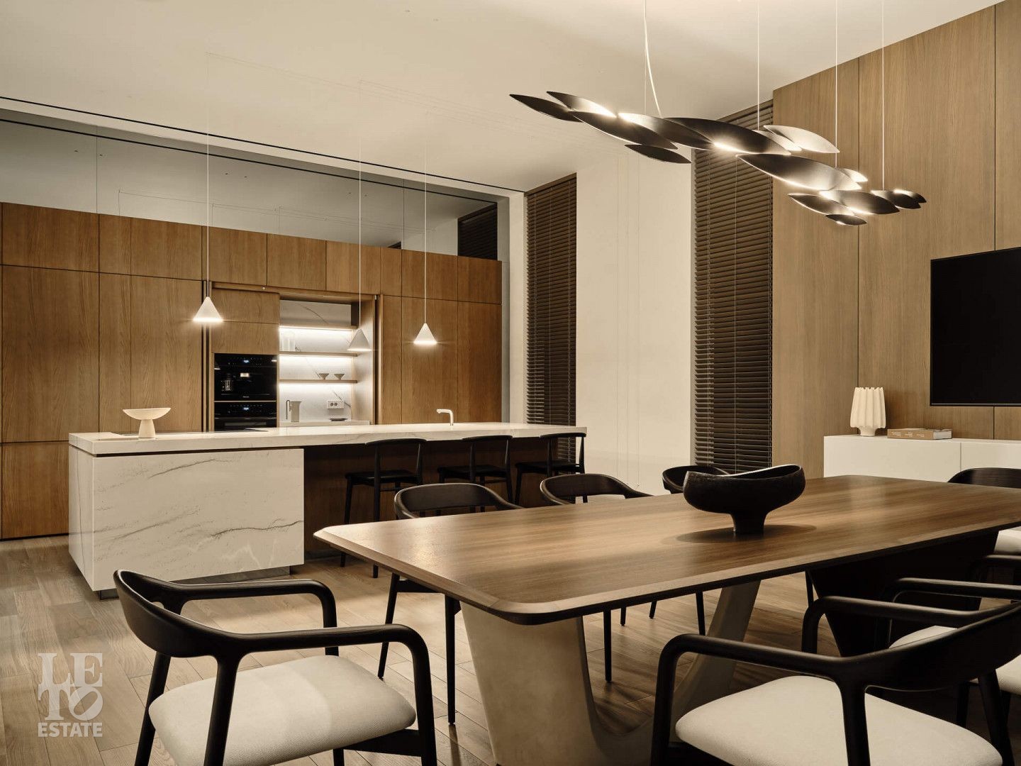 В отделке используются только премиальные материалы: мрамор (отделка камина, раковина в гостевом с/у, хаммам, прихожая, мужская мастер-ванная), кварцит (женская мастер-ванная, остров на кухне), инженерная доска из дуба (на полу), тик (потолок бассейна), кедр и абаш (сауна).