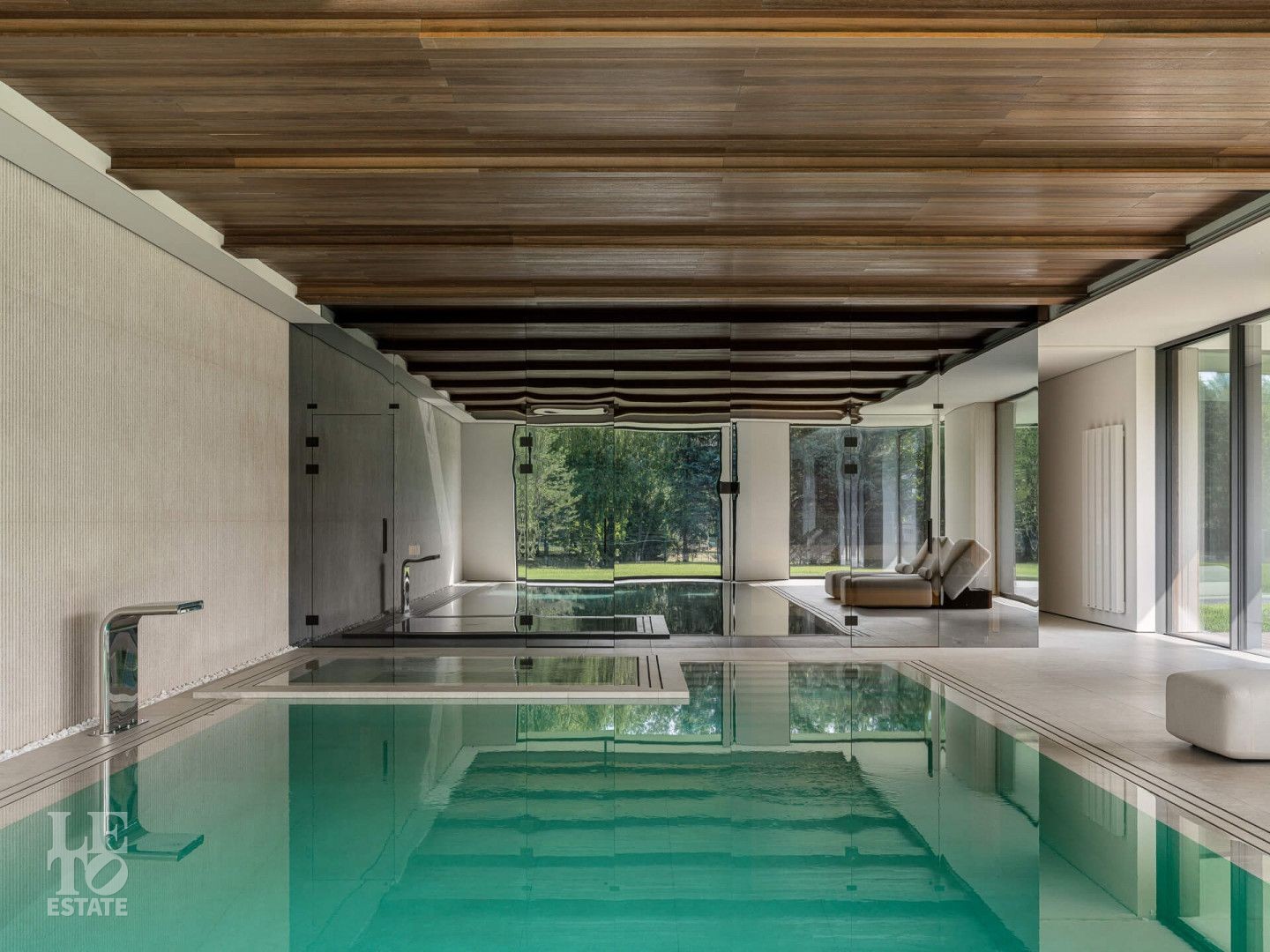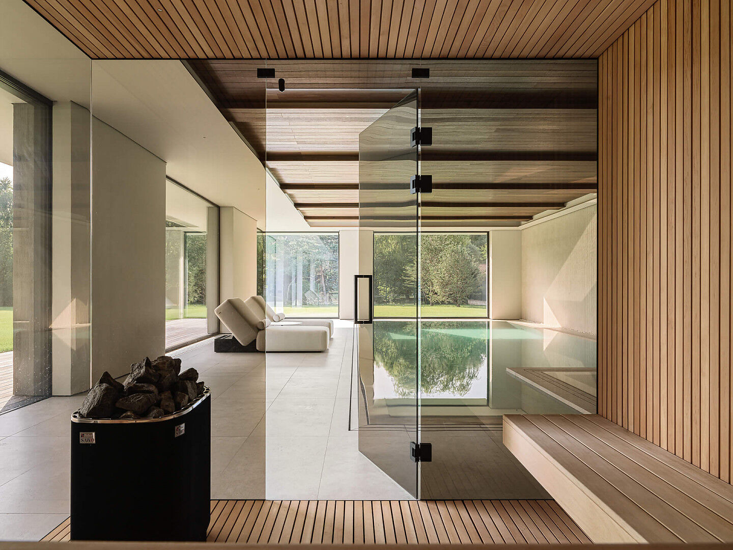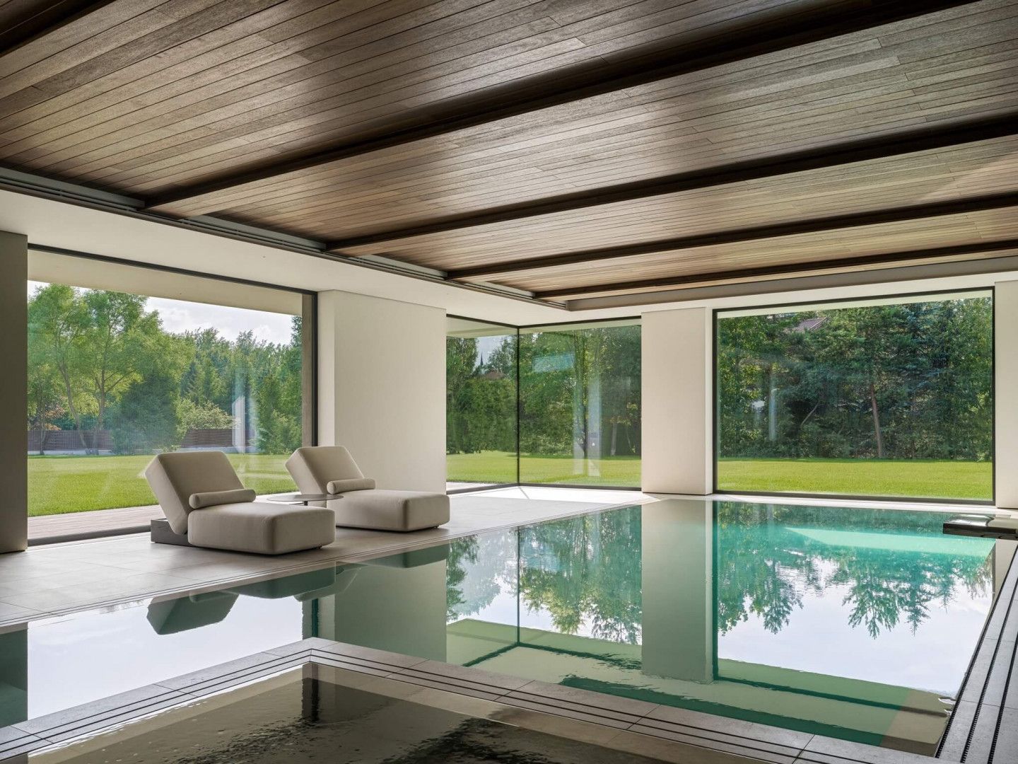В его состав входят переливной бассейн длиной 11 м с противотоком и фонтаном, джакузи, сауна, хаммам, тропический душ с режимом обливного ведра, санузел, раздевалка или комната для массажа. Есть место для размещения бара и диванной группы. Панорамные окна расширяют пространство и впускают природу в спа-комплекс.На всех окнах - электровыводы под рулонные шторы на случай, если понадобится обеспечить этой зоне больше приватности.