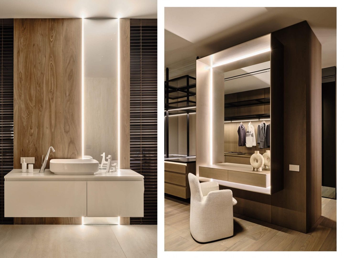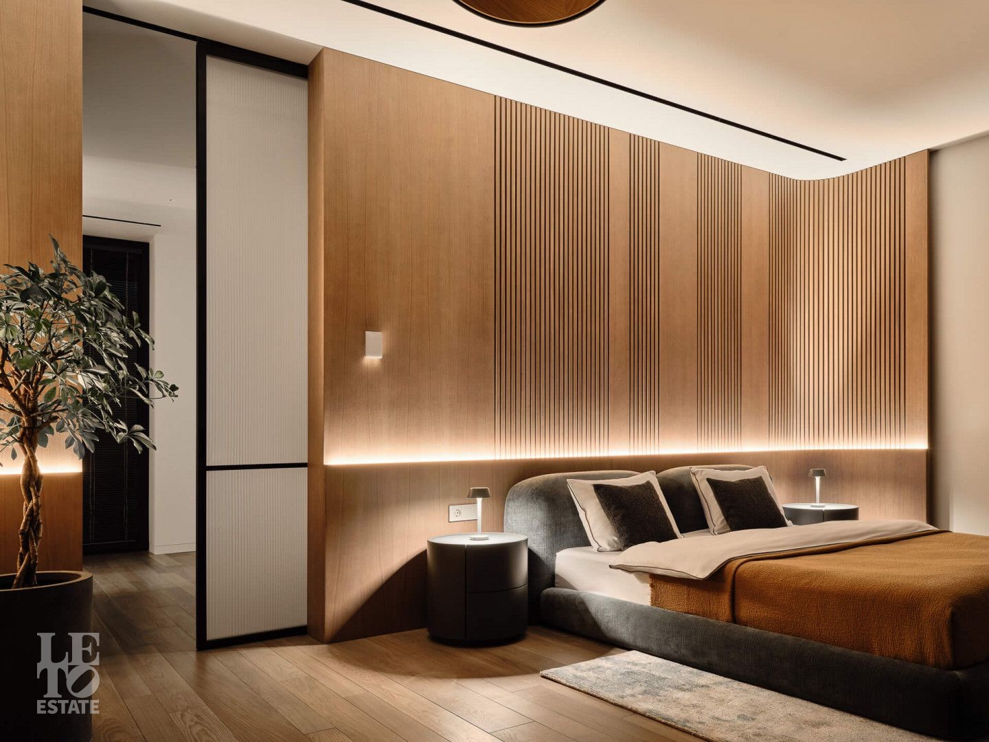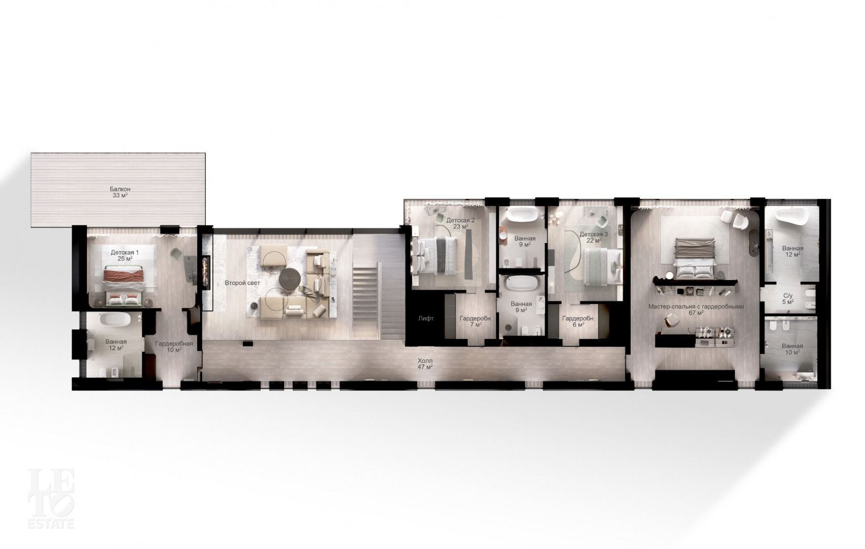 Второй этаж: мастер-спальня с просторной гардеробной и двумя ванными комнатами, спальня с выходом на балкон, ванной и гардеробом, две спальни с ванными и гардеробами.