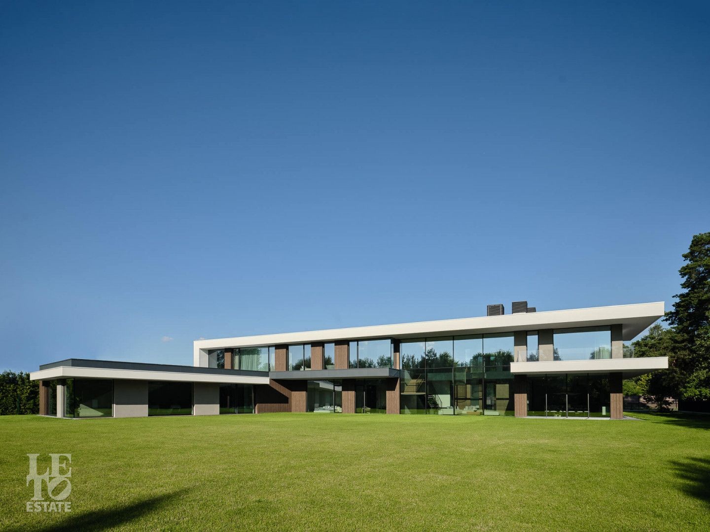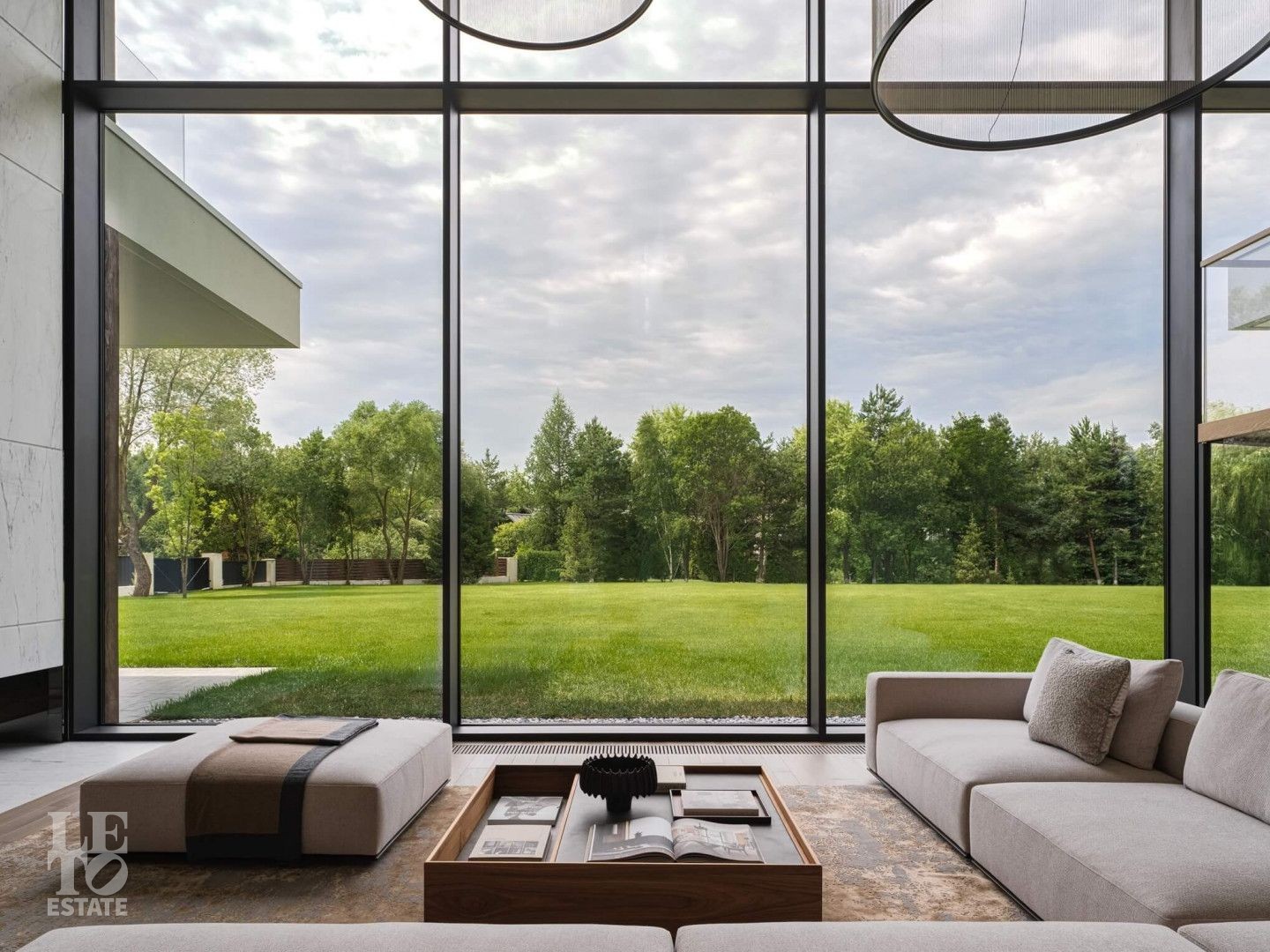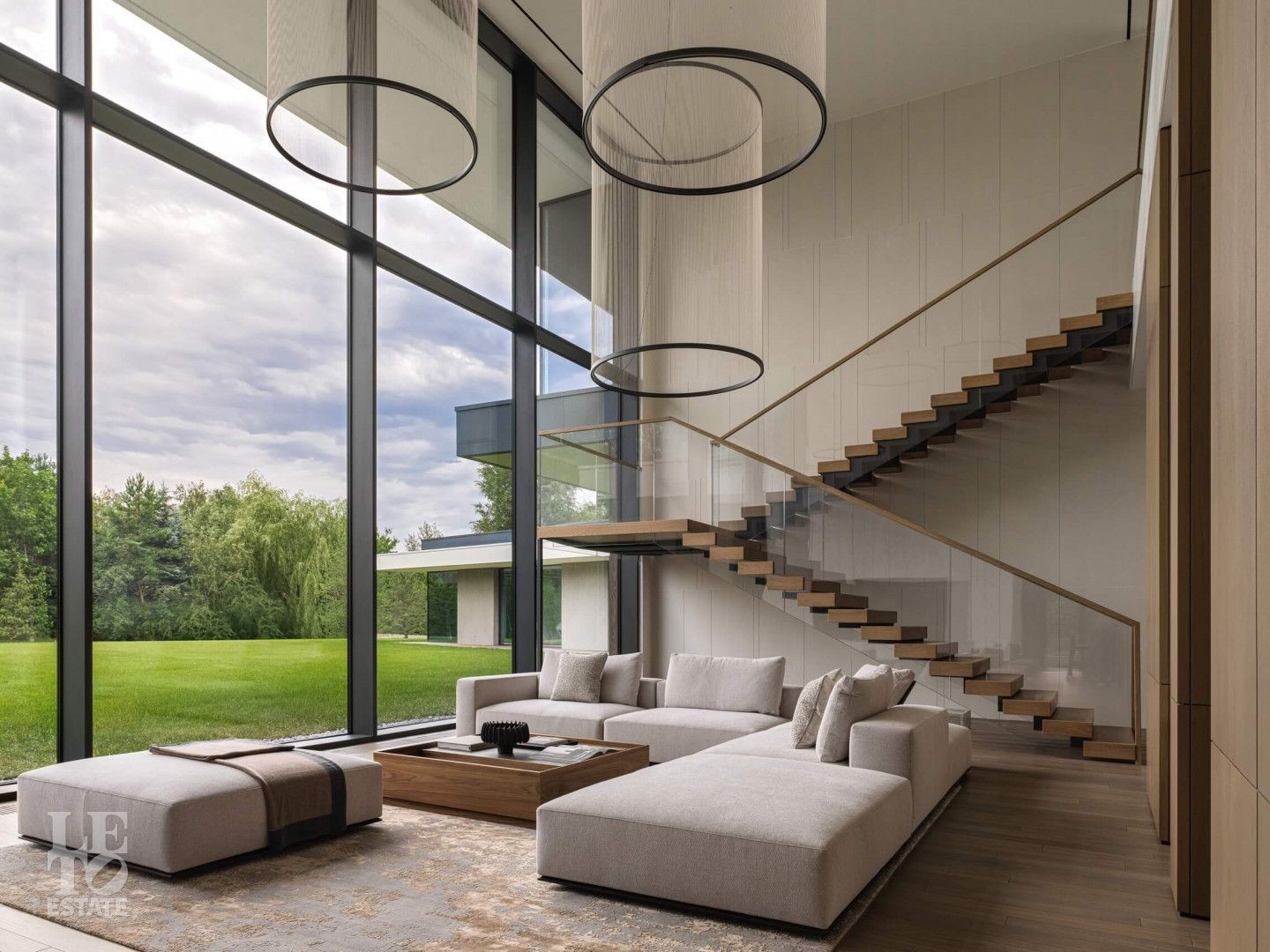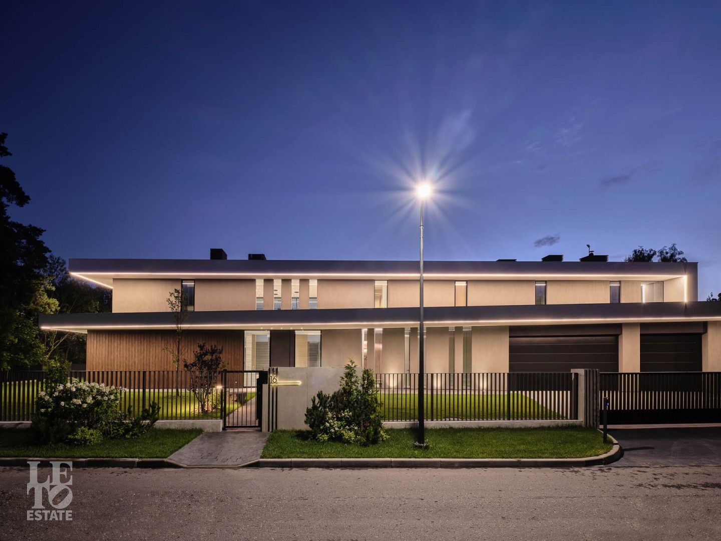 Особенности дома: новый современный дом; панорамные окна в пол; гостиная со вторым светом и высотой потолков 7,35 м; двусторонний камин; лифт; двухмаршевая парящая лестница; спа-комплекс с переливным бассейном 11*4,5 м с противотоком, с джакузи и тропическим душем, с зоной отдыха и безбарьерным выходом на террасу, с сауной, хаммамом и массажным кабинетом; парадная кухня с островом и зоной завтраков на 4 посадочных места; техническая кухня и винная комната; гараж для автомобилей на 3 м/м с с/у и техническим душем и лапомойкой для собак; полная система автоматизации “умный дом”; приточно-вытяжная вентиляция; центральное кондиционирование с возможностью установки системы увлажнения; автономный блок для персонала с 2 спальнями.
