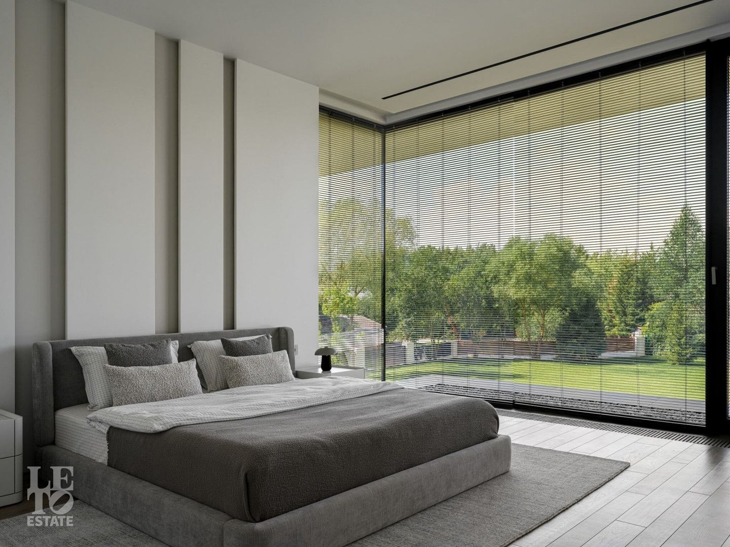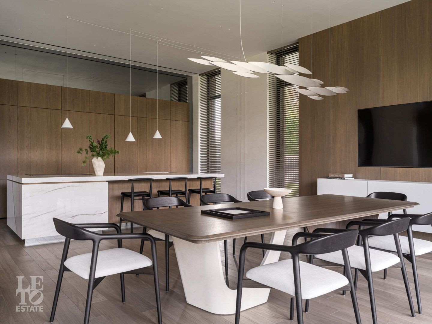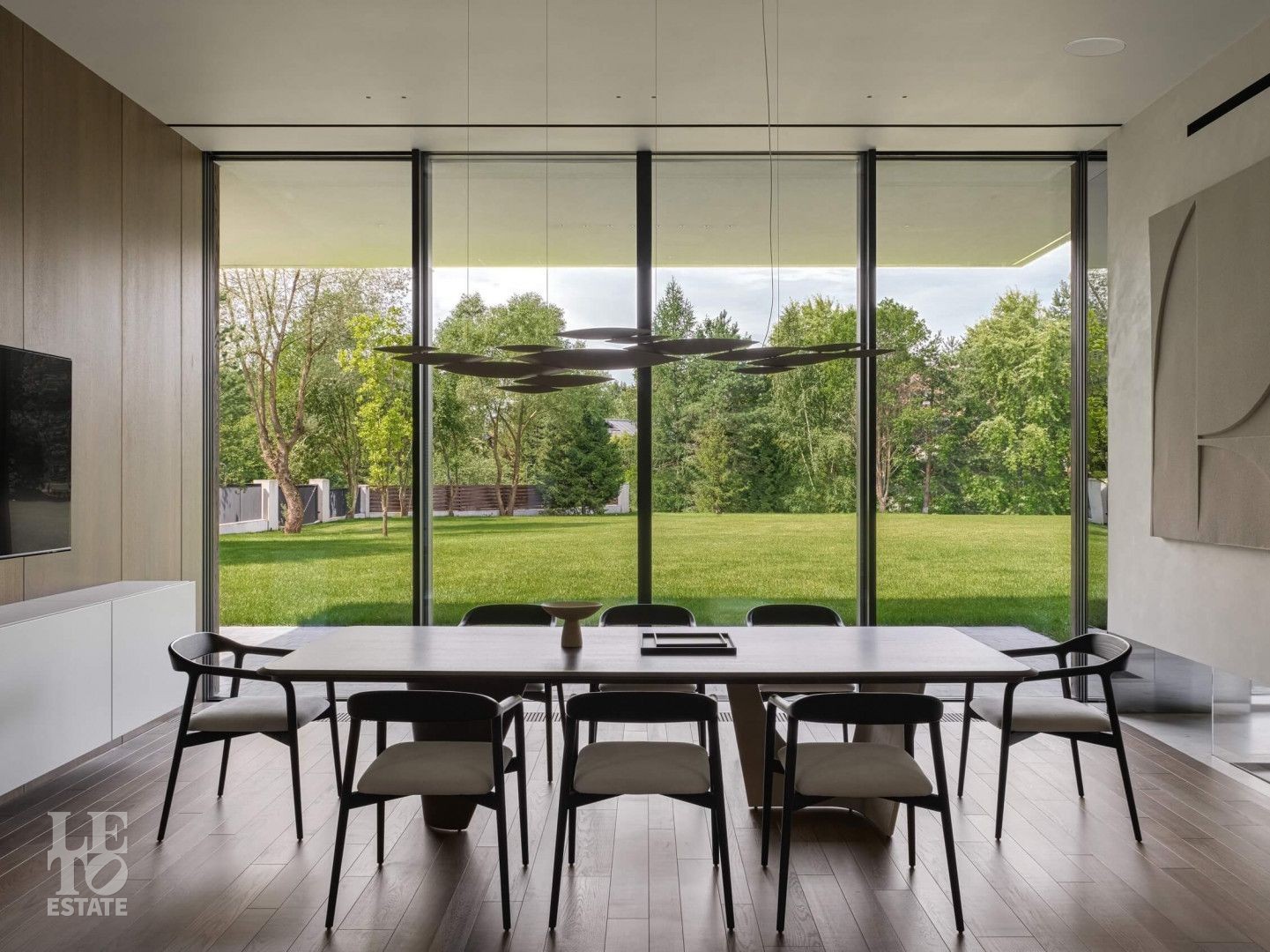 Особенности дома: новый современный дом; панорамные окна в пол; гостиная со вторым светом и высотой потолков 7,35 м; двусторонний камин; лифт; двухмаршевая парящая лестница; спа-комплекс с переливным бассейном 11*4,5 м с противотоком, с джакузи и тропическим душем, с зоной отдыха и безбарьерным выходом на террасу, с сауной, хаммамом и массажным кабинетом; парадная кухня с островом и зоной завтраков на 4 посадочных места; техническая кухня и винная комната; гараж для автомобилей на 3 м/м с с/у и техническим душем и лапомойкой для собак; полная система автоматизации “умный дом”; приточно-вытяжная вентиляция; центральное кондиционирование с возможностью установки системы увлажнения; автономный блок для персонала с 2 спальнями.