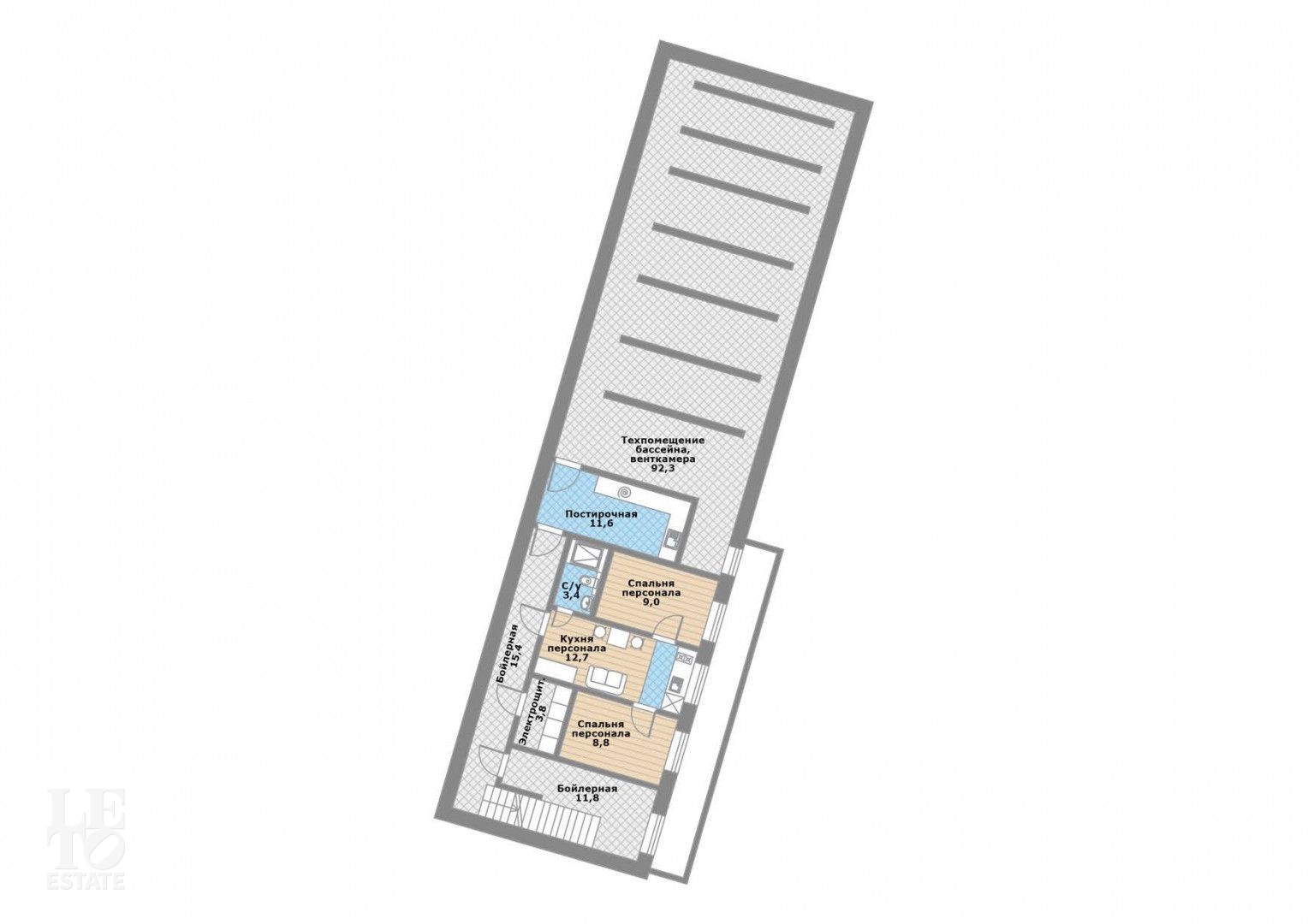 Цокольный этаж: блок персонала (кухня, санузел, две спальни), две бойлерные, электрощитовая, постирочная, венткамера, техническое помещение бассейна;