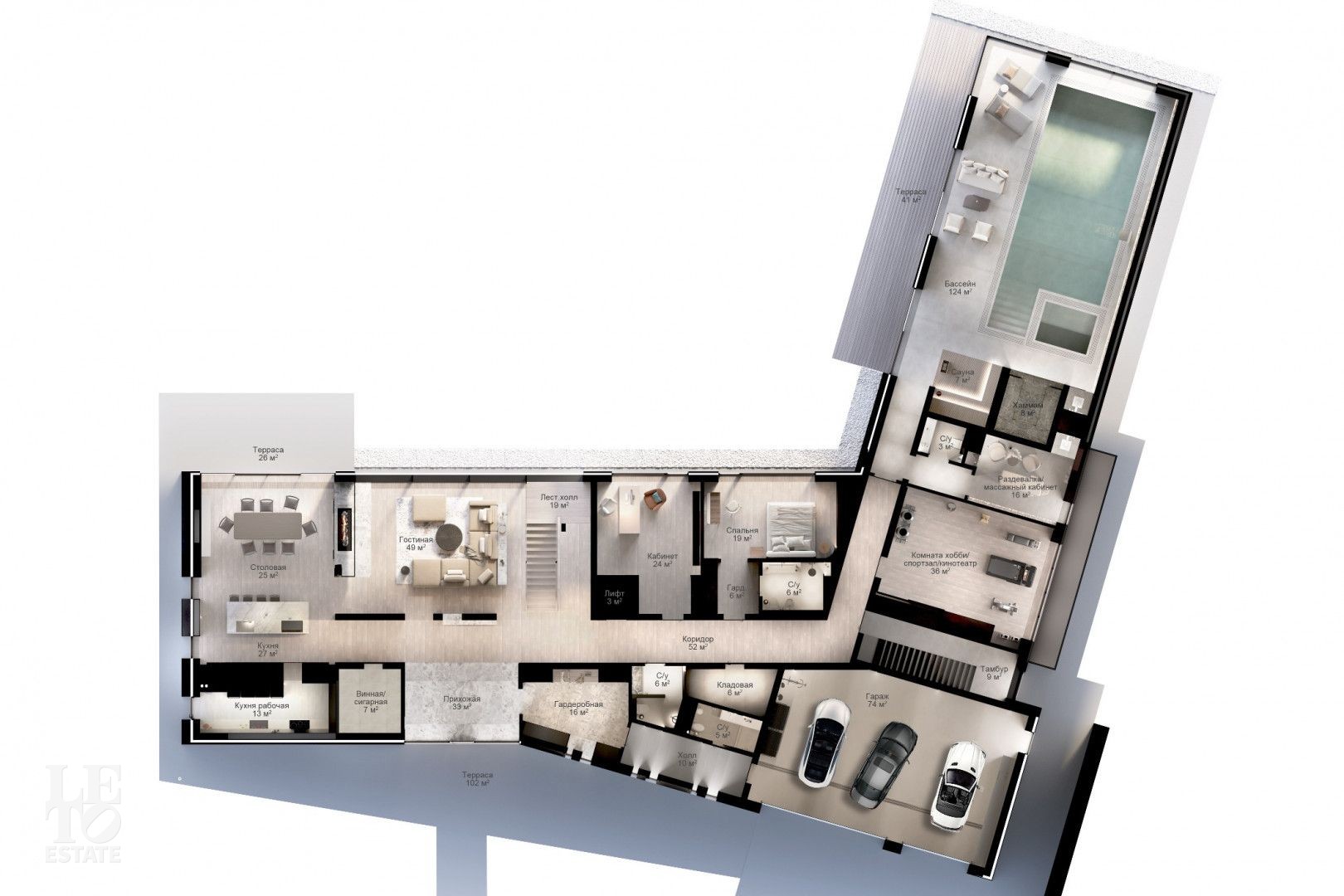 Первый этаж: прихожая с гардеробной, гостиная, столовая с выходом на террасу, парадная кухня, техническая кухня с отдельным входом с улицы, винная или сигарная комната, кабинет, гостевая спальня с гардеробом и ванной комнатой, хобби-комната, гараж на 3 машиноместа со входом в дом через холл, санузел с техническим душем, терраса, СПА-комплекс (бассейн с выходом на террасу, сауна, хаммам, массажный кабинет и раздевалка с душем, санузел), кладовая, гостевой санузел;