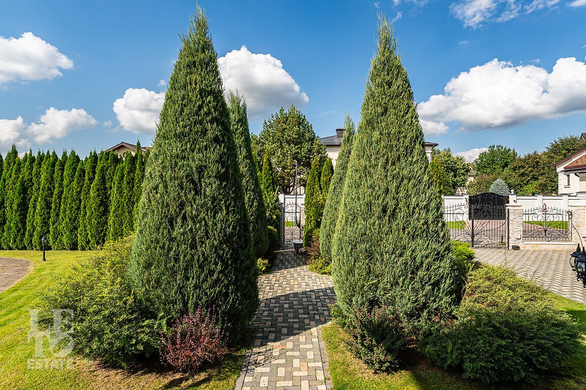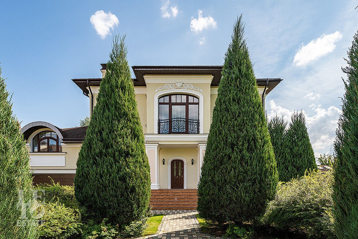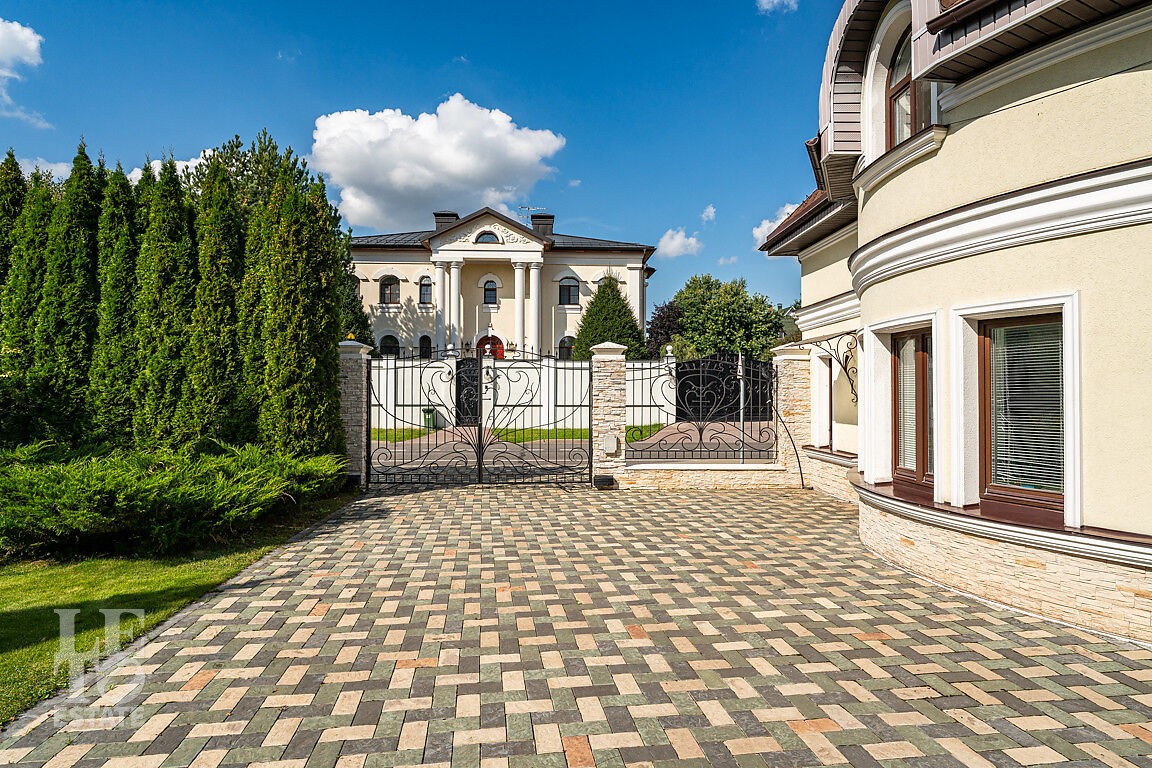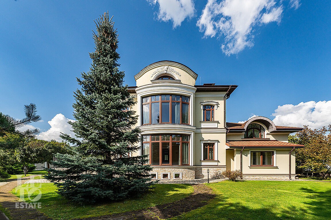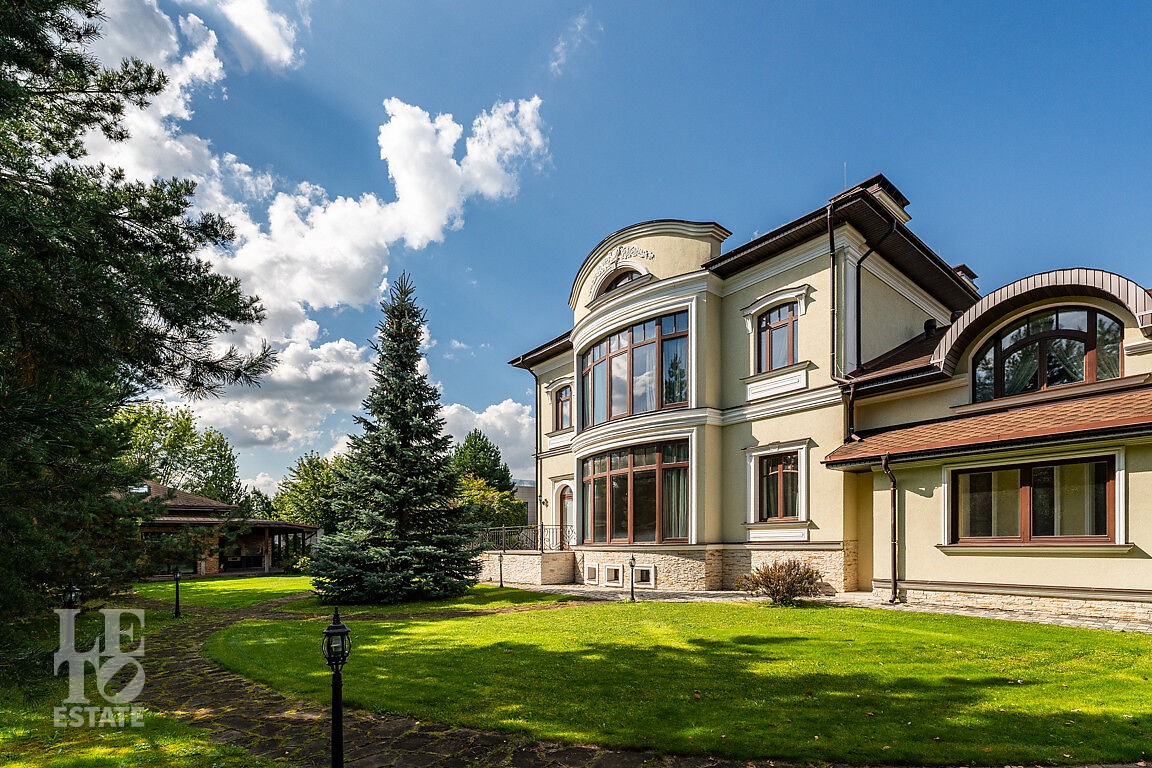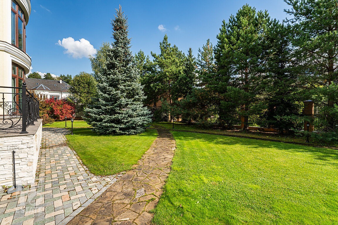 Особняк в классическом стиле в элитном посёлке Никольская Слобода. На участке выполнен ландшафтный дизайн, вымощены дорожки, установлено уличное освещение, ухоженный газон. На участке также расположены: теплая зона барбекю с террасой, дом для персонала.