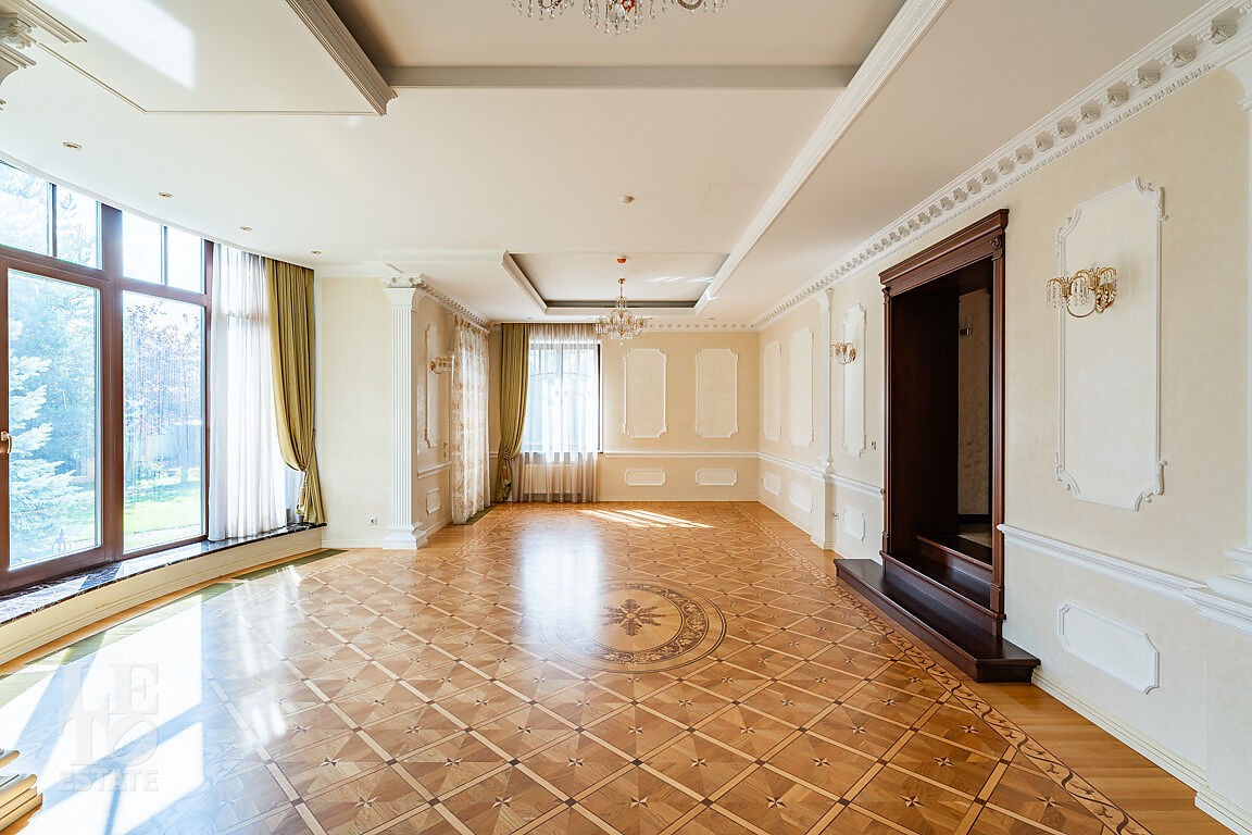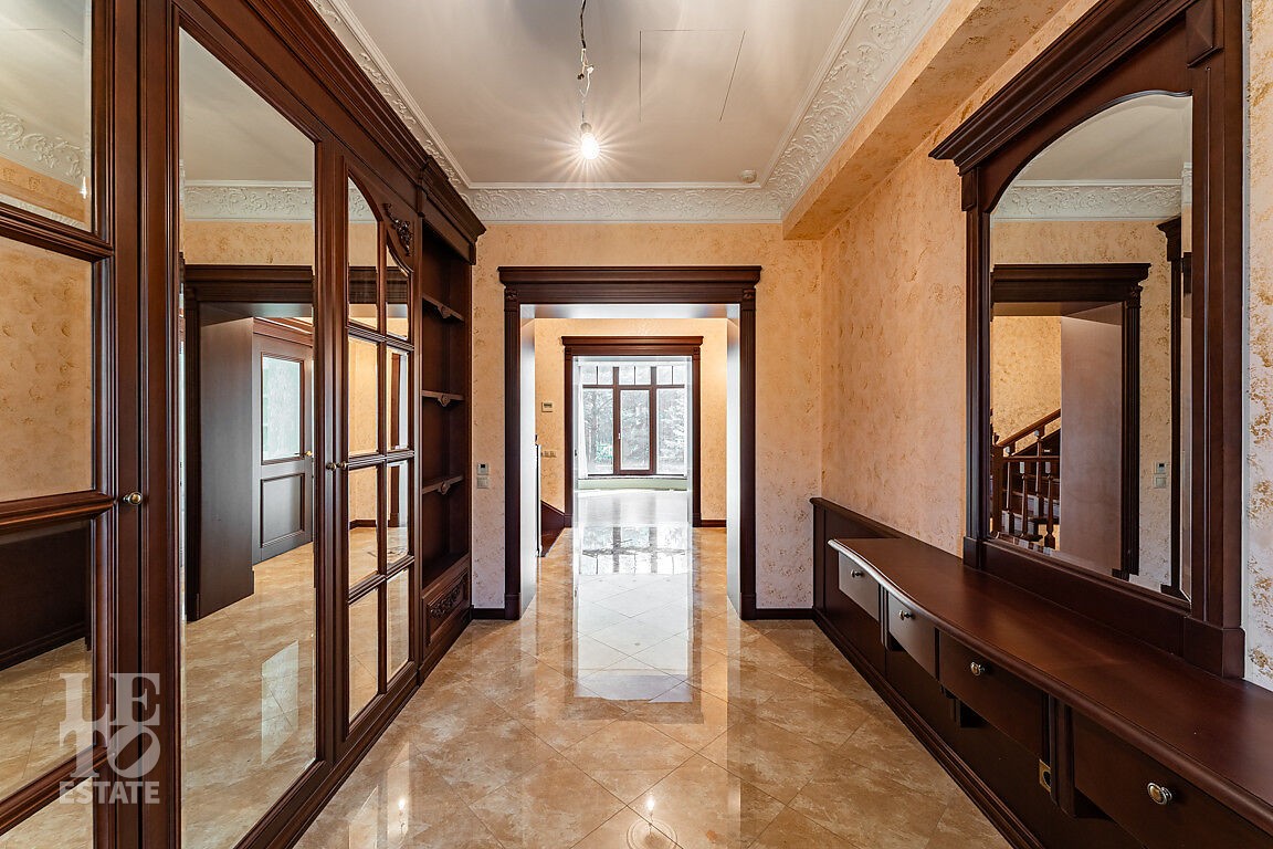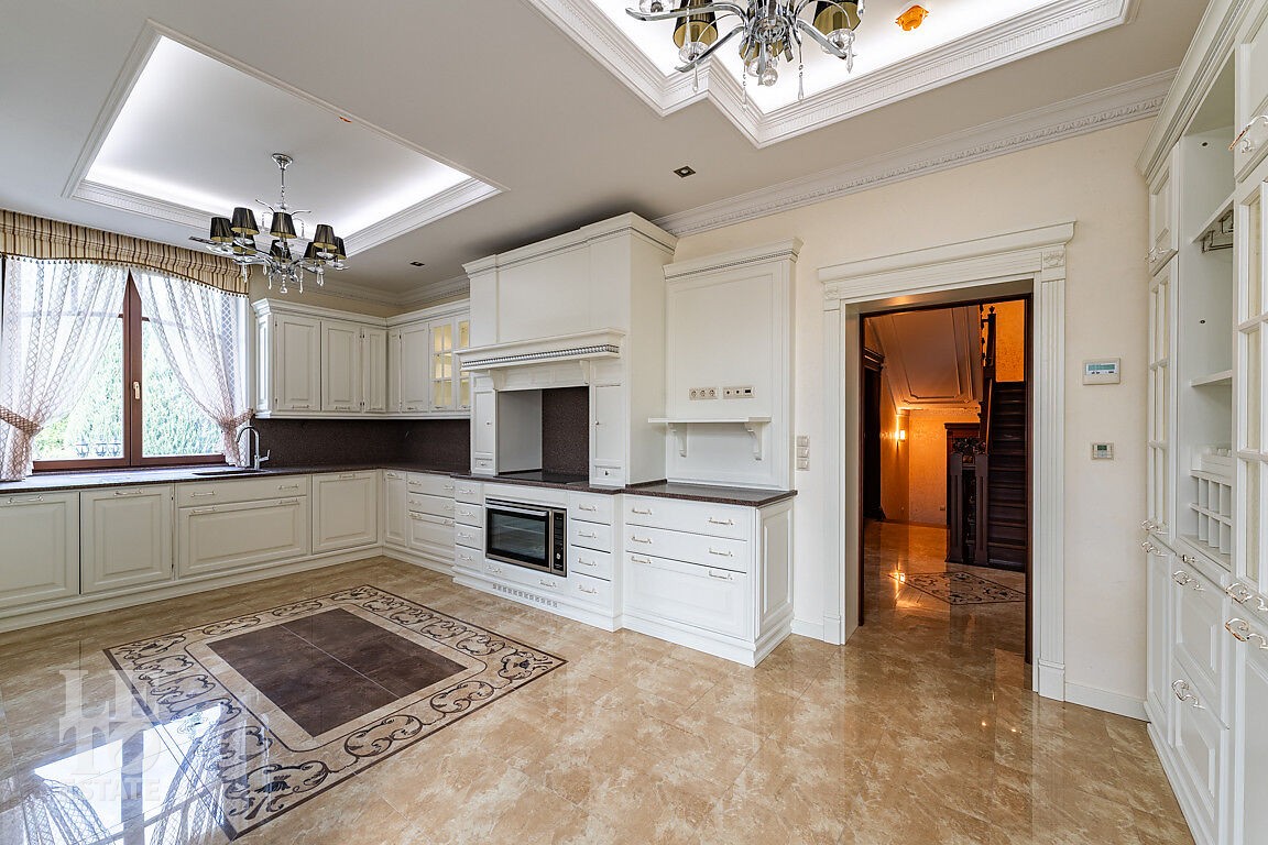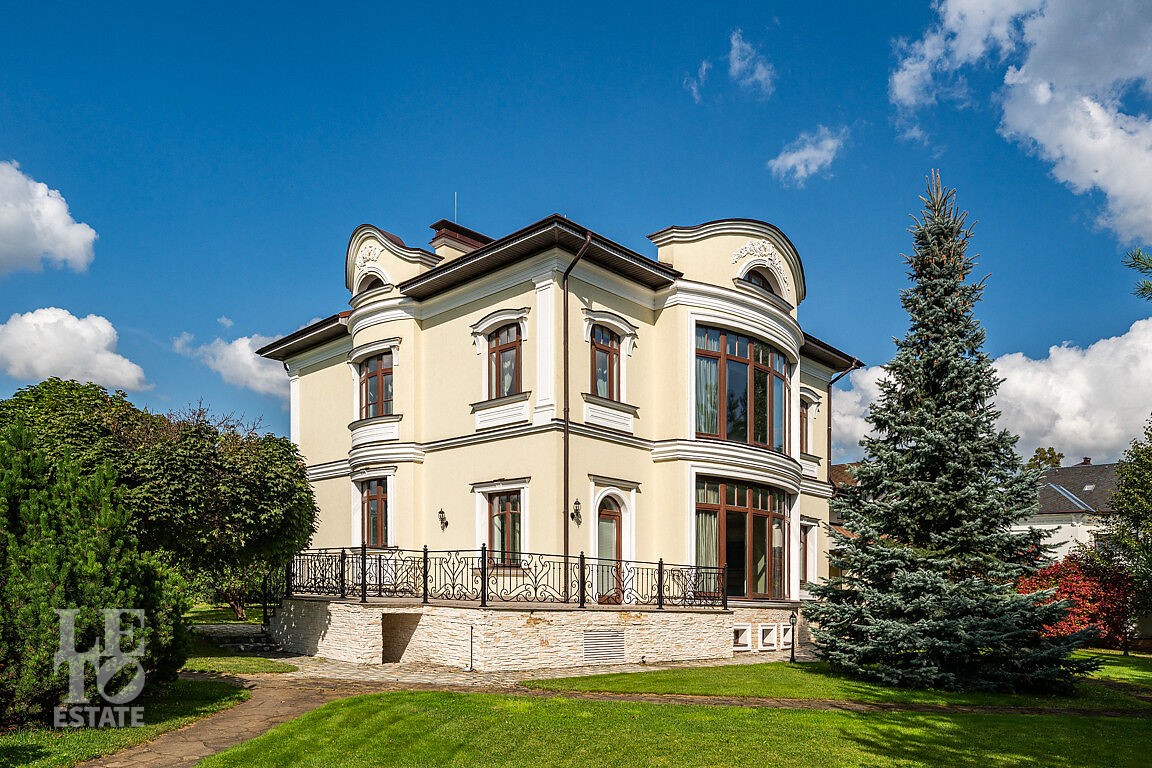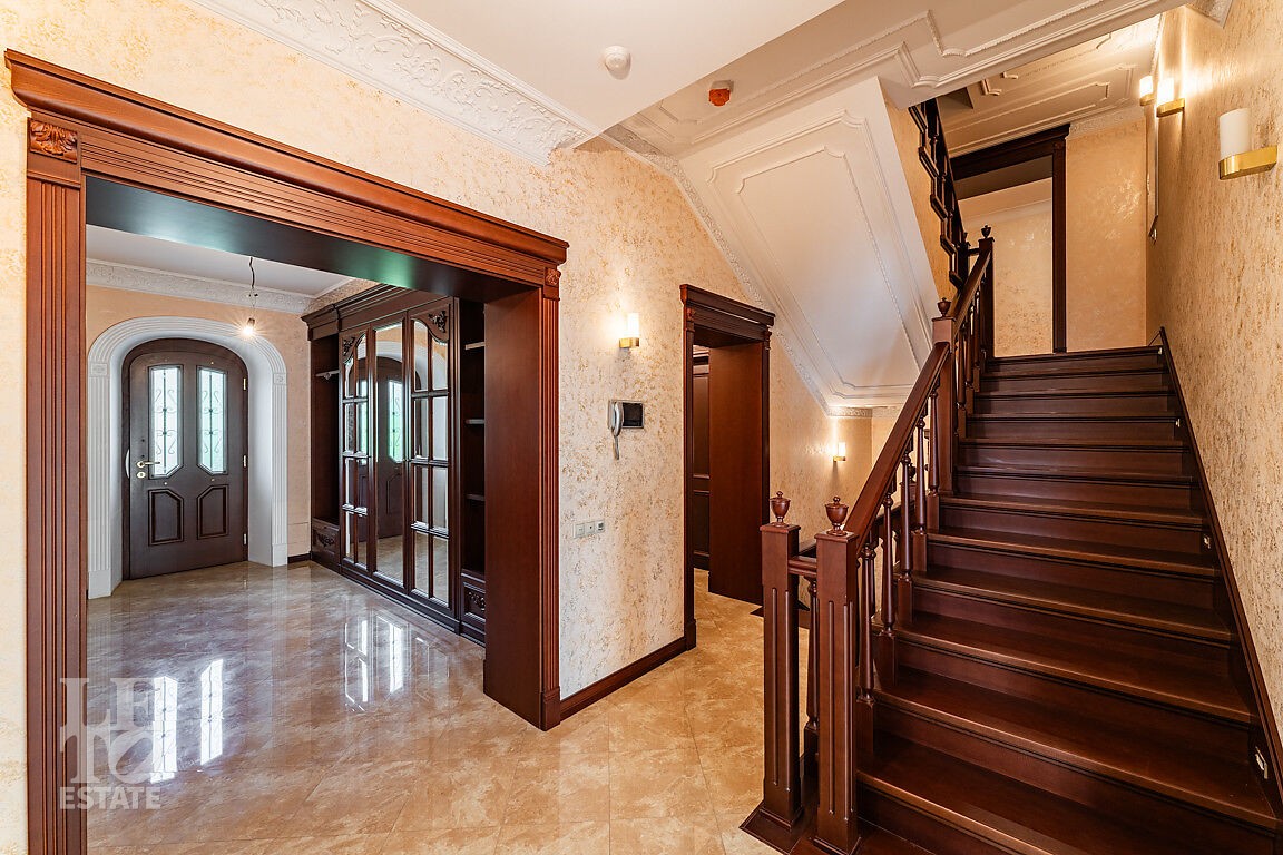 Особняк в классическом стиле в элитном посёлке Никольская Слобода. На участке выполнен ландшафтный дизайн, вымощены дорожки, установлено уличное освещение, ухоженный газон. На участке также расположены: теплая зона барбекю с террасой, дом для персонала.