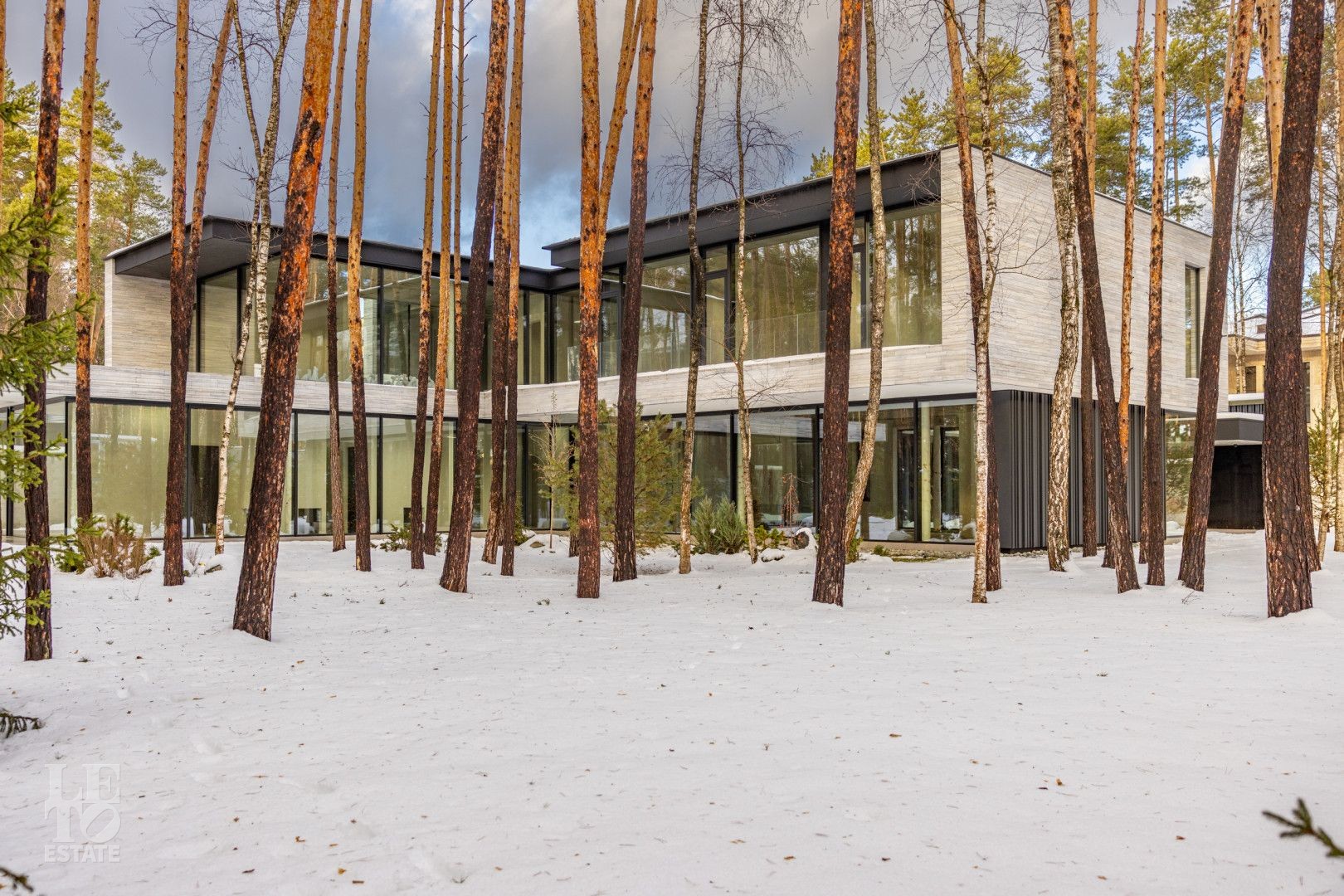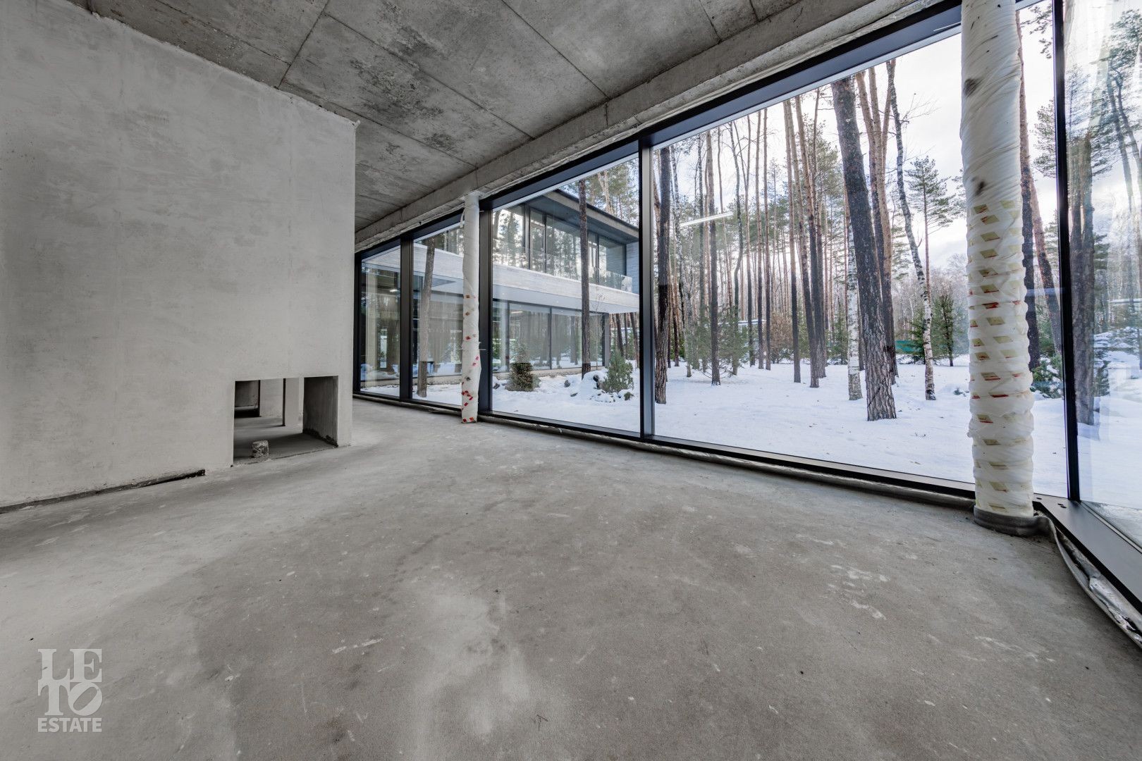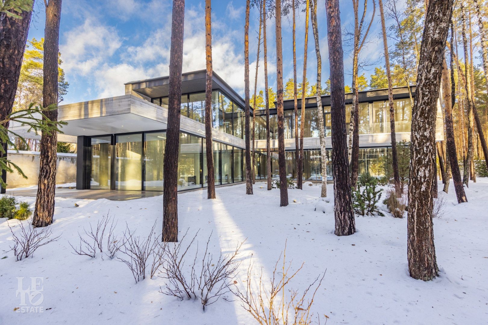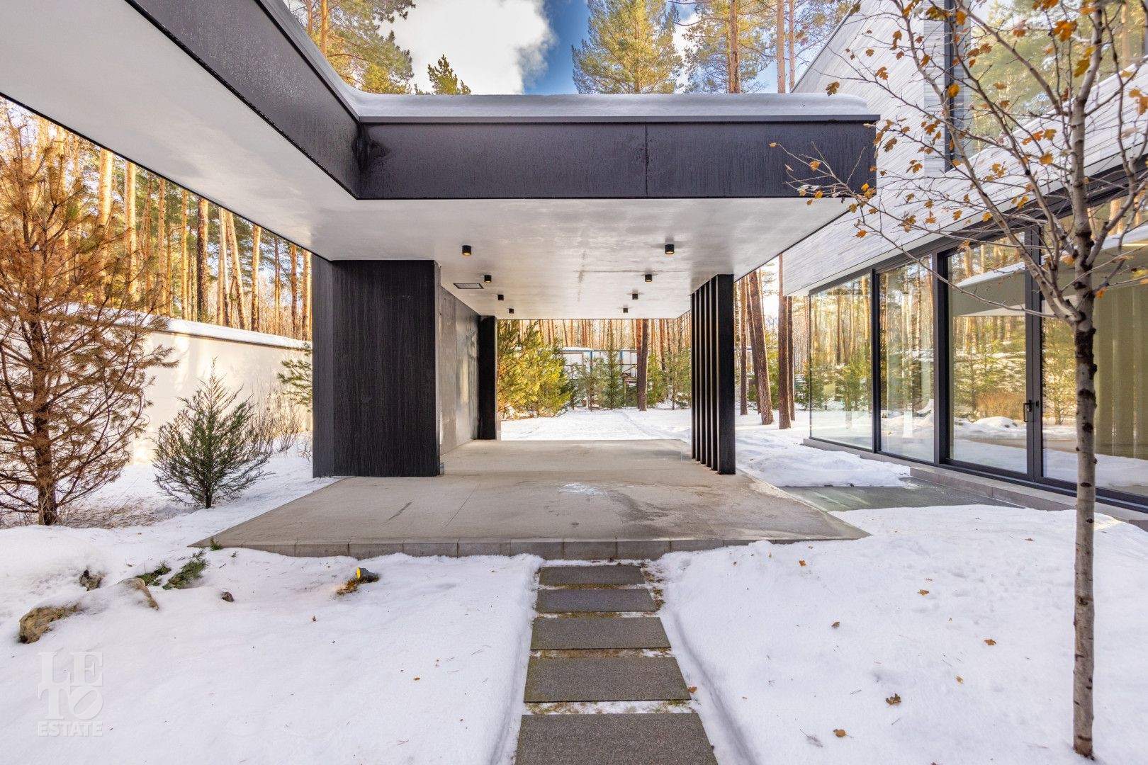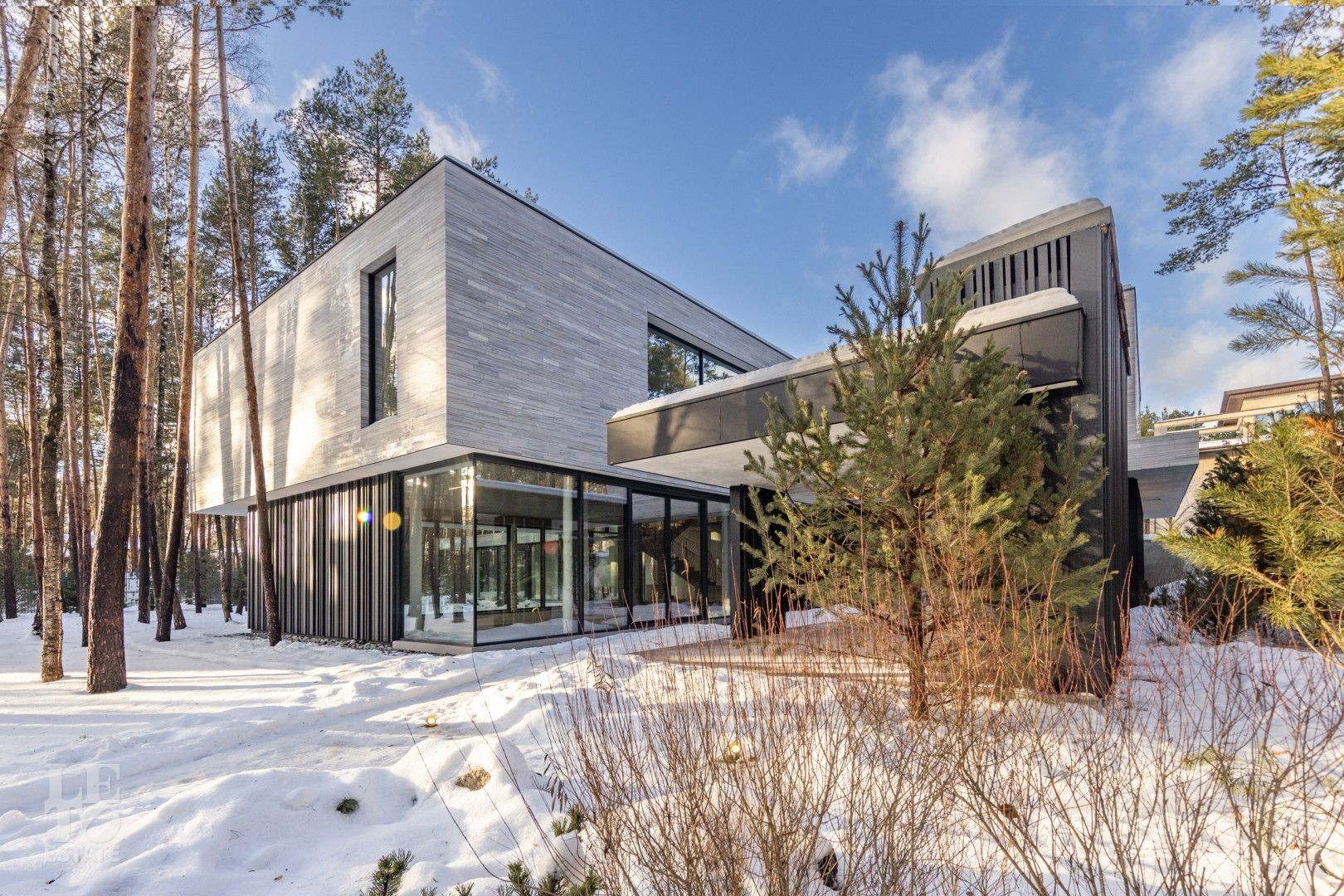Особенности дома: ультрасовременная архитектура, панорамные окна (остекление занимает 50% площади фасада), по настоящему лесной участок, высокие потолки (после отделки: 3,2-3,7 м) и межкомнатные двери (до 2,6 м в основных помещениях). Полностью завершены фасадные и ландшафтные работы.