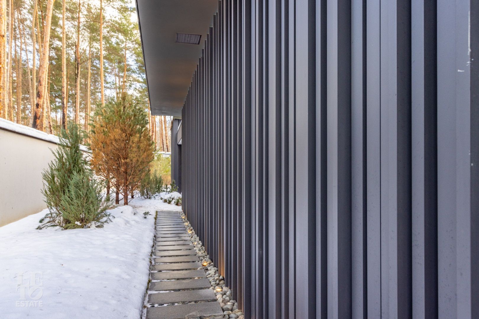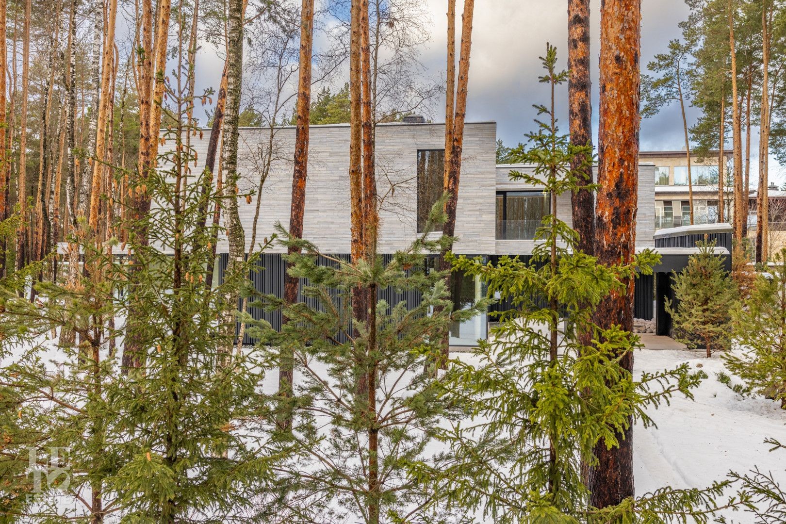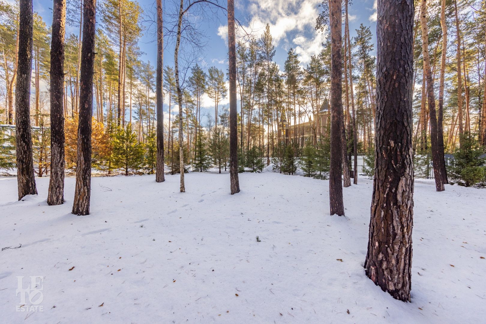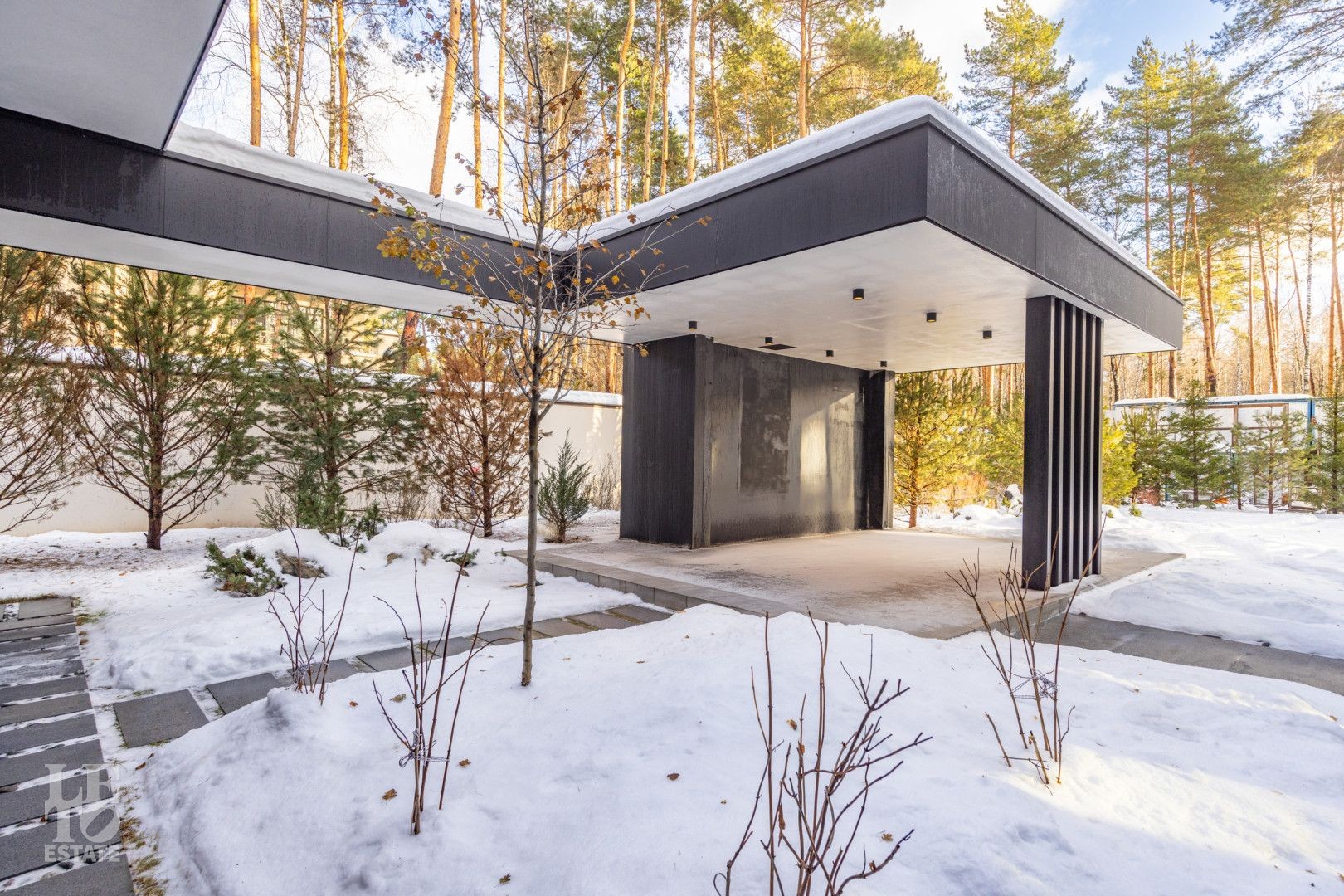 Дом построен на территории соснового бора на участке 30 соток и исключительно скрупулезно вписан в ландшафт: сохранено максимальное количество вековых деревьев, эко система не нарушена. Дополнительно высажено 350 деревьев и кустарников: горные сосны, можжевельники, ёлки 4-6 м высотой, рябина, папоротники, уникальная 2 раза в год цветущая сирень и украшение входной группы - дерево Ниваки. На участке выполнен дренаж и подсветка растений и фасада.