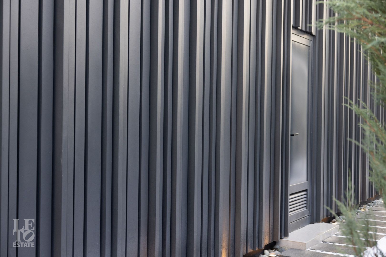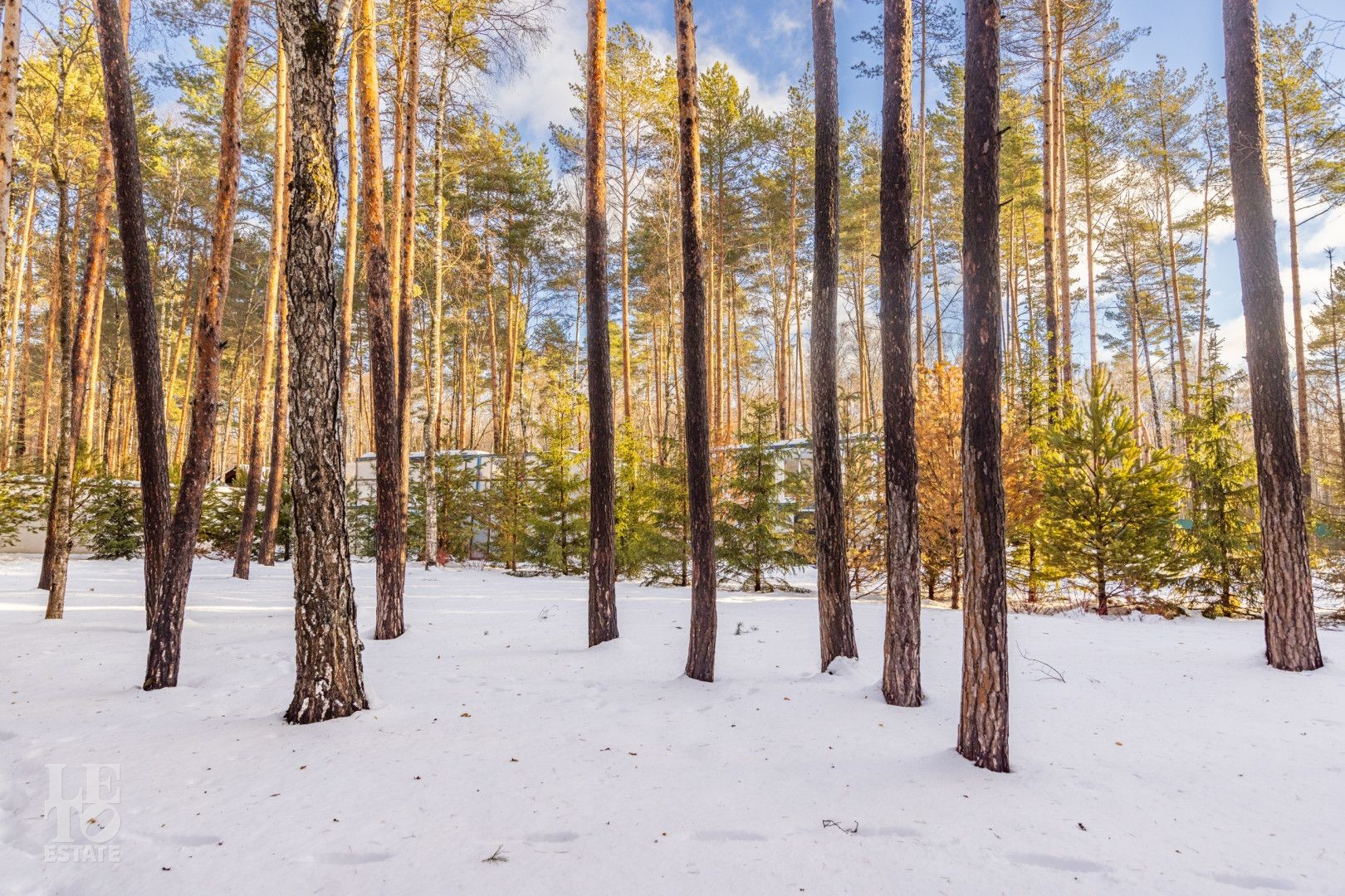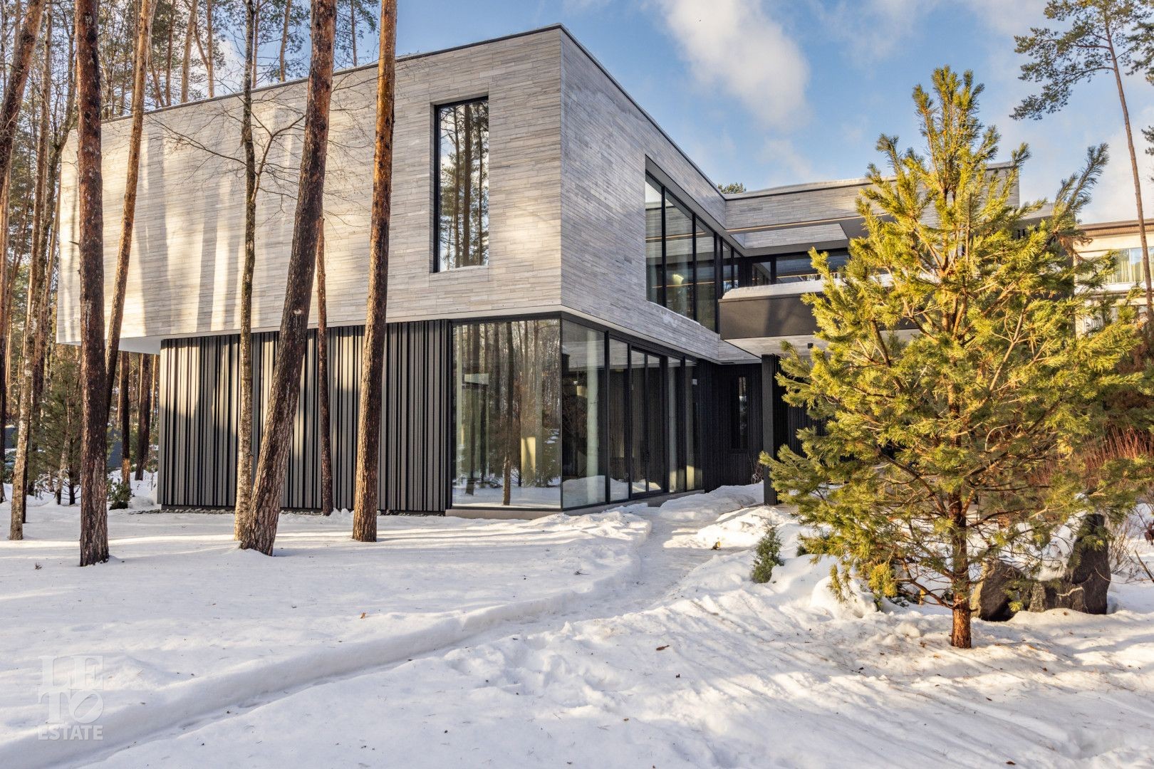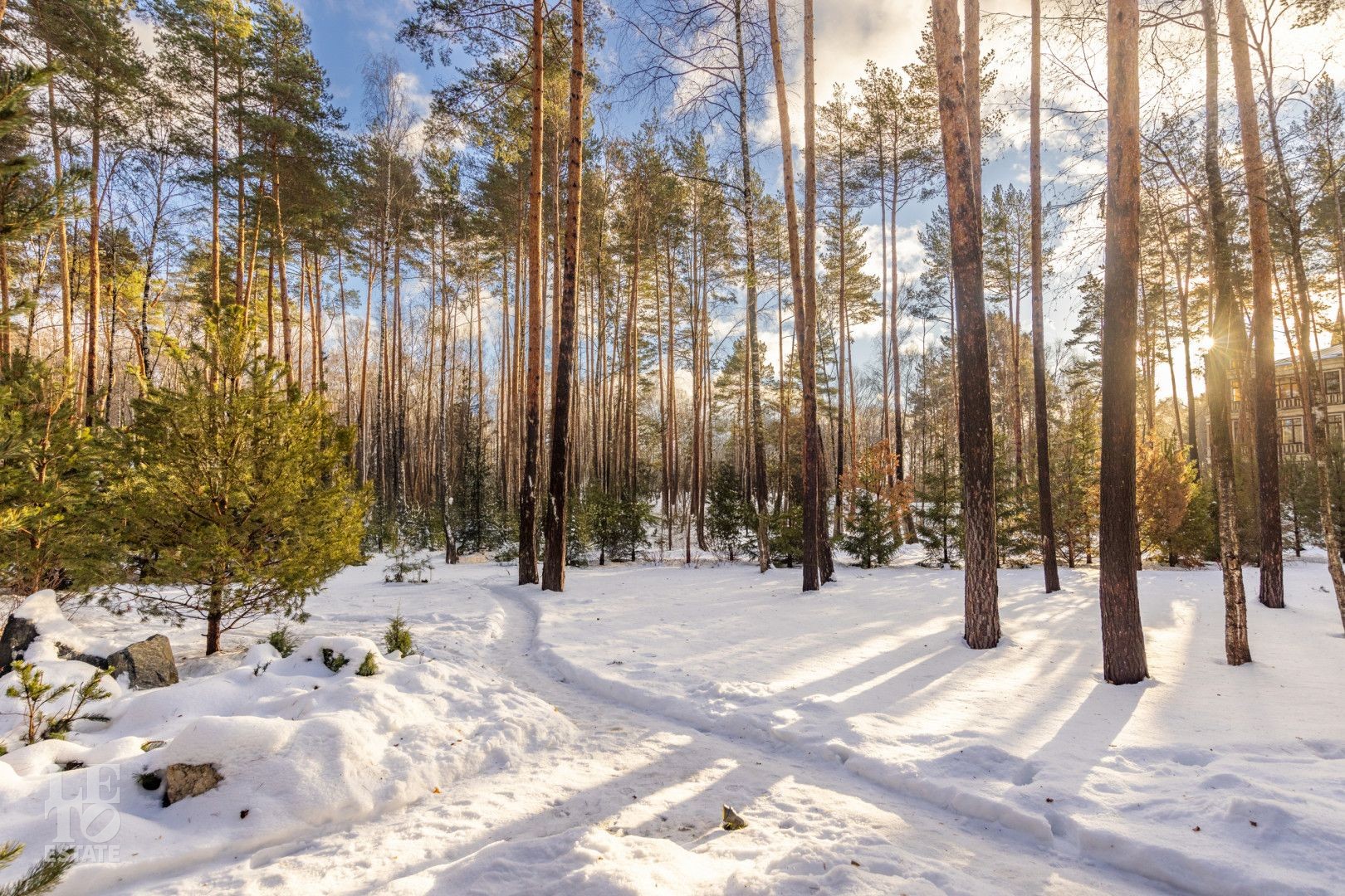 Дом построен на территории соснового бора на участке 30 соток и исключительно скрупулезно вписан в ландшафт: сохранено максимальное количество вековых деревьев, эко система не нарушена. Дополнительно высажено 350 деревьев и кустарников: горные сосны, можжевельники, ёлки 4-6 м высотой, рябина, папоротники, уникальная 2 раза в год цветущая сирень и украшение входной группы - дерево Ниваки. На участке выполнен дренаж и подсветка растений и фасада.