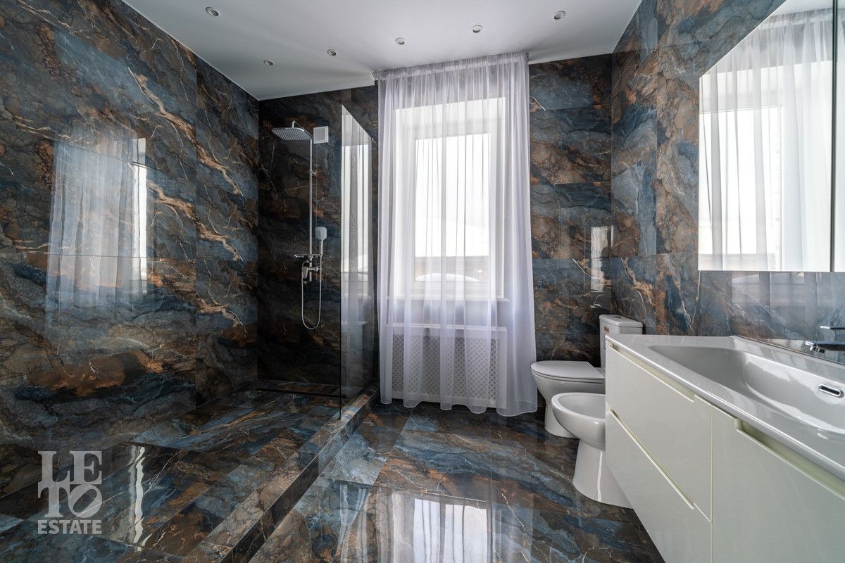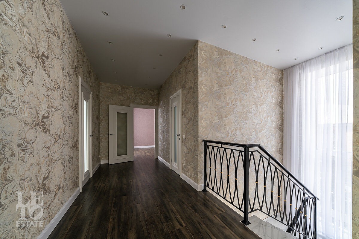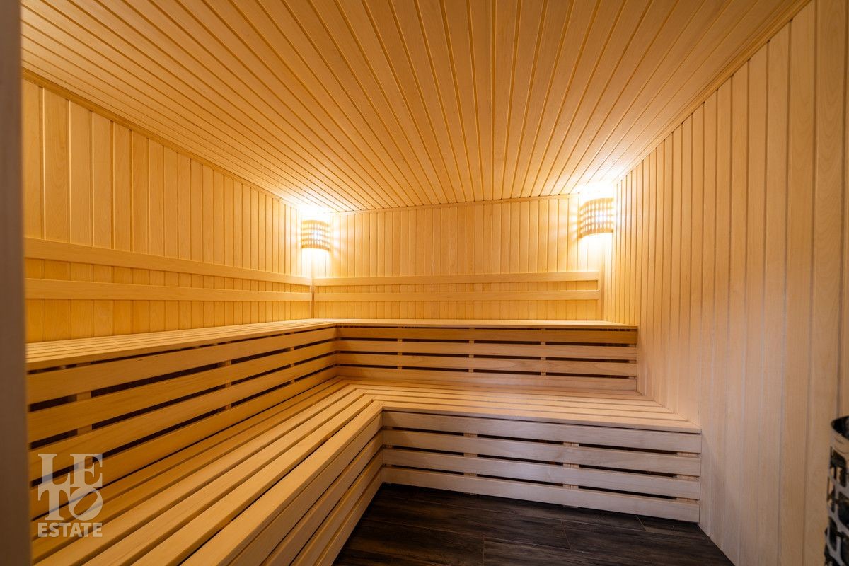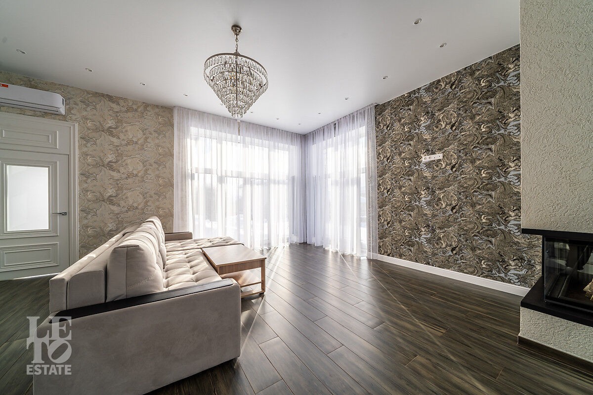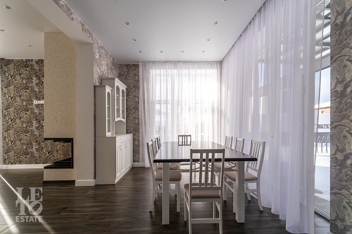 В доме просторная светлая гостиная - столовая с камином и выходом из столовой на террасу. Панорамное остекление создает ощущение дополнительного пространства и света. В доме установлены система кондиционирования и система теплого пола на всех этажах. СПА-зона с сауной и комнатой отдыха расположена на цокольном этаже.
