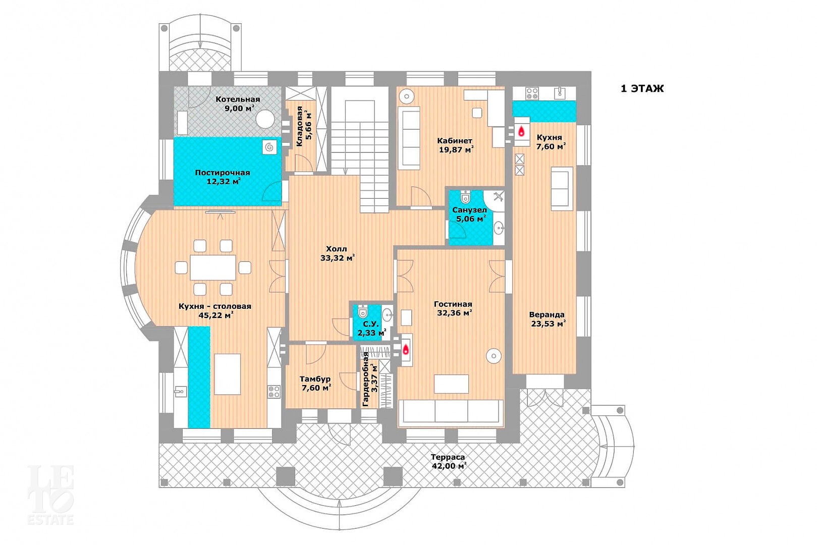 Первый этаж: тамбур, гардеробная, холл, кухня-столовая, гостиная с камином, спальня/кабинет, малая кухня с печью с верандой и выходом на террасу, с/у, постирочная, котельная, кладовая.