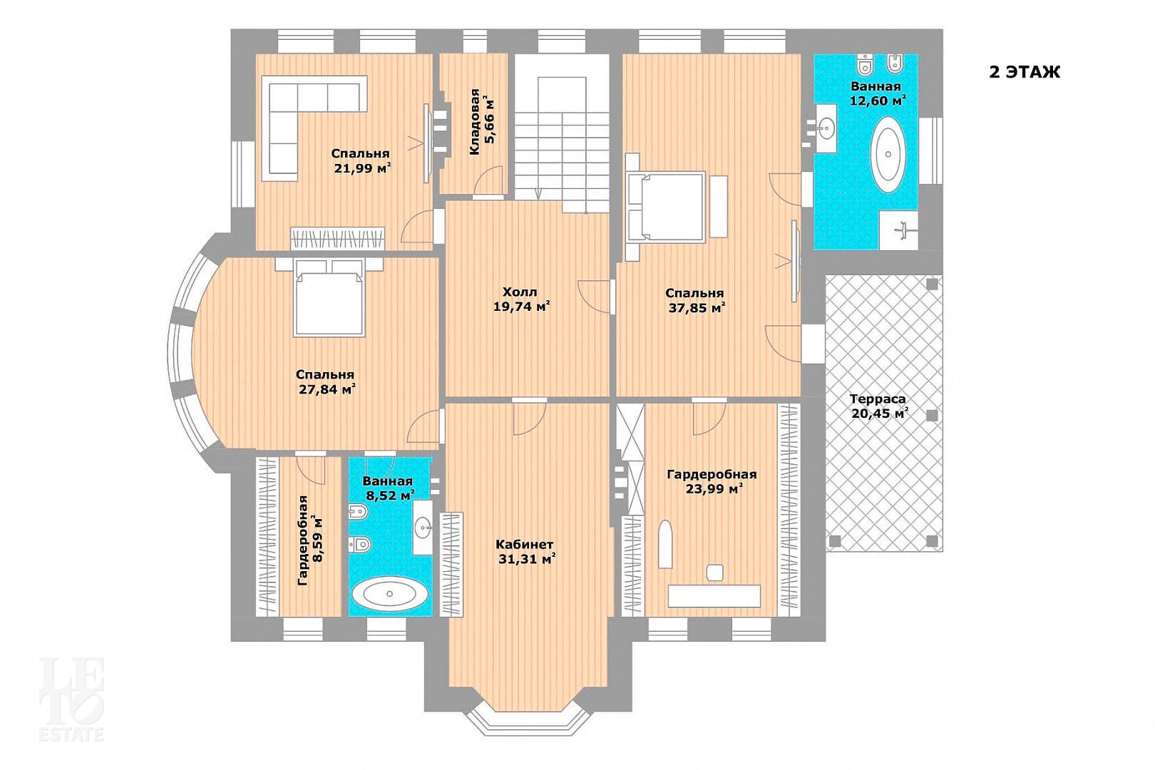 Второй этаж: мастер-спальня №1 с ванной, гардеробной и выходом на террасу, мастер-спальня №2 с ванной и гардеробной, 2 детские, кладовая, холл.