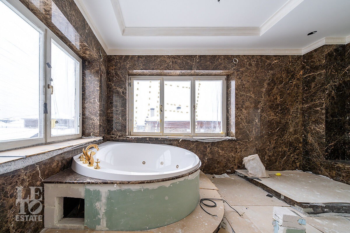 В основном доме частично выполнена финишная отделка. Установлены деревянные окна, мраморные подоконники.