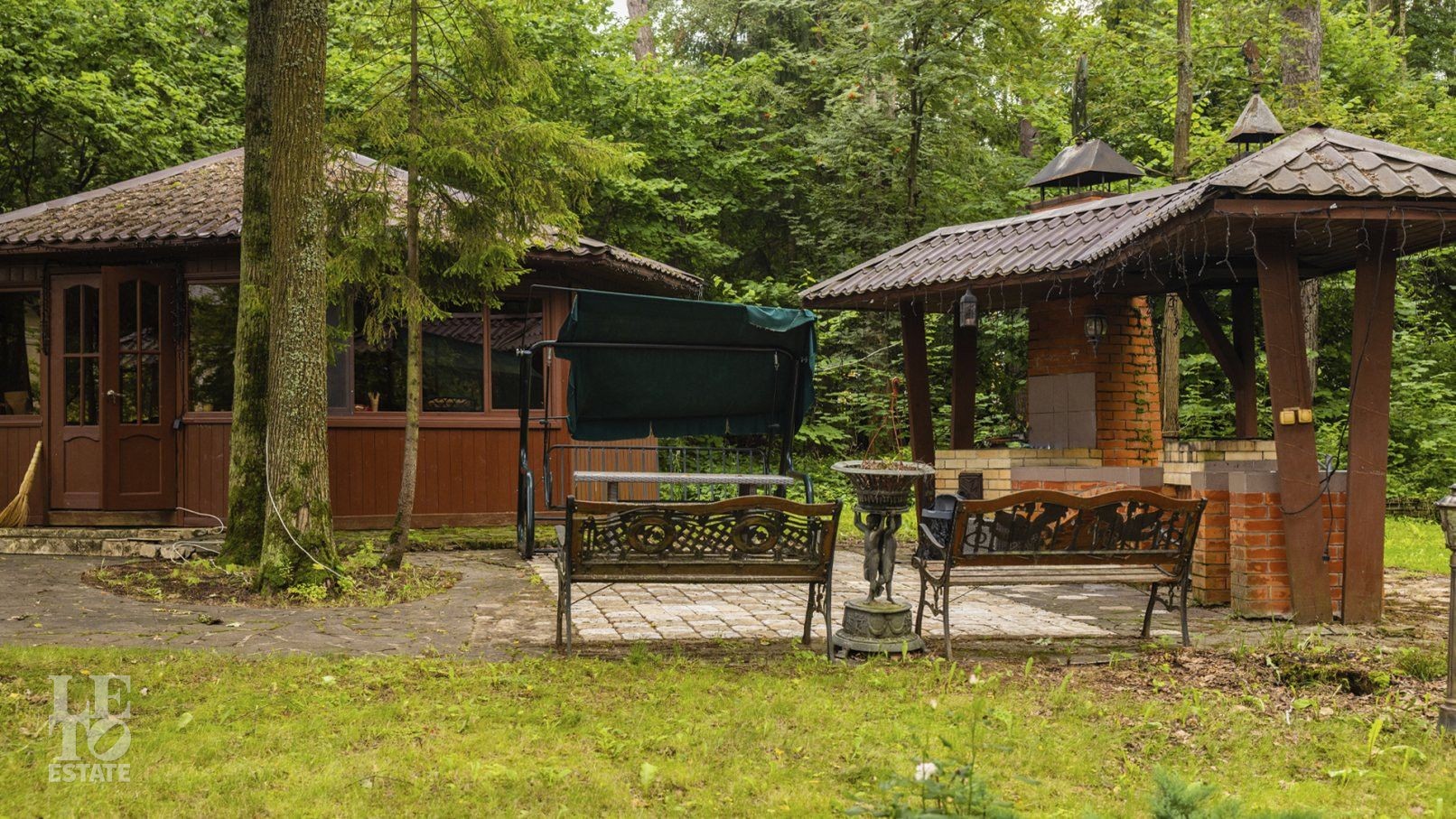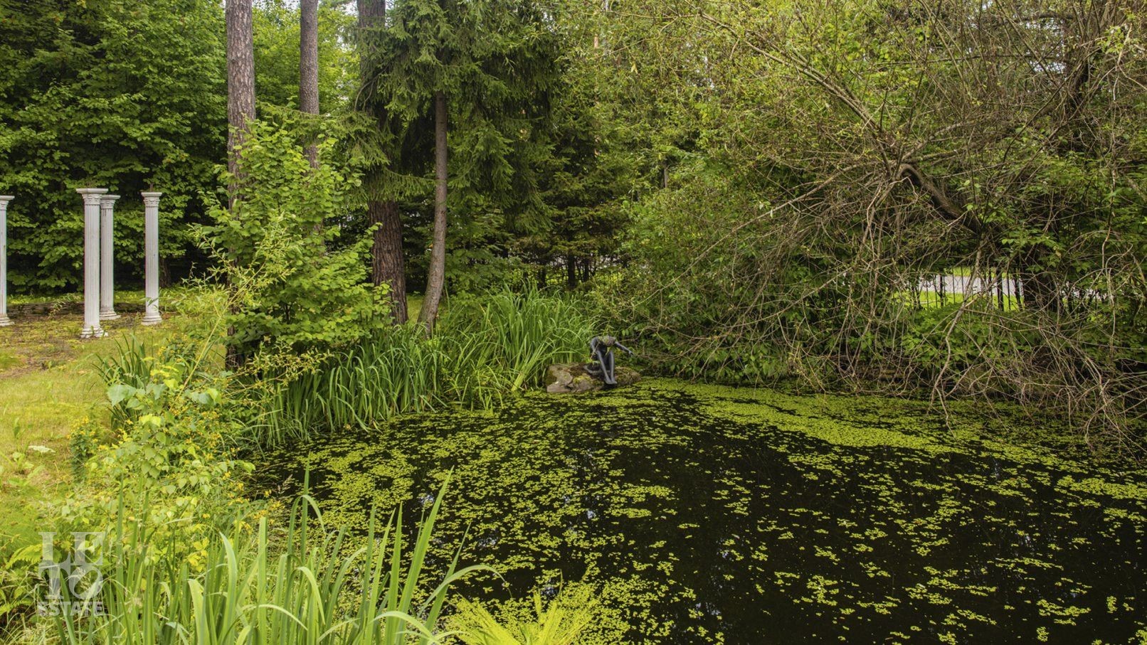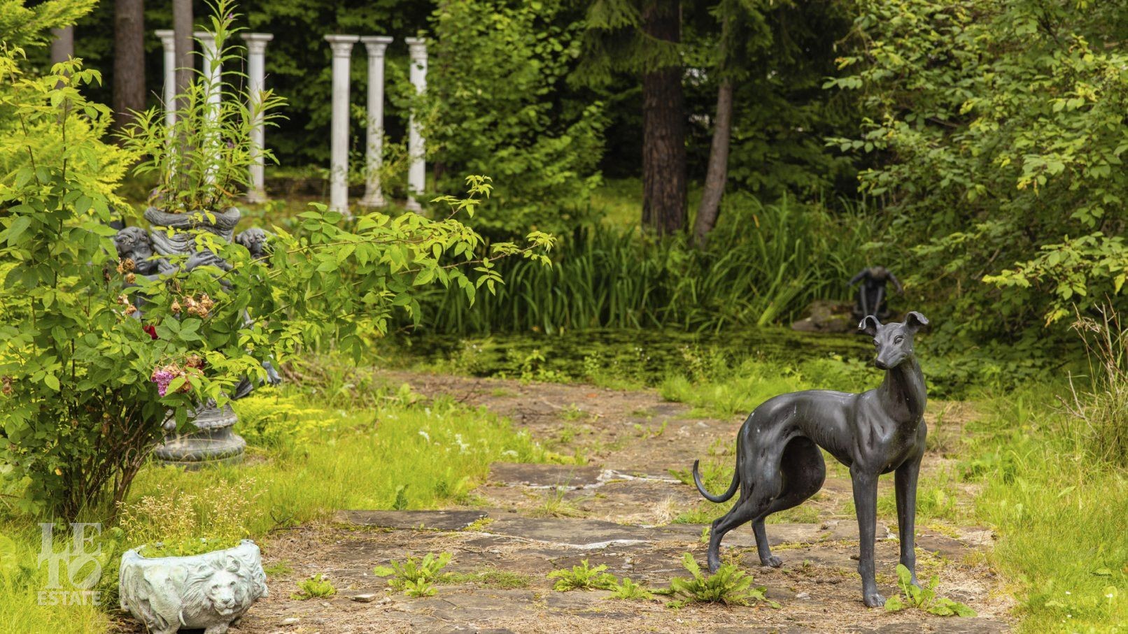 Дополнительно предусмотрен отдельный гараж на 3 машины. Участок с прудом оформлен в едином ландшафтном стиле — проложены дорожки, установлено декоративное освещение, обустроены беседка с зоной барбекю и детская площадка.