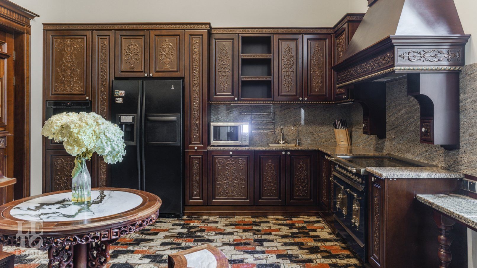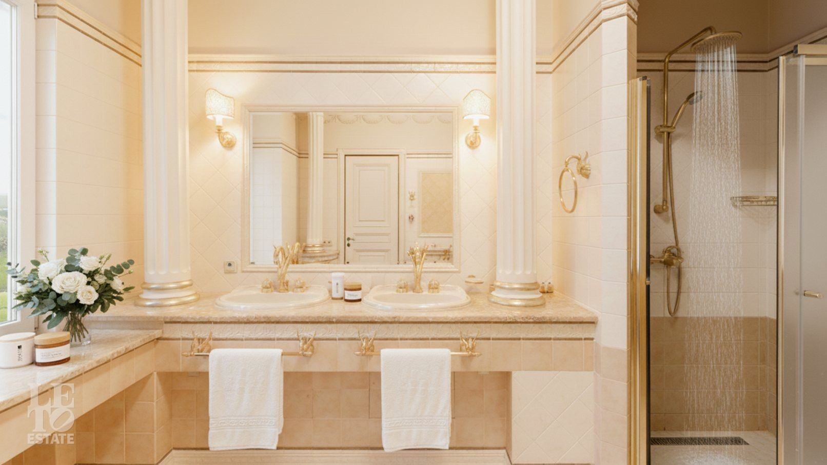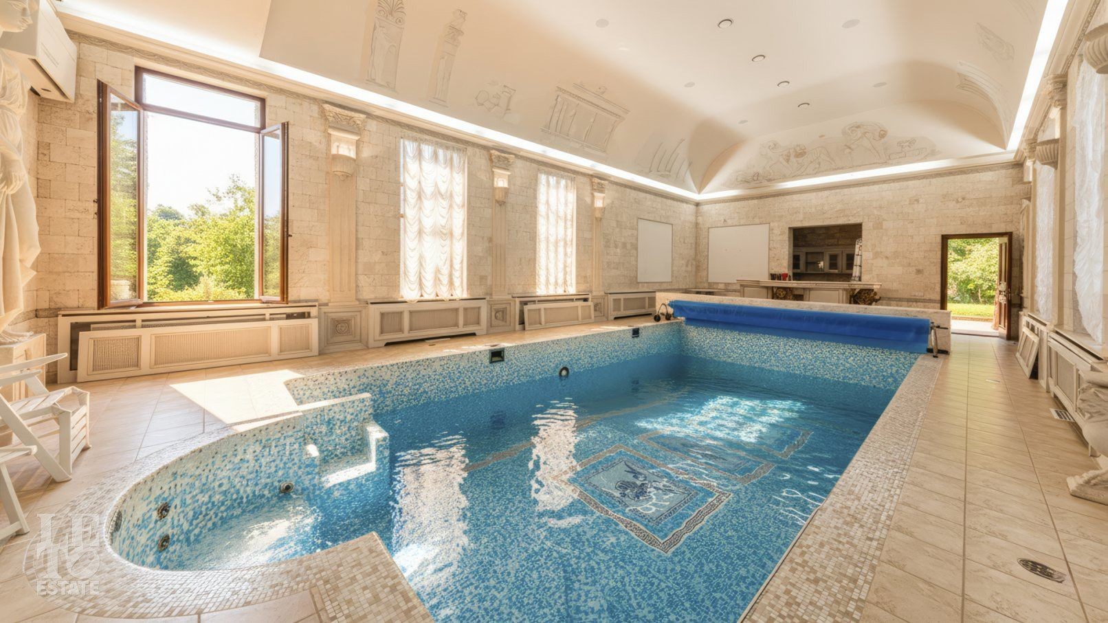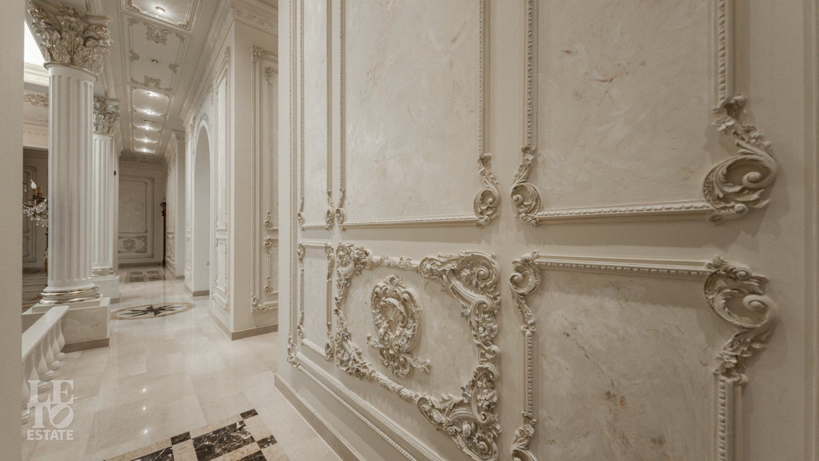 Внутреннее пространство включает 6 спален, гостиную с камином, кухню, столовую, кабинет, кинотеатр, бассейн и сауну. Симметрию ансамбля поддерживают 2 колоннады, завершённые зданиями с отапливаемыми гаражами на 2 автомобиля и квартирой для персонала.