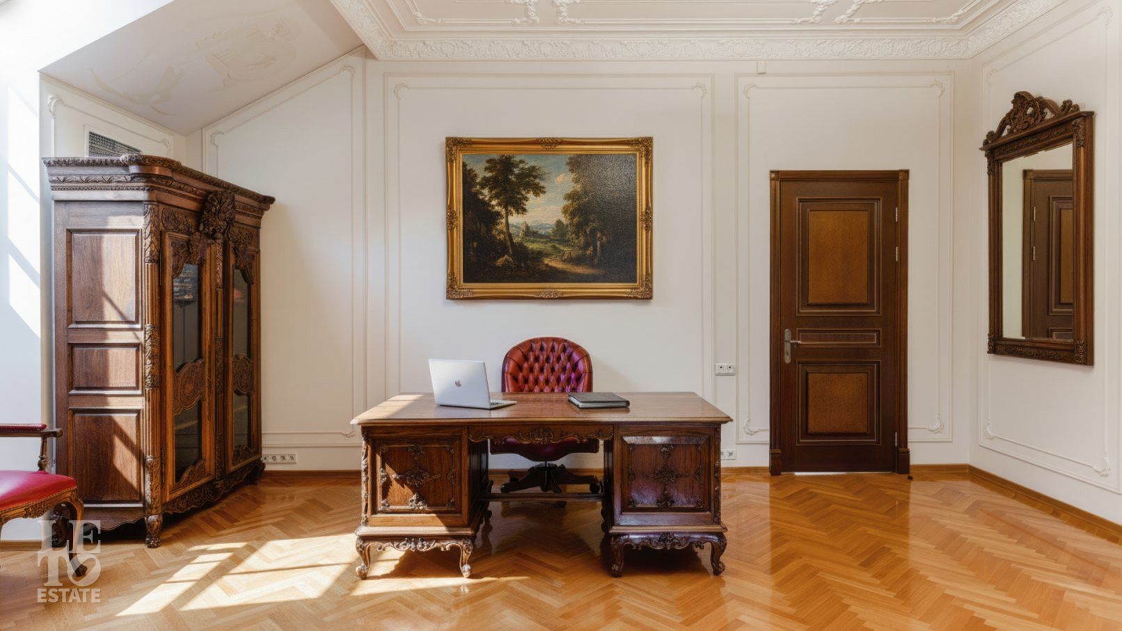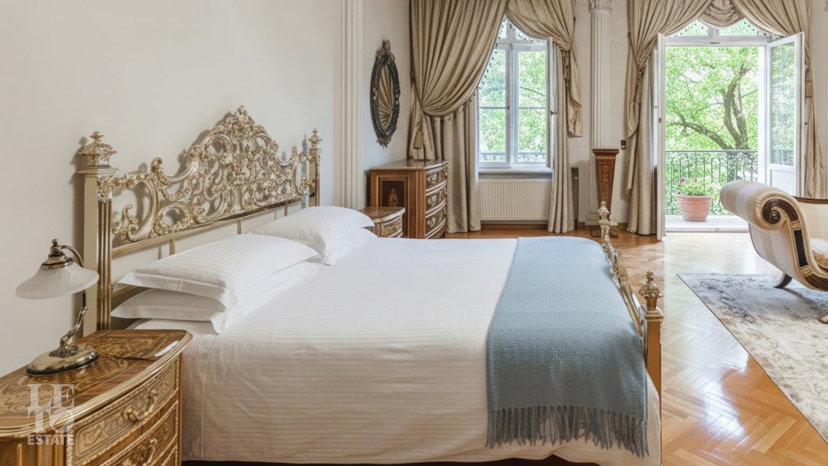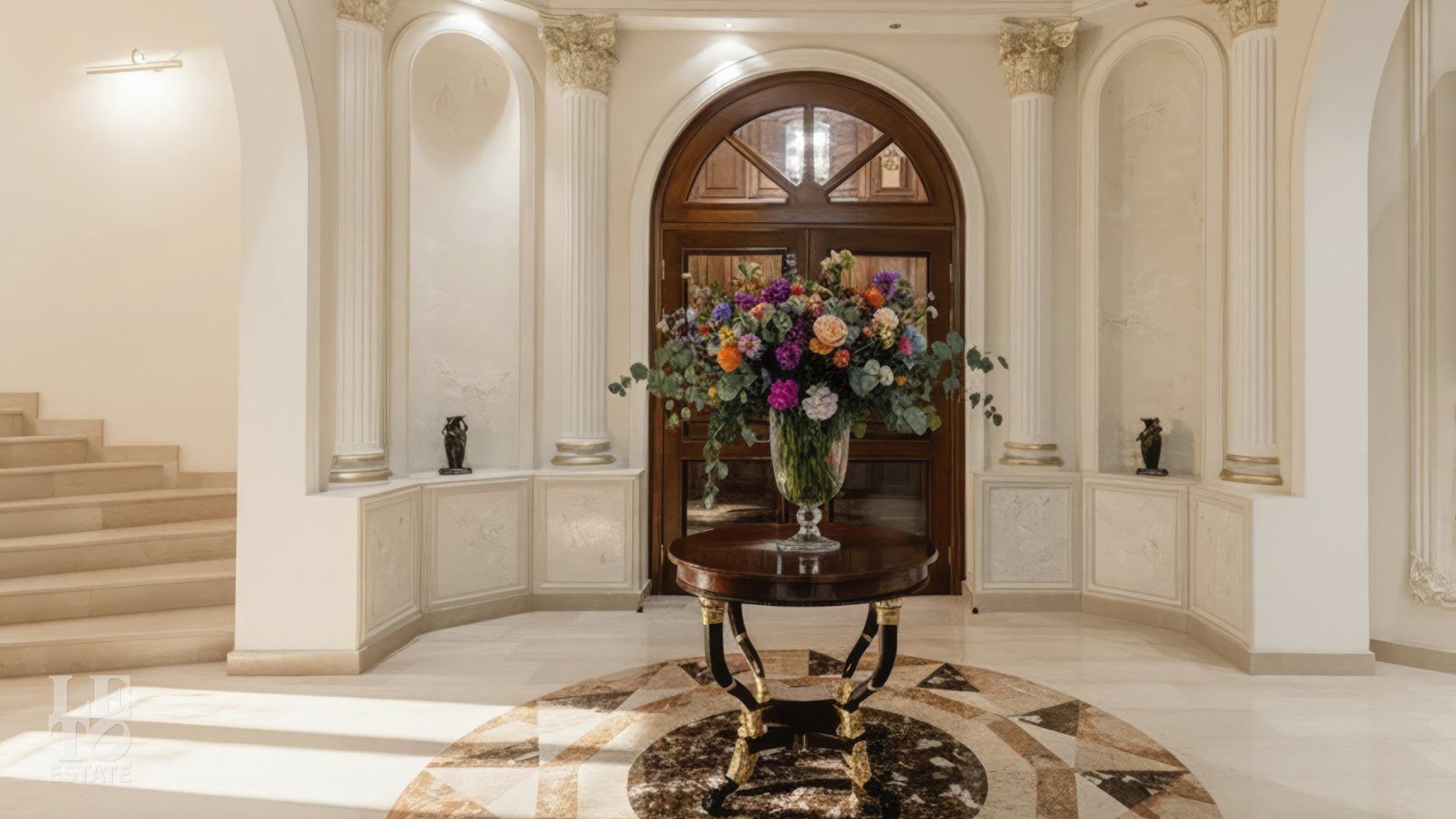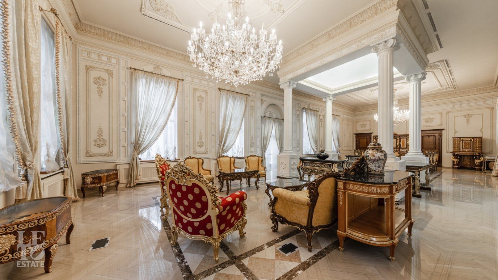 Интерьеры продолжают дворцовый образ, заданный архитектурой — отделка выполнена из благородных материалов, а мебель изготовлена на заказиз натурального дерева и тканей.