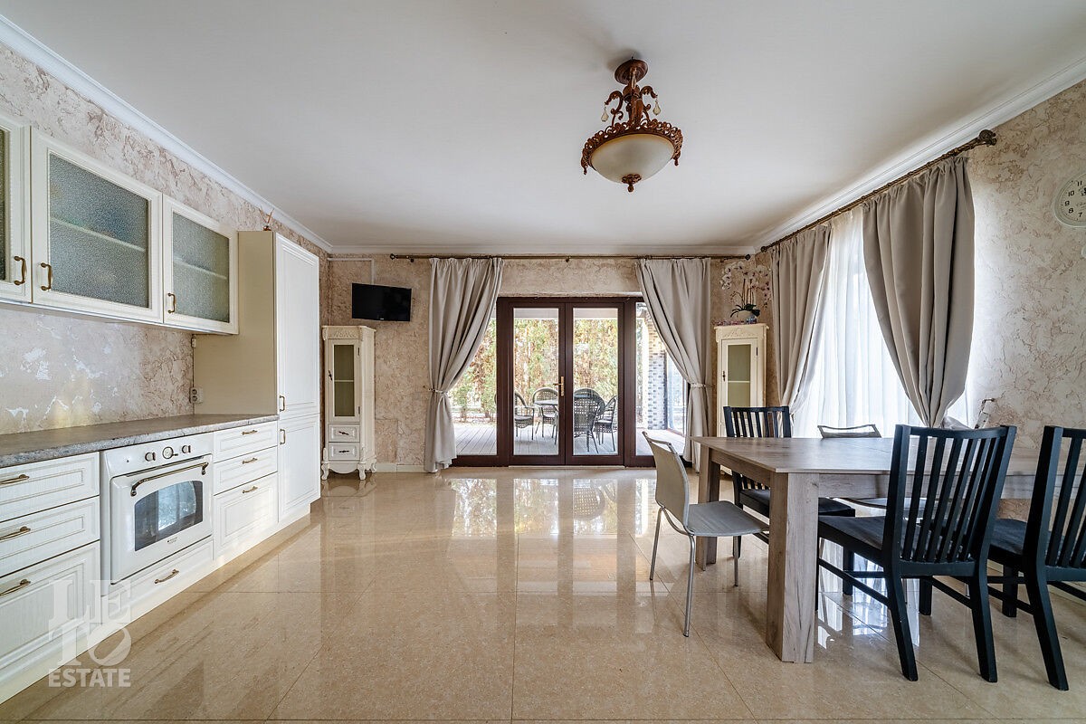 Двухэтажный дом построен в архитектурном стиле «шале», материал стен первого этажа – кирпич, второго – клееный брус. Выполнена внутренняя отделка, продается с мебелью. Дом отапливается газовым котлом. К дому пристроен гараж с отдельным входом в дом, а также зона BBQ. Грамотная посадка дома на земельном участке оставляет достаточное пространство, обеспечивающее комфортный отдых.