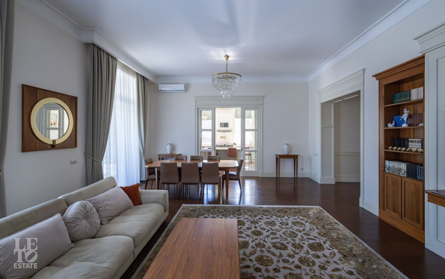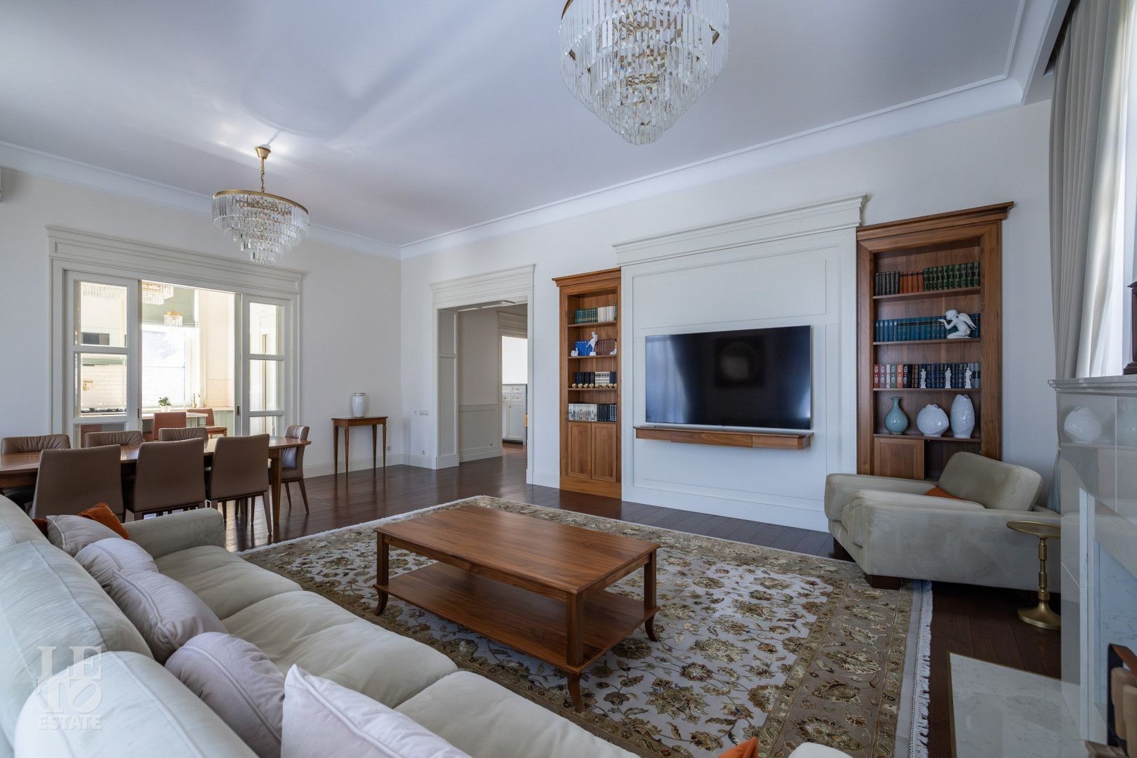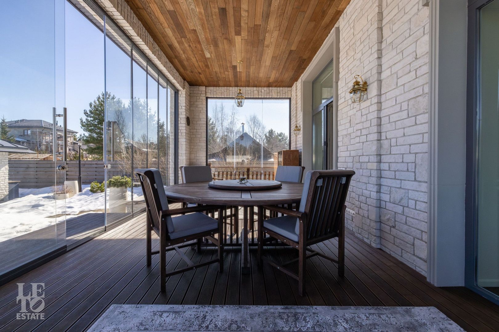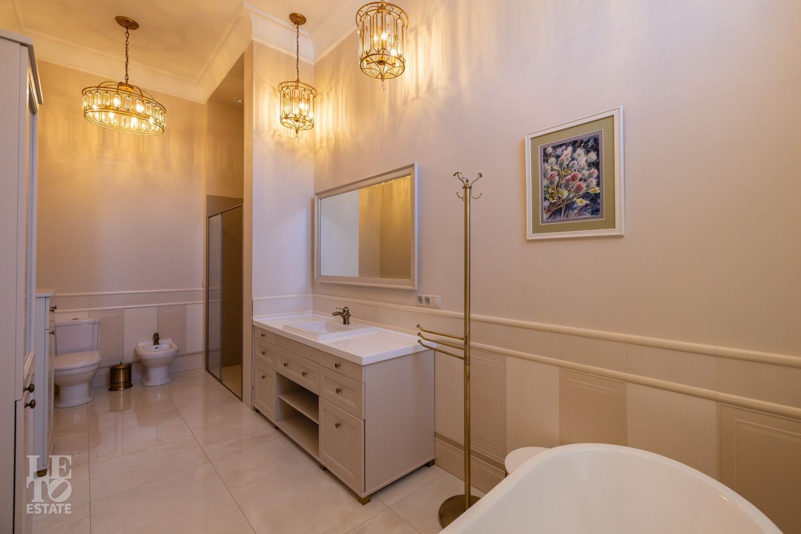 Первый этаж: две мастер спальни с гардеробными и просторными санузлами, кабинет (возможно использовать как спальню), гостевой санузел с душем, гостиная, кухня с выходом на застекленную террасу и комнатой для хранения, гардеробная, постирочная.