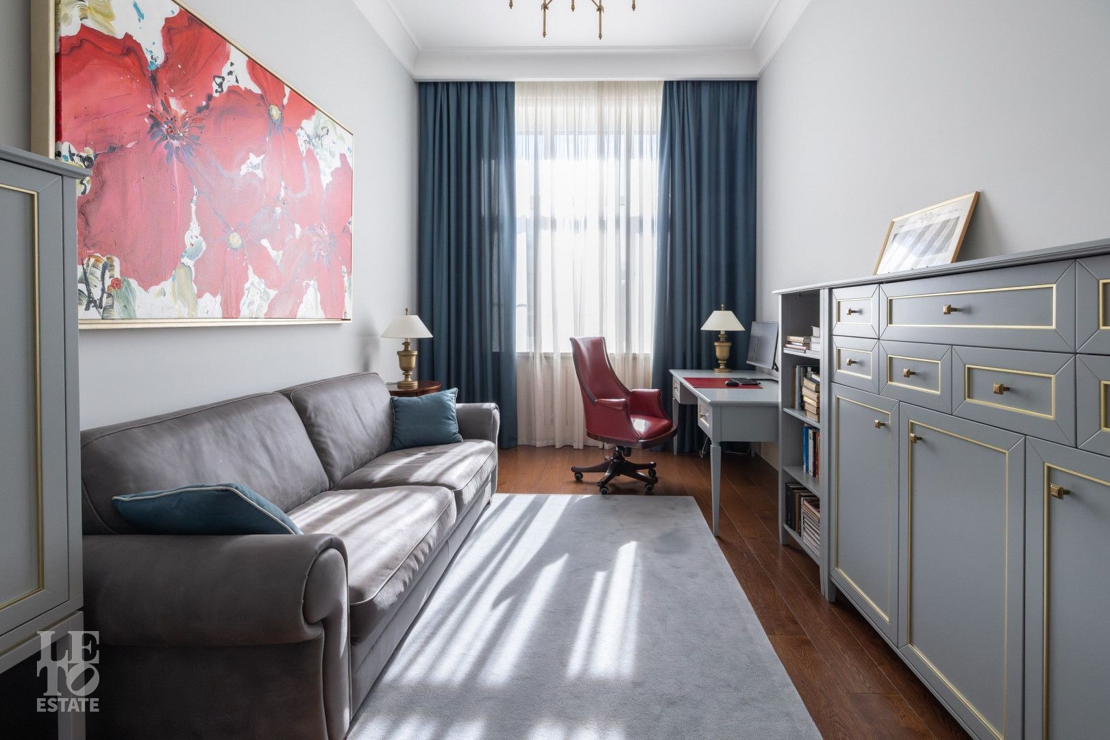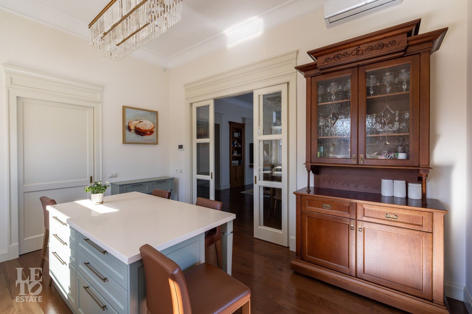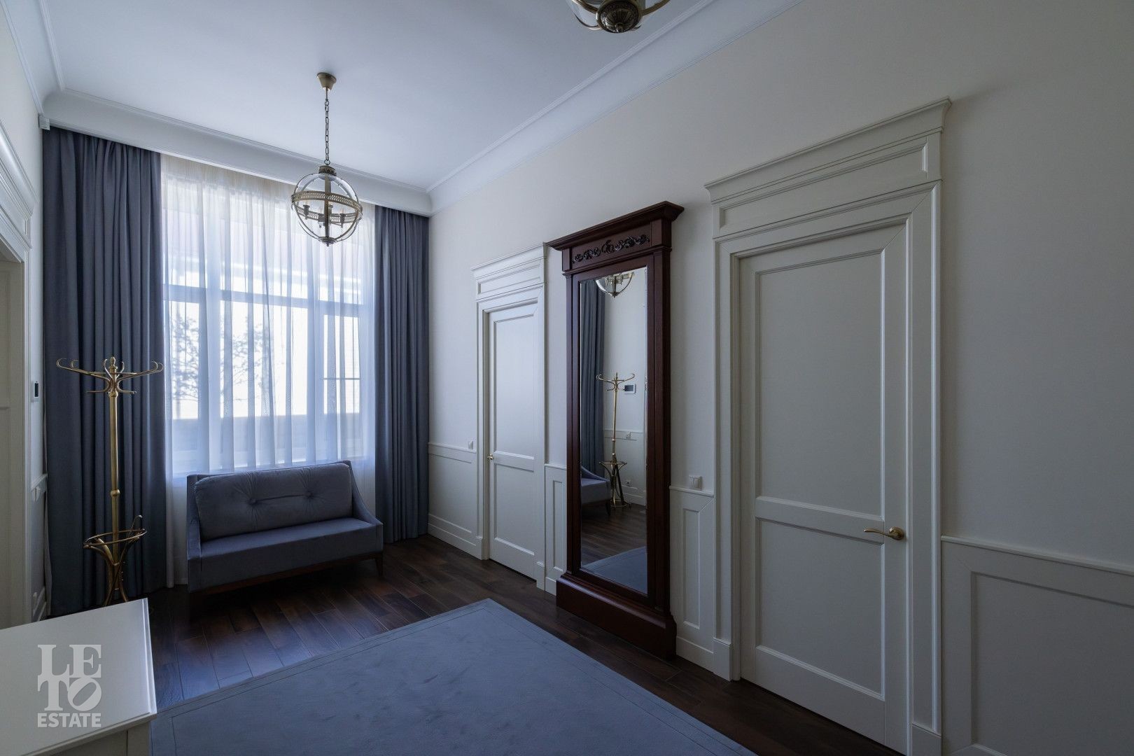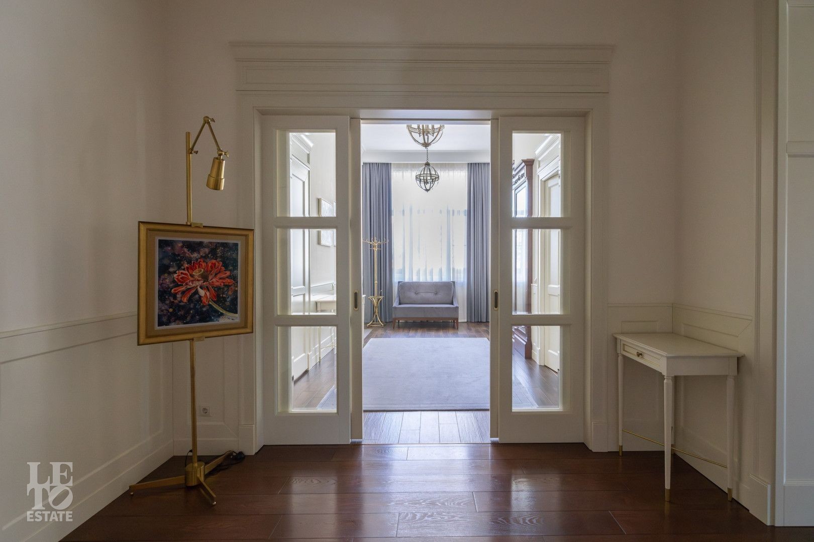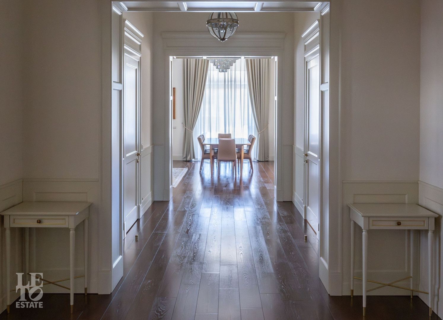 Первый этаж: две мастер спальни с гардеробными и просторными санузлами, кабинет (возможно использовать как спальню), гостевой санузел с душем, гостиная, кухня с выходом на застекленную террасу и комнатой для хранения, гардеробная, постирочная.