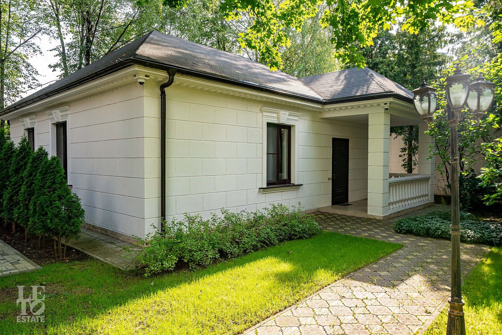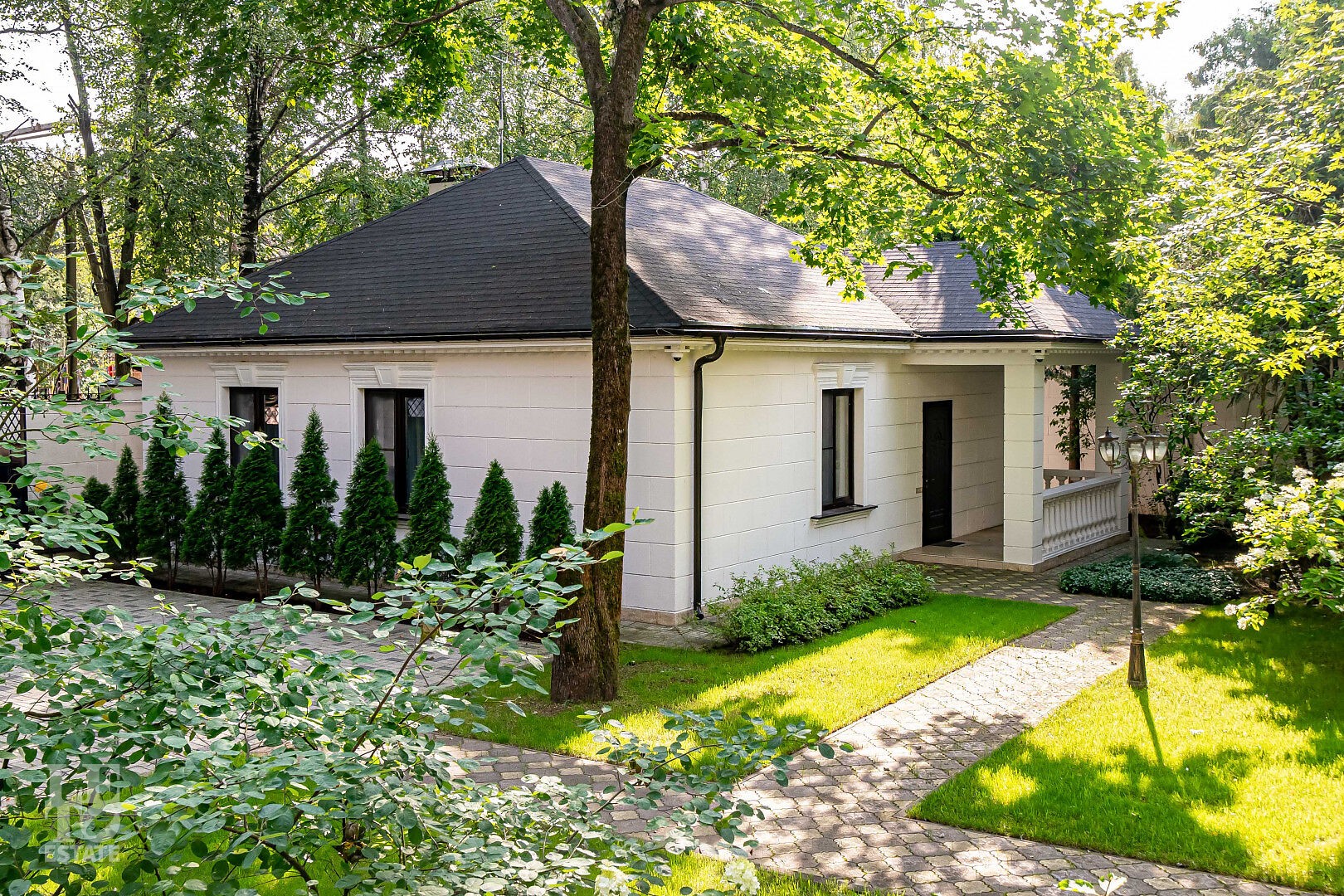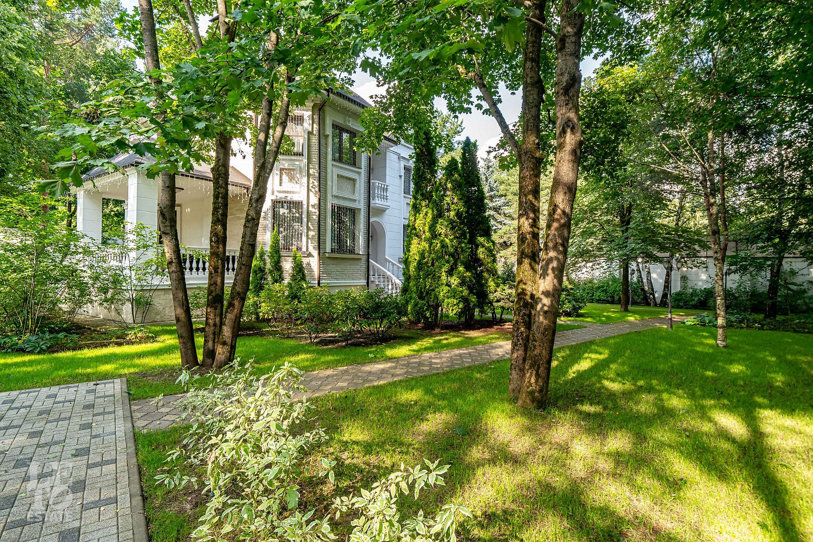 На просторном лесном участке правильной формы расположены 3 строения: основной дом, гостевой дом с помещением для персонала и барбекю-беседка - идеальное место для семейных праздников и отдыха с друзьями.