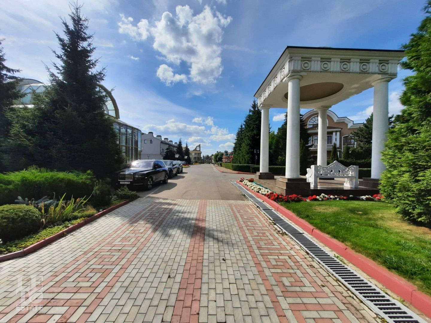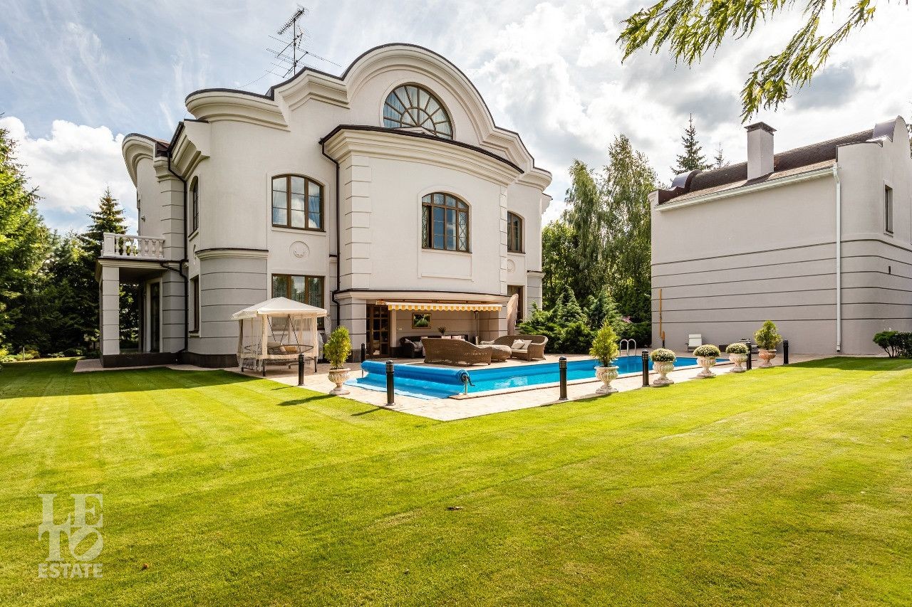 Участок площадью 19 соток прямоугольной формы. На участке проведены ландшафтные работы, по периметру растут ели и сосны, есть зона отдыха с уличным бассейном (длина – 12м) и патио с маркизой. В поселке есть все центральные коммуникации (электричество, водоснабжение, канализация, газ).