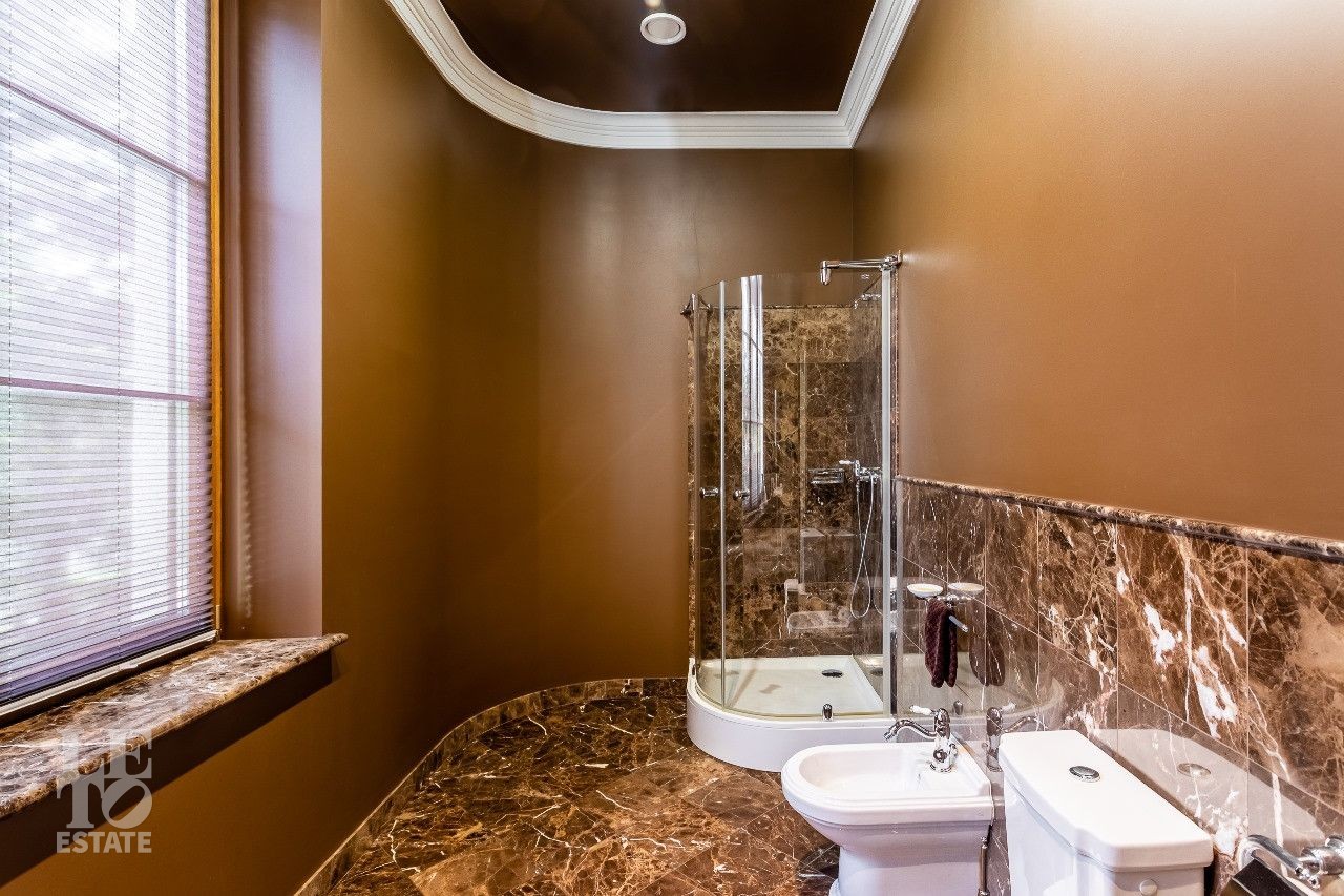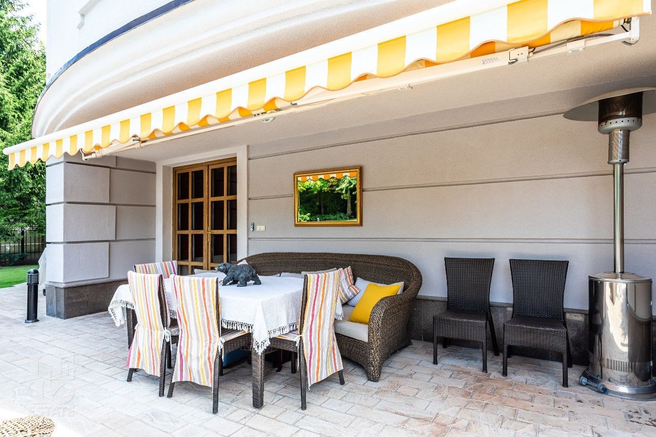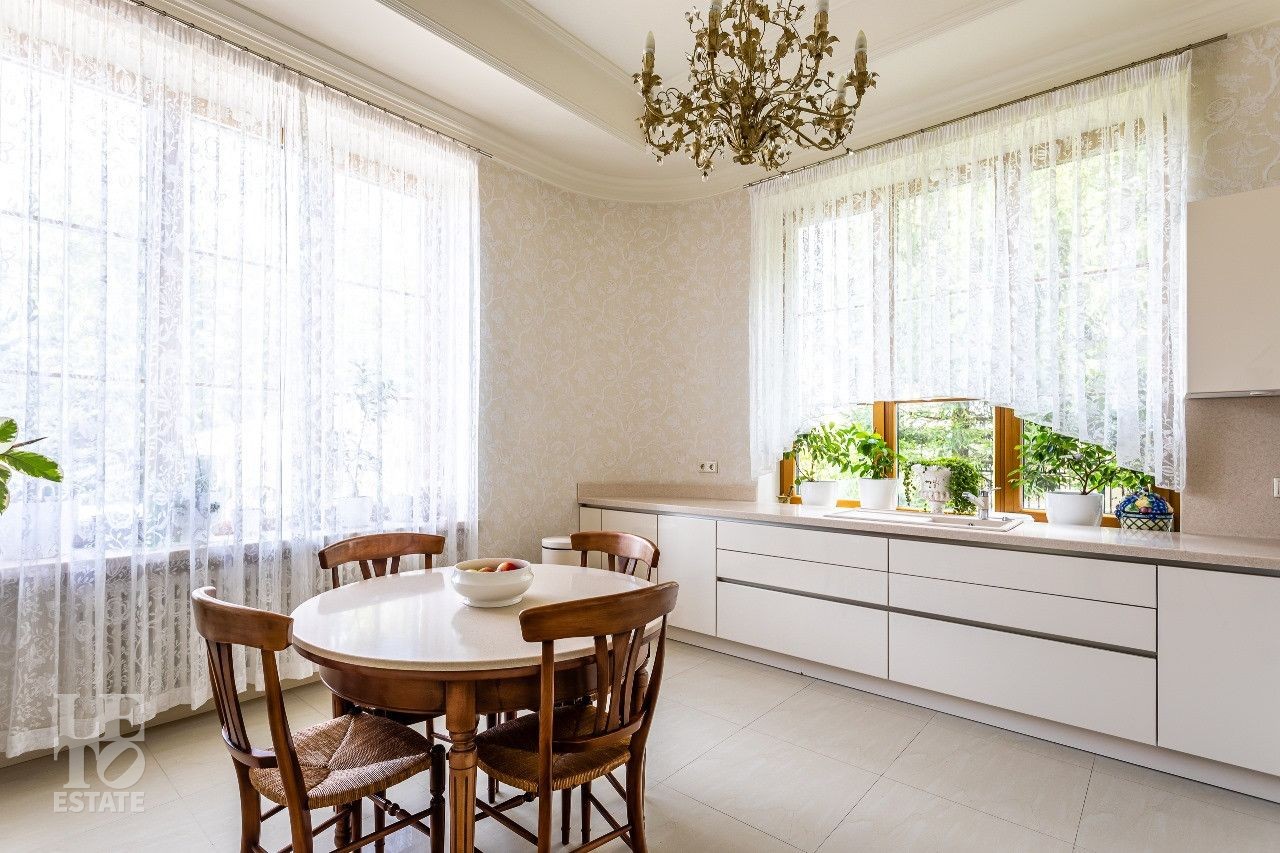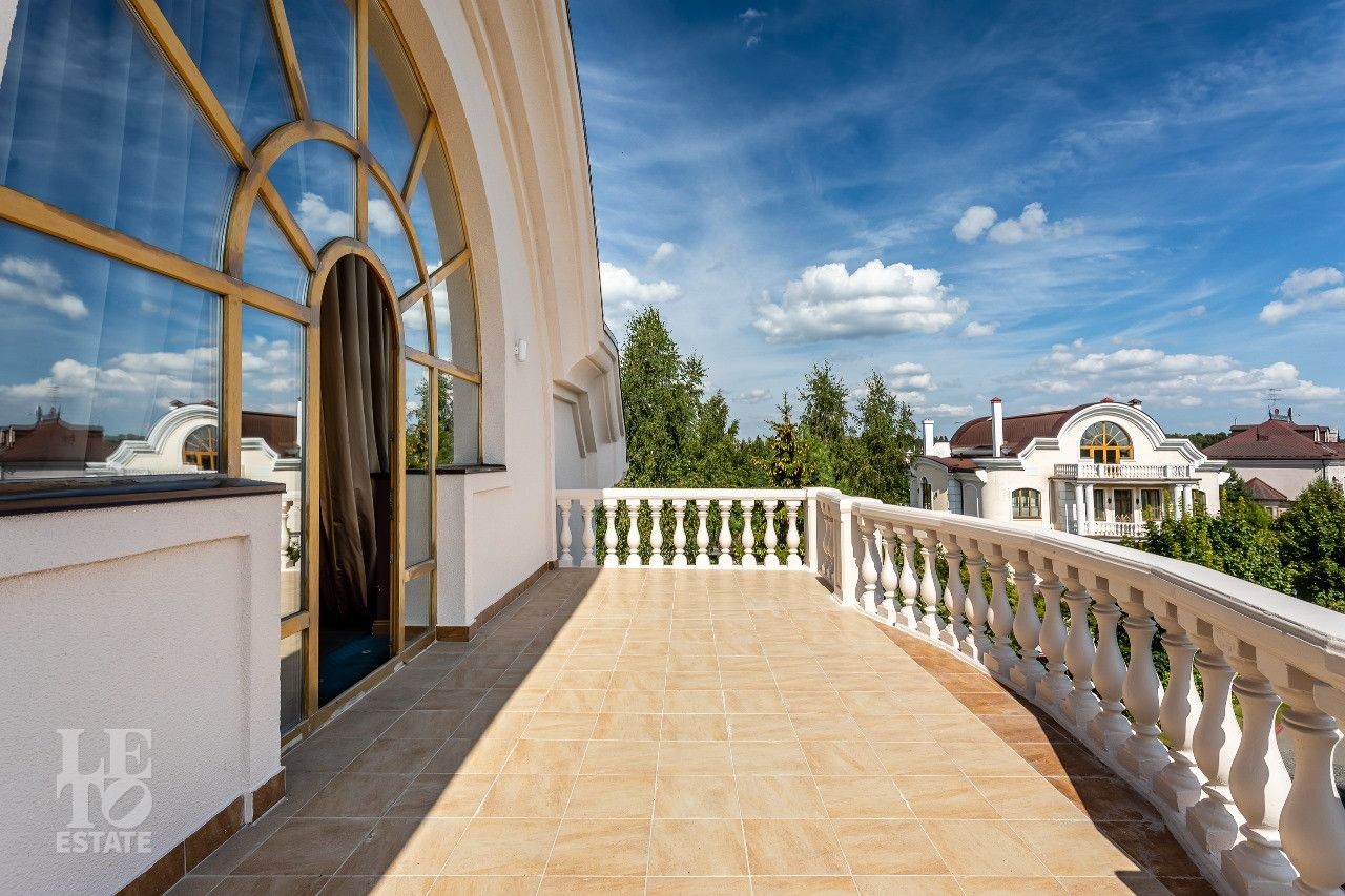 Дом построен в классическом стиле. Фасад дома украшен барельефами, рустами, входная группа выделена колоннами, на балконах использованы балюстрады. Выполнена фасадная шпаклевка. В доме установлено два котла Buderus, установлена система водоочистки, предусмотрена приточно-вытяжная вентиляция и система пожарной сигнализации. Отделка выполнена с использованием элементов из дерева и натурального камня. В каждой спальне предусмотрен индивидуальный санузел. Мансардный этаж отведен под зону отдыха с бильярдной. Лифтовая кабина и шахта – стеклянные. Лифт поднимается до третьего этажа.