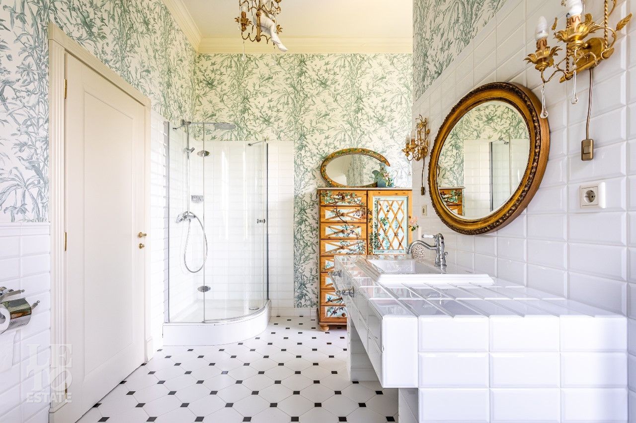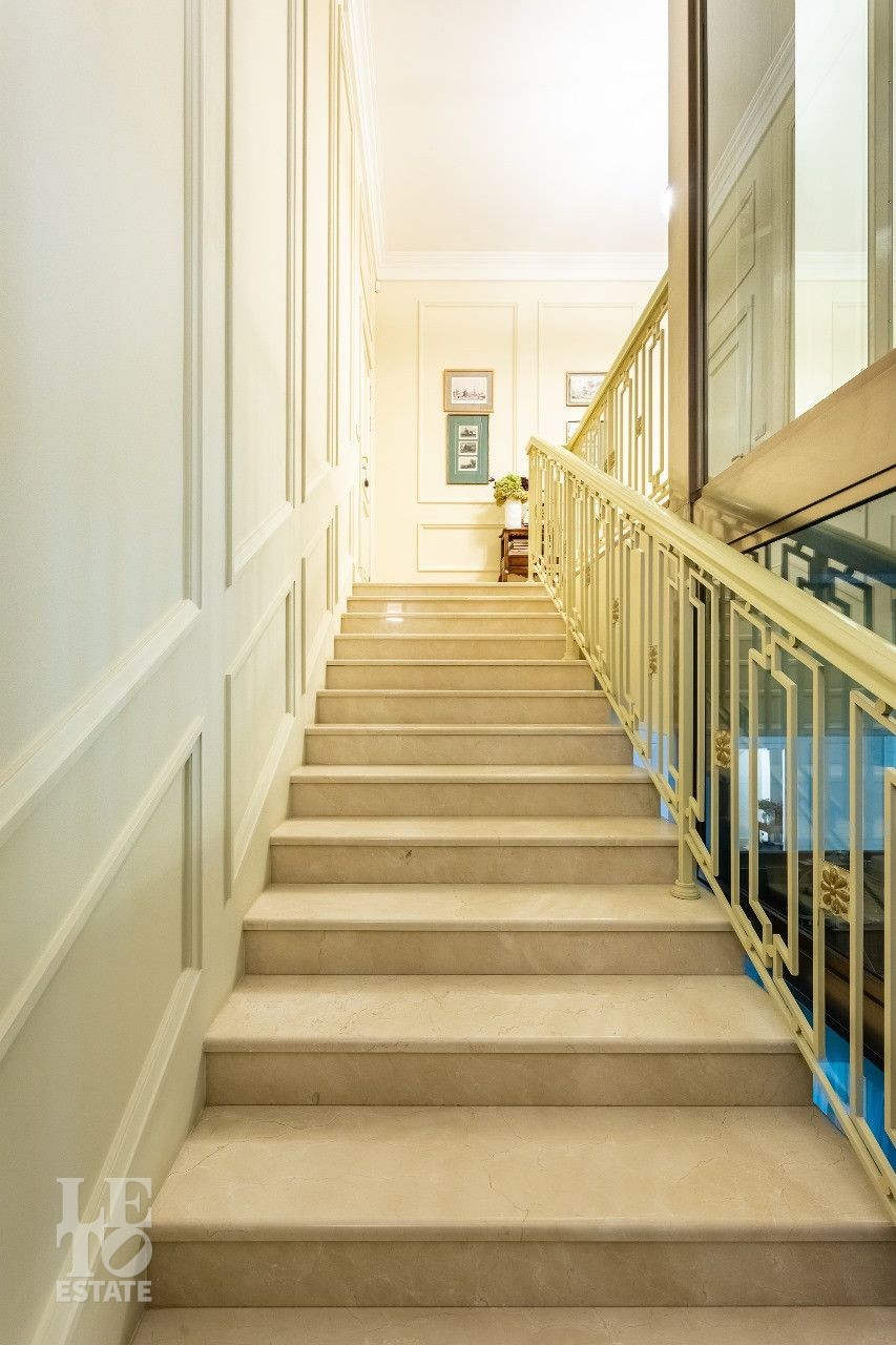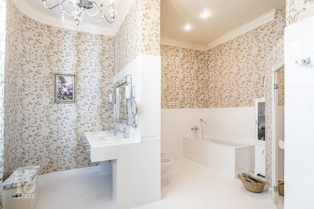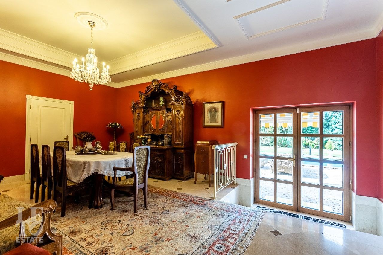 Дом построен в классическом стиле. Фасад дома украшен барельефами, рустами, входная группа выделена колоннами, на балконах использованы балюстрады. Выполнена фасадная шпаклевка. В доме установлено два котла Buderus, установлена система водоочистки, предусмотрена приточно-вытяжная вентиляция и система пожарной сигнализации. Отделка выполнена с использованием элементов из дерева и натурального камня. В каждой спальне предусмотрен индивидуальный санузел. Мансардный этаж отведен под зону отдыха с бильярдной. Лифтовая кабина и шахта – стеклянные. Лифт поднимается до третьего этажа.