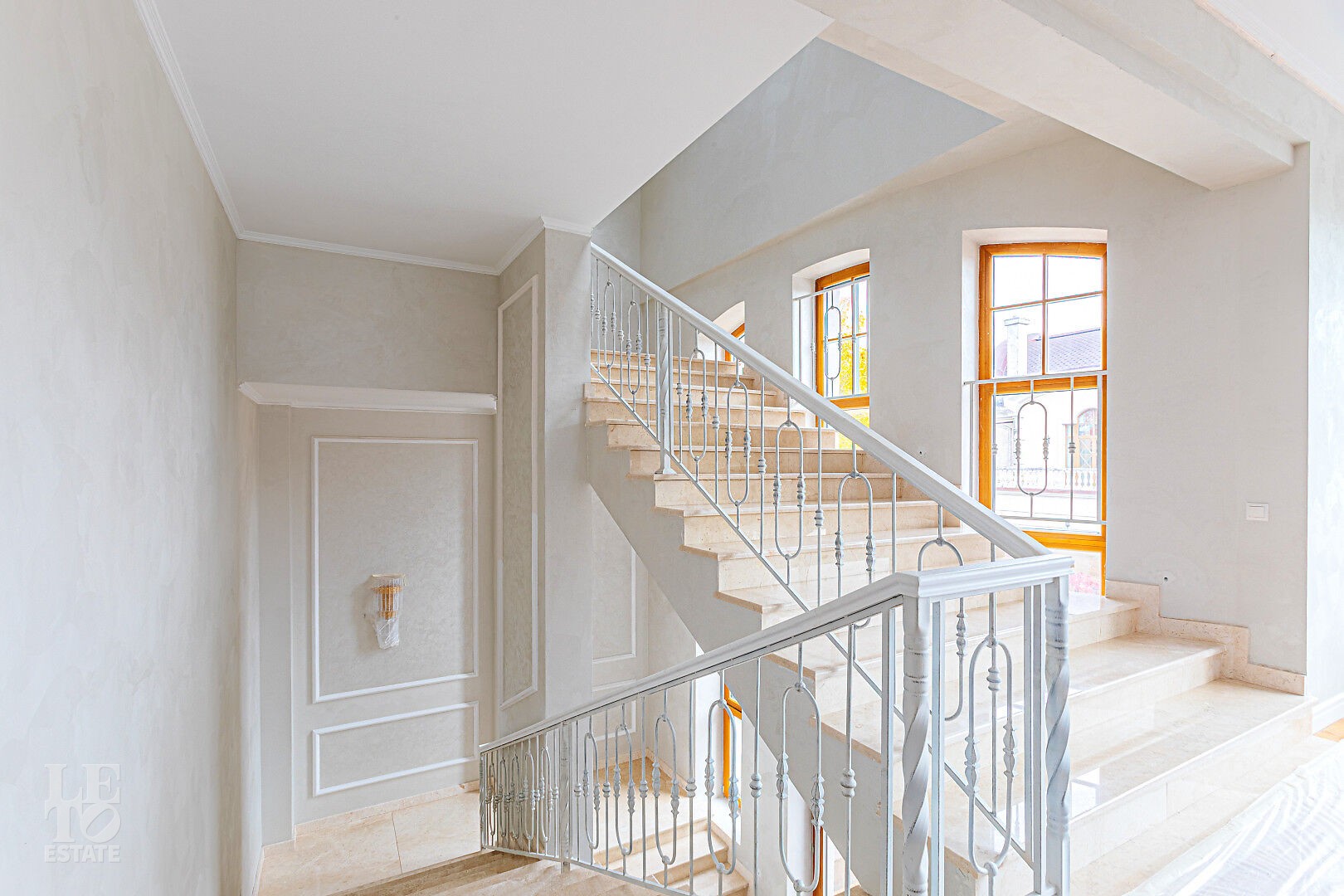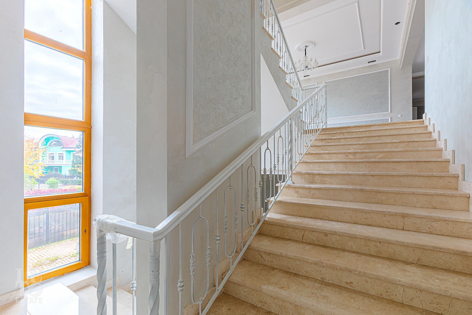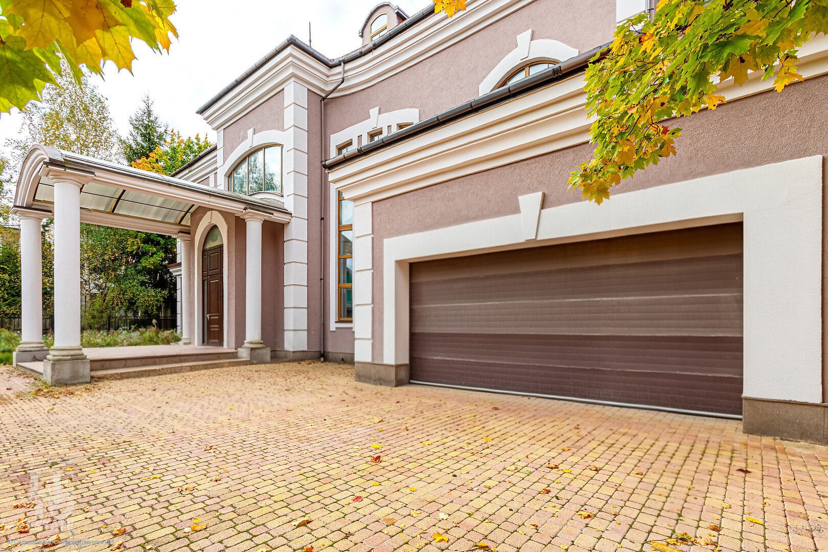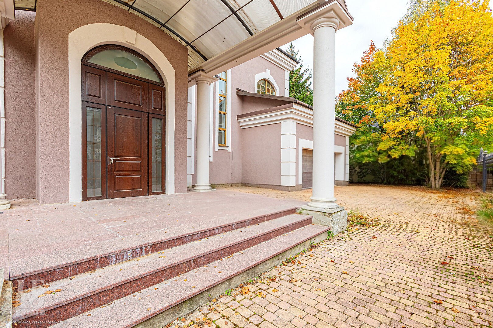 Дом построен в классическом стиле. Фасад дома украшен барельефами, входная группа выделена колоннами и красивым крыльцом с лестницей. Выполнена фасадная шпатлевка. В доме предусмотрена приточно-вытяжная вентиляция. Отделка выполнена с использованием элементов из дерева, мрамора и ковки. Украшением дома служит прекрасная мраморная лестница с коваными ограждениями и перилами из массива дуба. Высота потолков в комнатах 3,5 м. На полу – наборный паркет из дуба. На всем первом этаже сделан теплый пол, на втором этаже – только в санузлах.