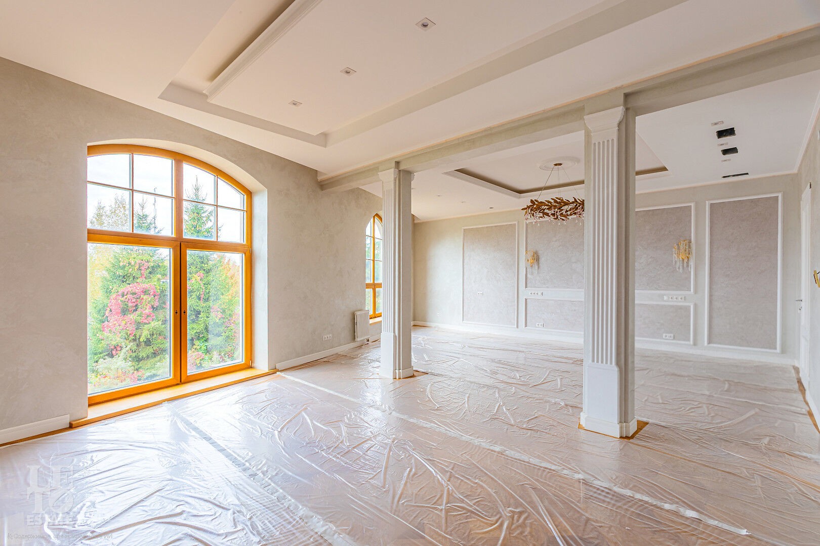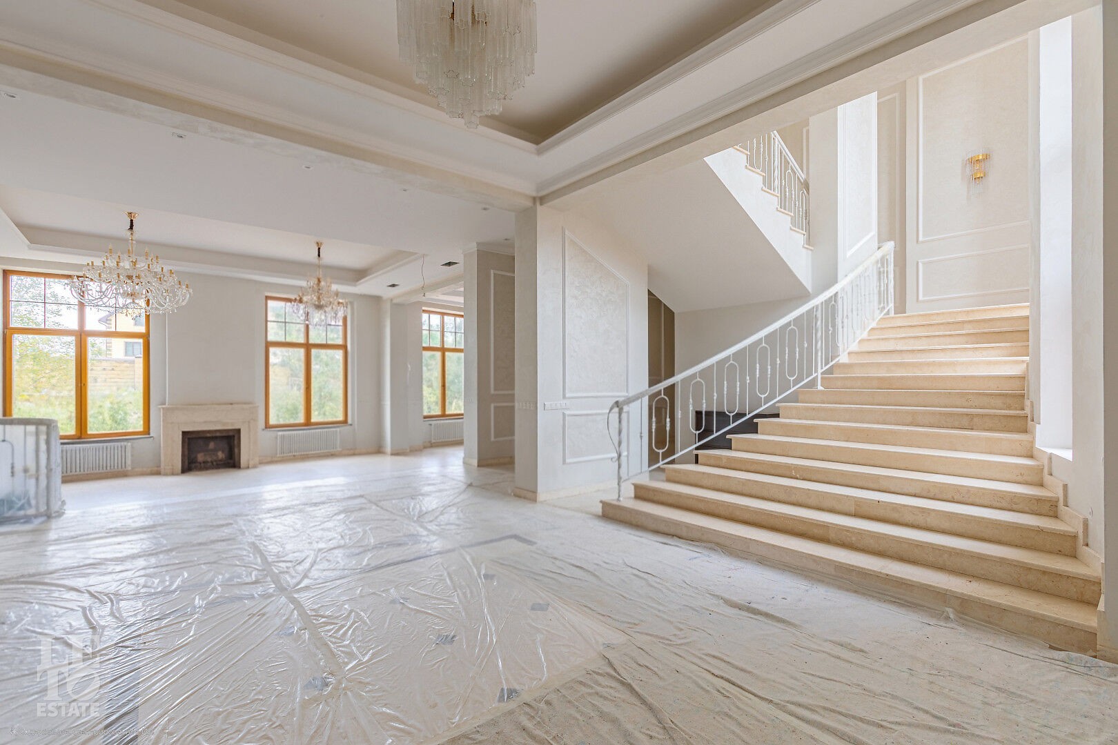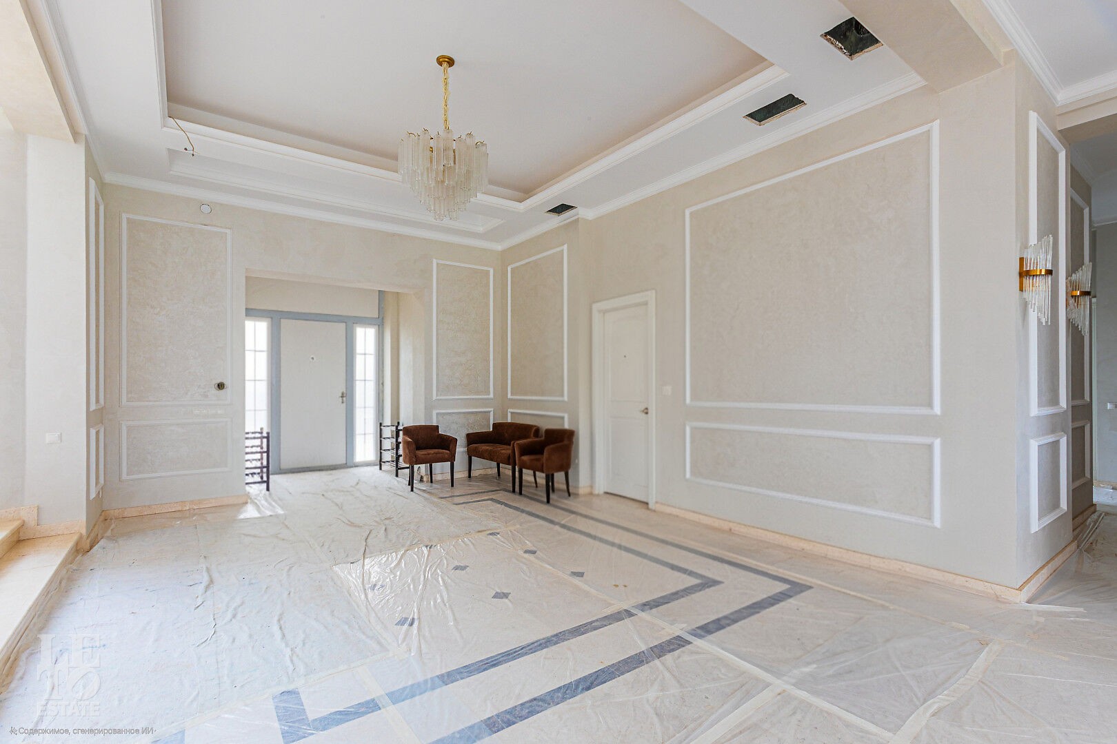 Дом построен в классическом стиле. Фасад дома украшен барельефами, входная группа выделена колоннами и красивым крыльцом с лестницей. Выполнена фасадная шпатлевка. В доме предусмотрена приточно-вытяжная вентиляция. Отделка выполнена с использованием элементов из дерева, мрамора и ковки. Украшением дома служит прекрасная мраморная лестница с коваными ограждениями и перилами из массива дуба. Высота потолков в комнатах 3,5 м. На полу – наборный паркет из дуба. На всем первом этаже сделан теплый пол, на втором этаже – только в санузлах.