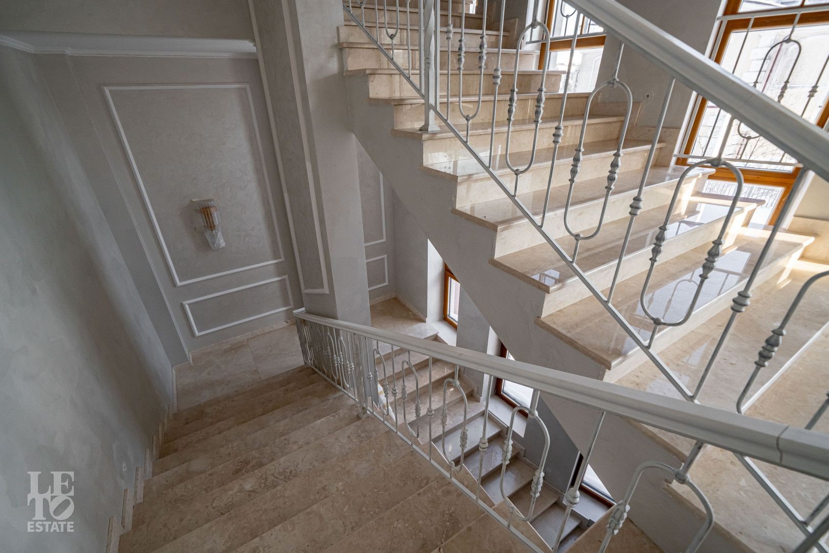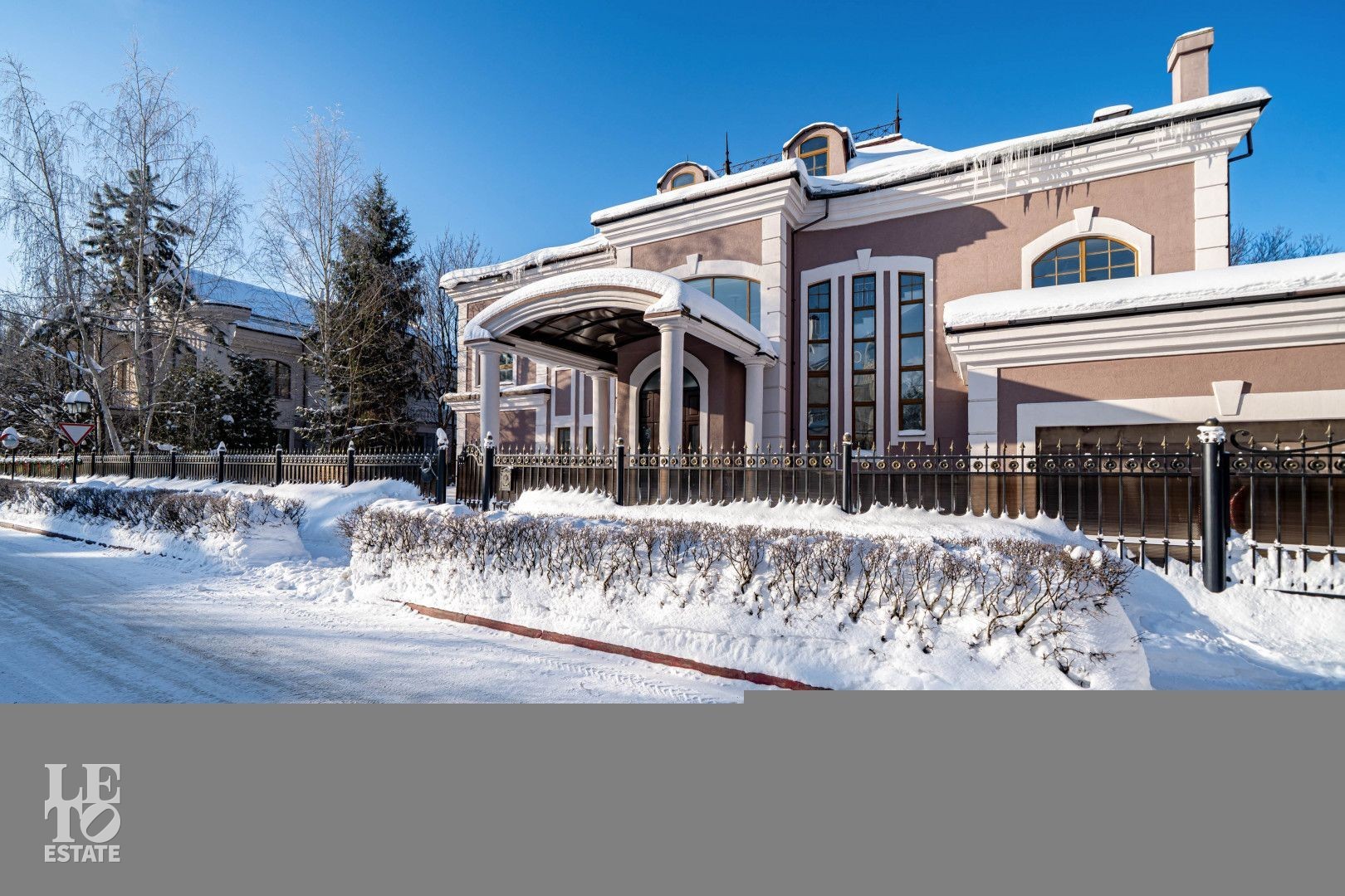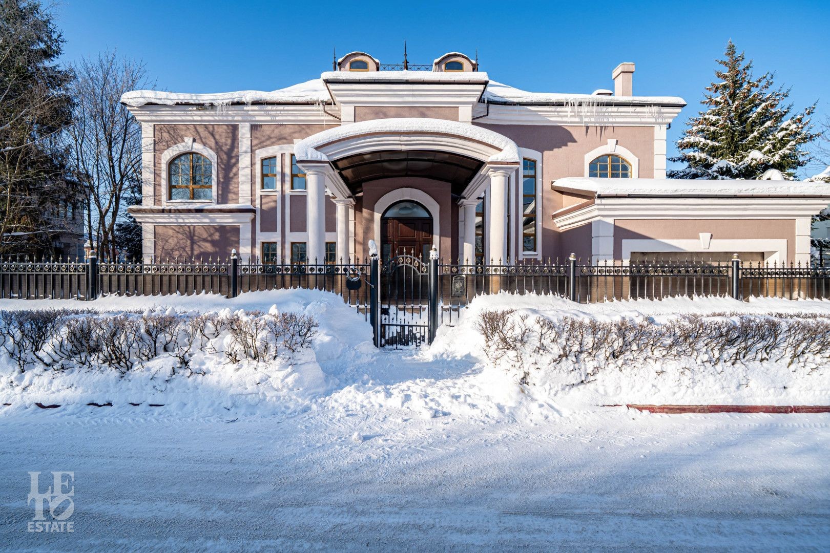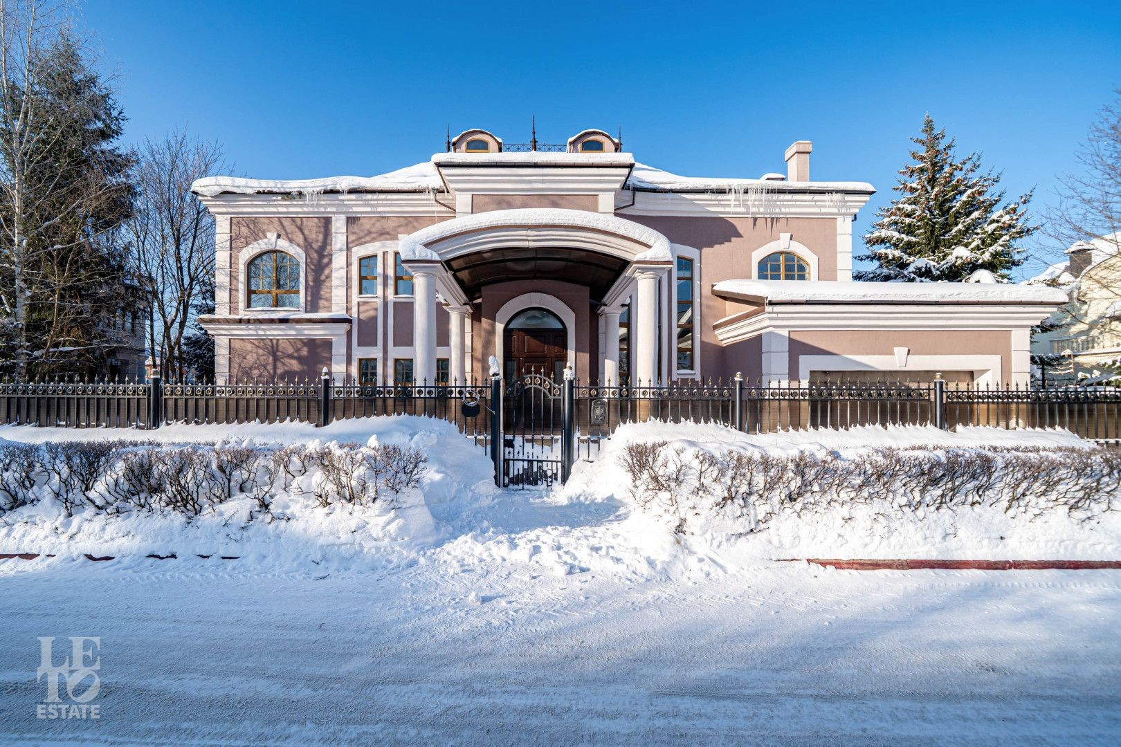 Дом выполнен в классическом стиле, создавая ощущение прочности и элегантности. Элементы барельефов, арочные окна и изысканная колоннада придают фасаду неповторимый стиль. Интерьеры выполнены с акцентом на натуральные материалы: дуб, мрамор и ковка. Центральным элементом является мраморная лестница с коваными ограждениями и дубовыми перилами. Высота потолков составляет 3,5 м, что создаёт ощущение лёгкости и простора. Наборный дубовый паркет на полу подчеркивает атмосферу уюта и тепла. На первом этаже предусмотрен тёплый пол, на втором этаже – в санузлах. Установлена приточно-вытяжная вентиляция.