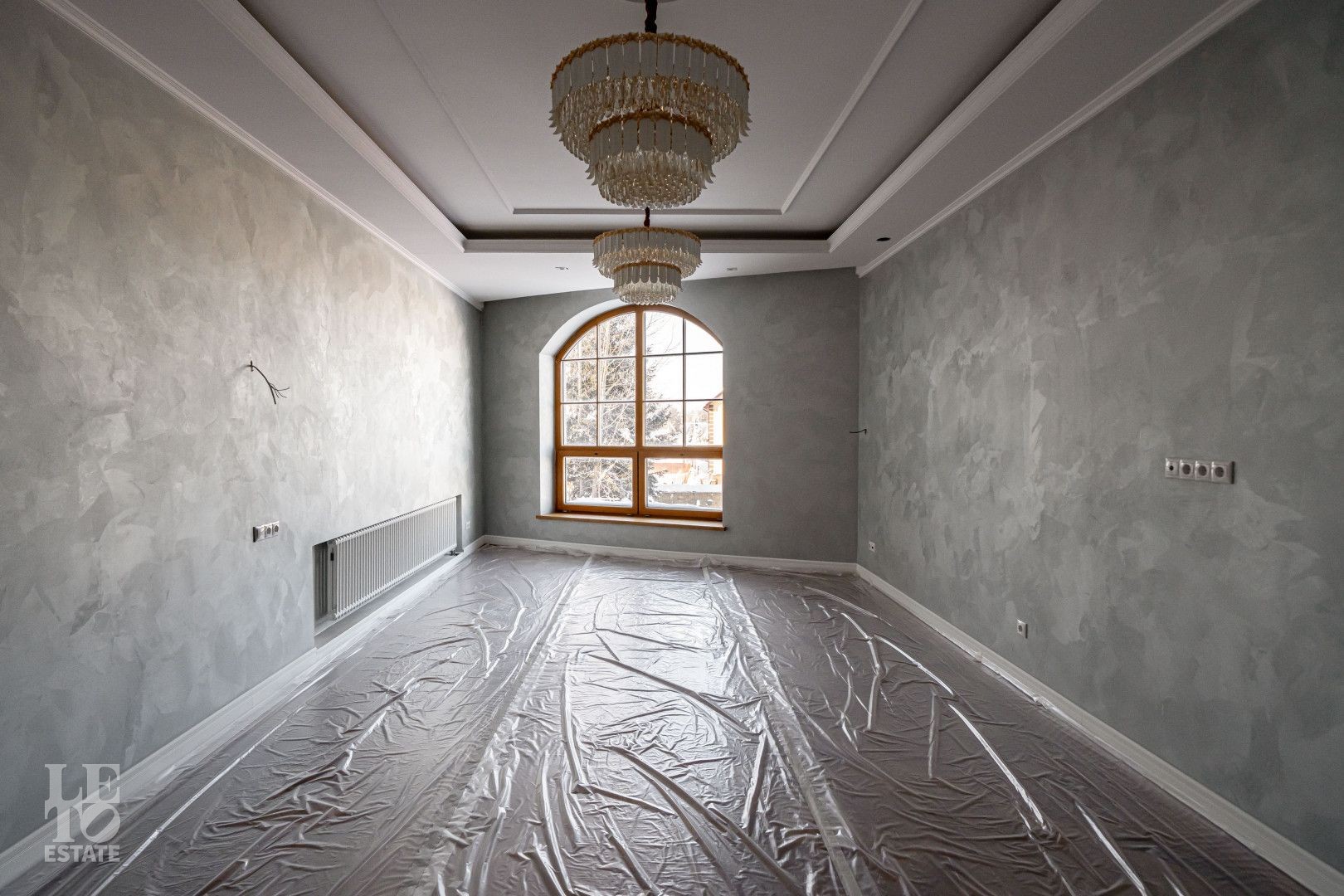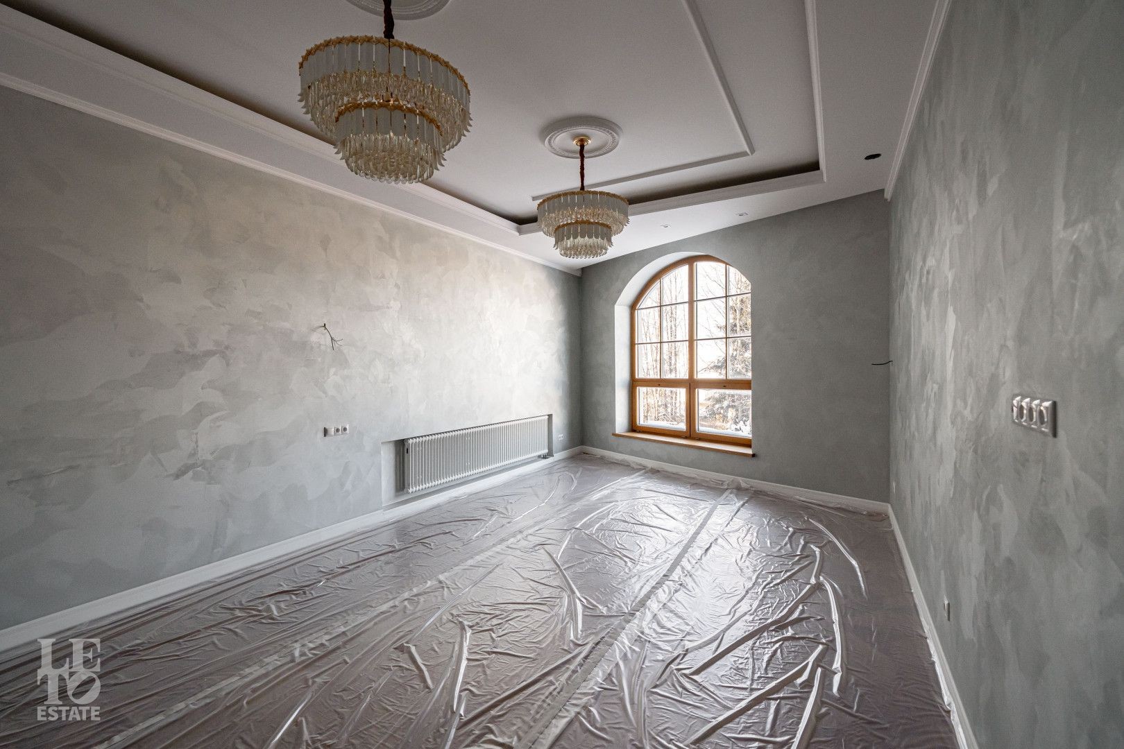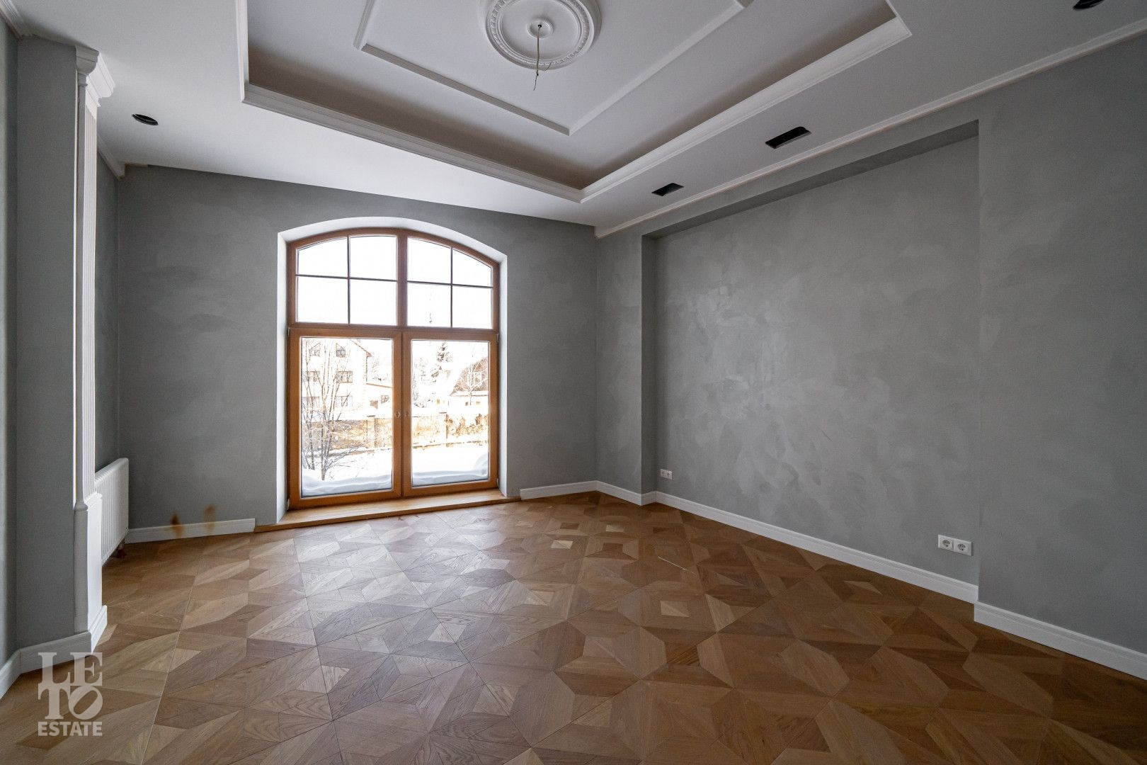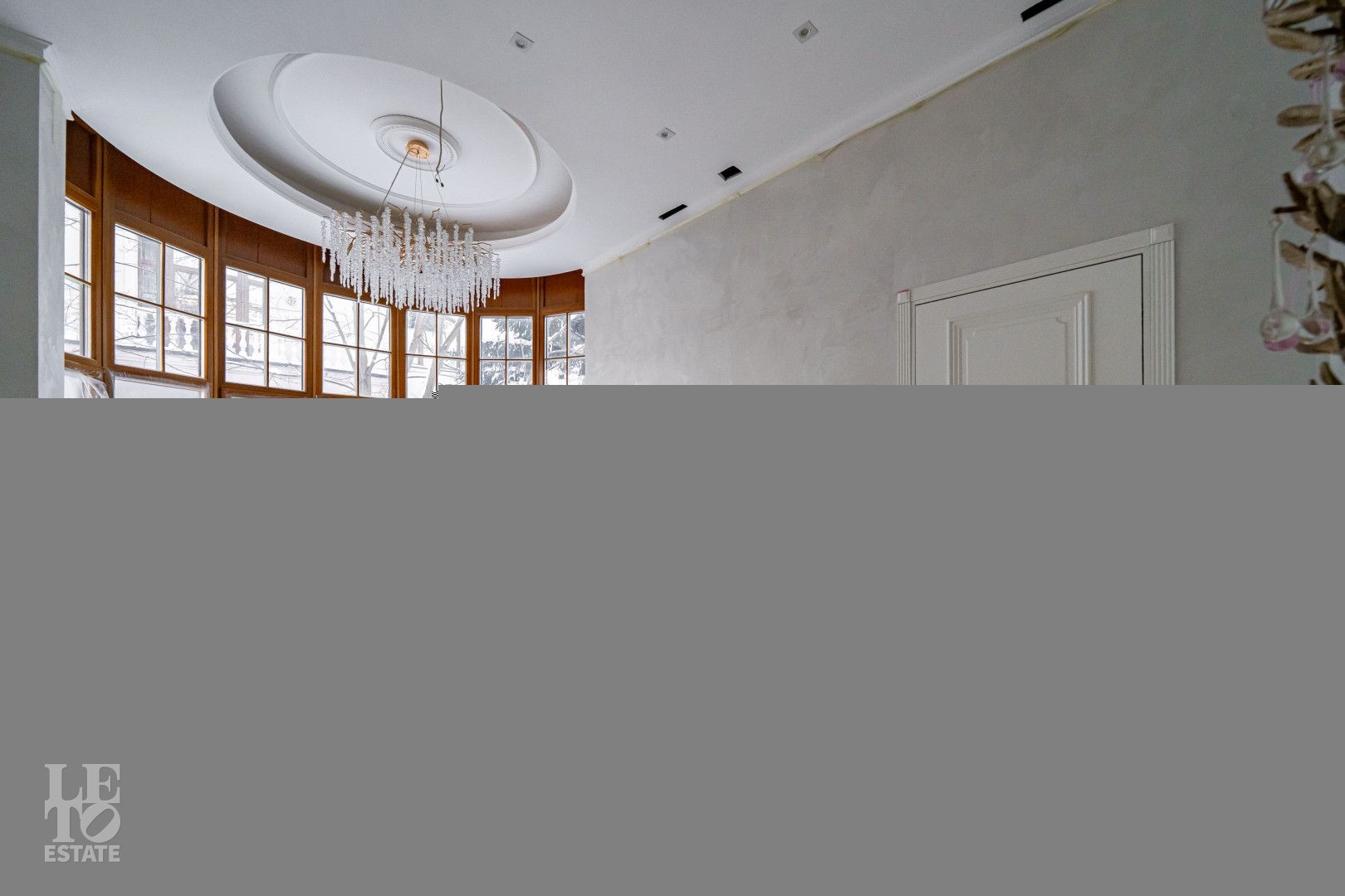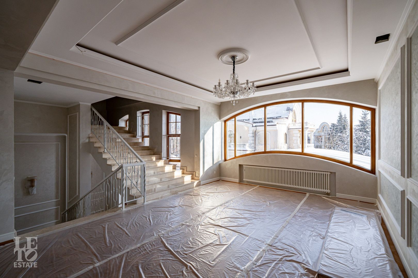 Дом выполнен в классическом стиле, создавая ощущение прочности и элегантности. Элементы барельефов, арочные окна и изысканная колоннада придают фасаду неповторимый стиль. Интерьеры выполнены с акцентом на натуральные материалы: дуб, мрамор и ковка. Центральным элементом является мраморная лестница с коваными ограждениями и дубовыми перилами. Высота потолков составляет 3,5 м, что создаёт ощущение лёгкости и простора. Наборный дубовый паркет на полу подчеркивает атмосферу уюта и тепла. На первом этаже предусмотрен тёплый пол, на втором этаже – в санузлах. Установлена приточно-вытяжная вентиляция.